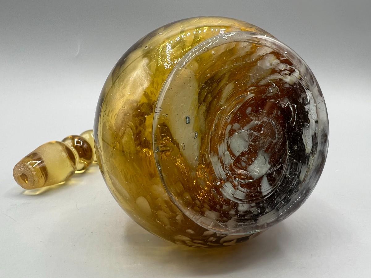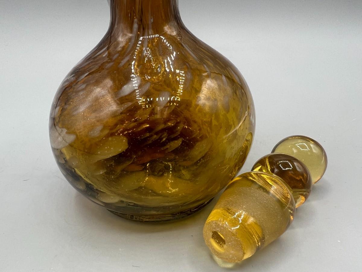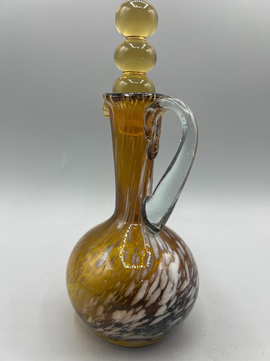 There is no significant cracks or chips to the glass cruet bottle and is in good collectible and useable condition. Check pictures for more details and for sizing,