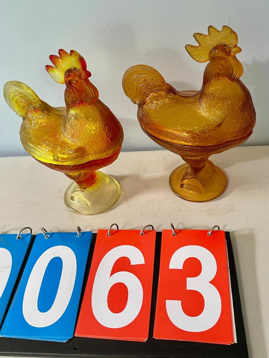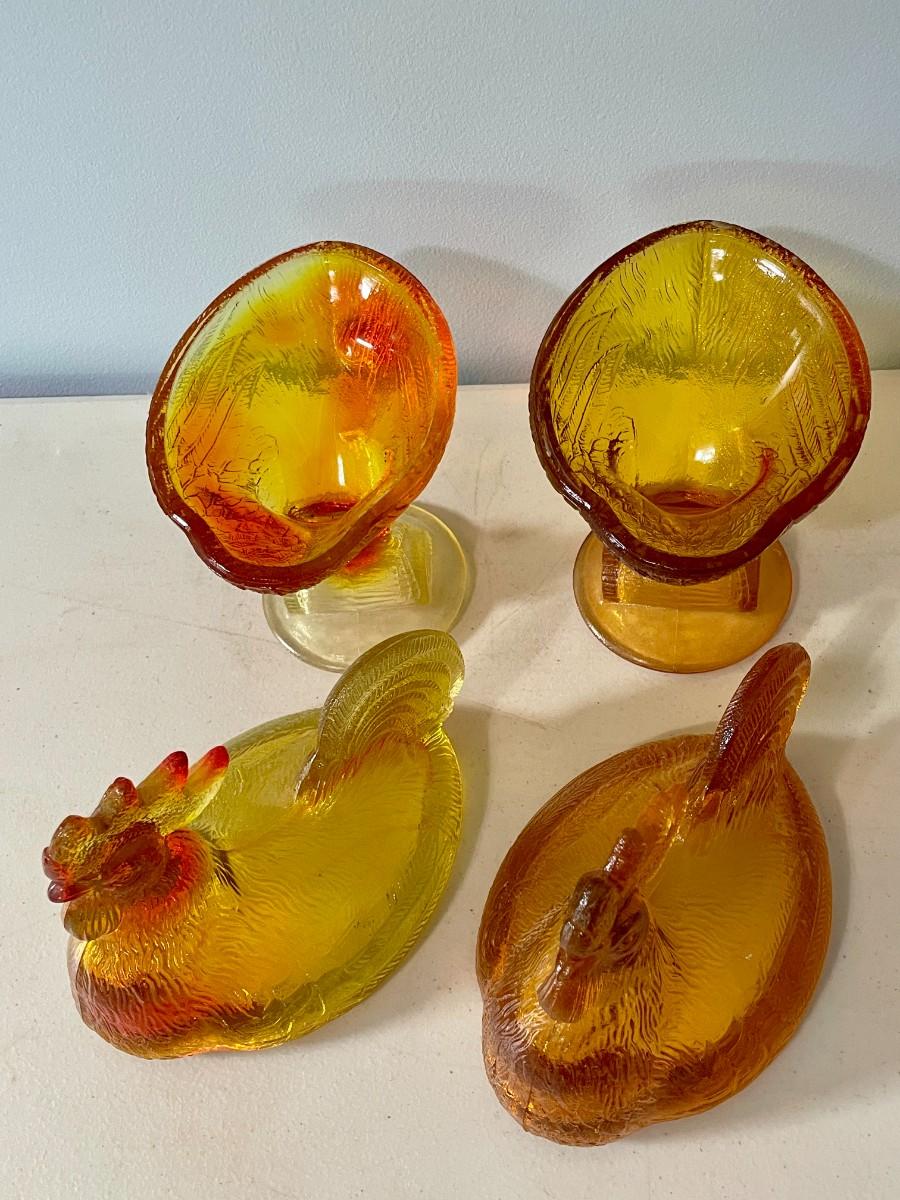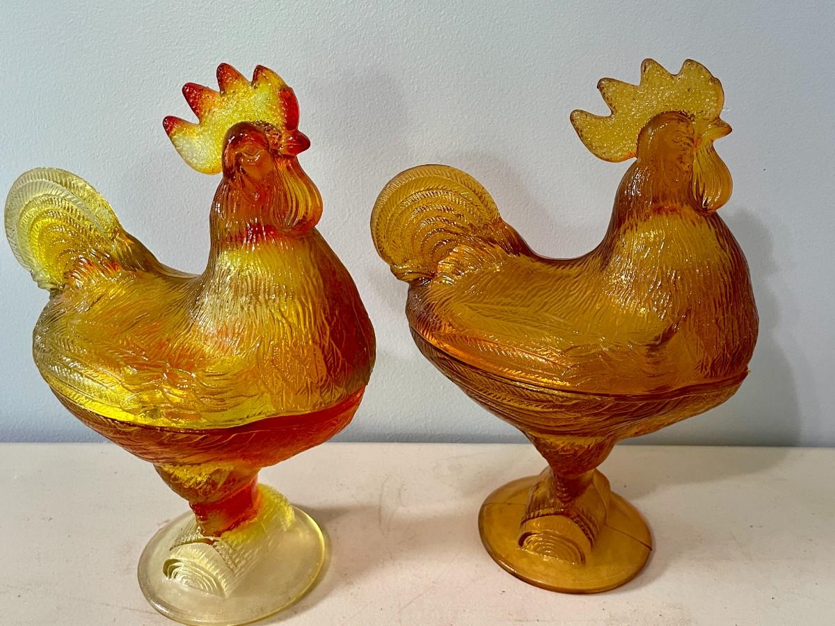 Vintage Amberina & Amber glass rooster candy/nut dishes
