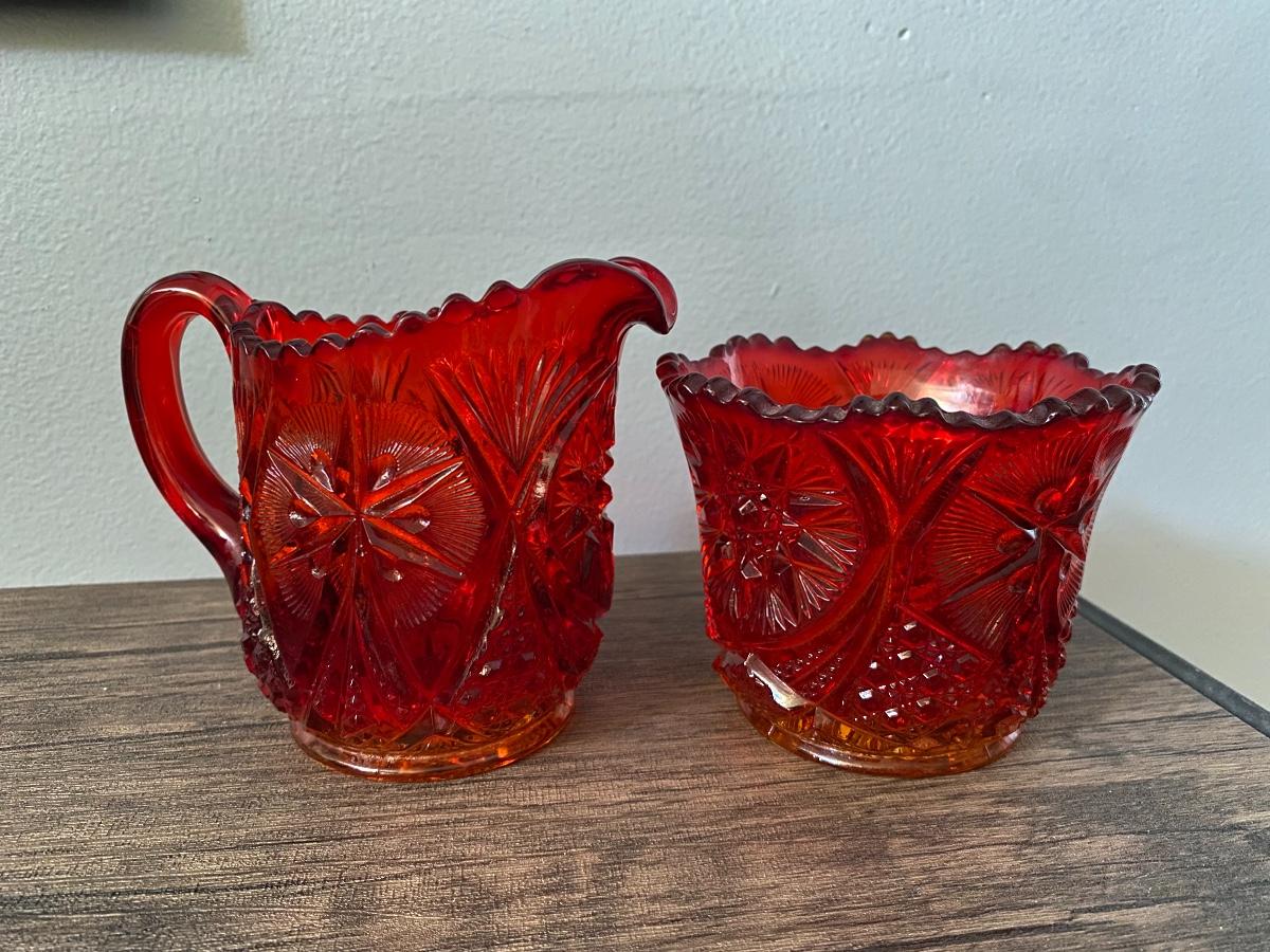 Vintage depression glass cream and sugar set in brilliant flame red amberina. Star cut pattern with saw tooth edge. Thick glass. Open sugar bowl. About 5" size. Good condition, no chips.