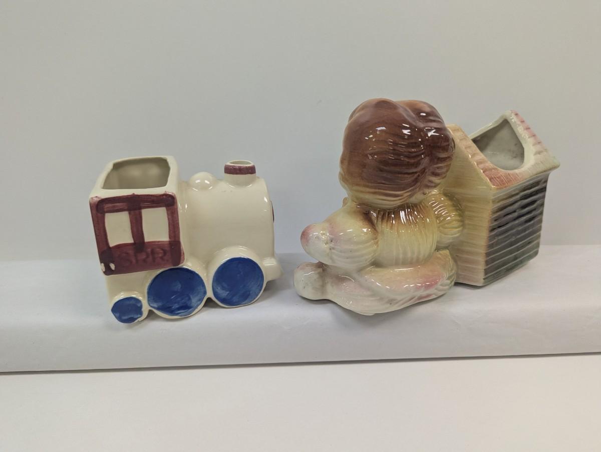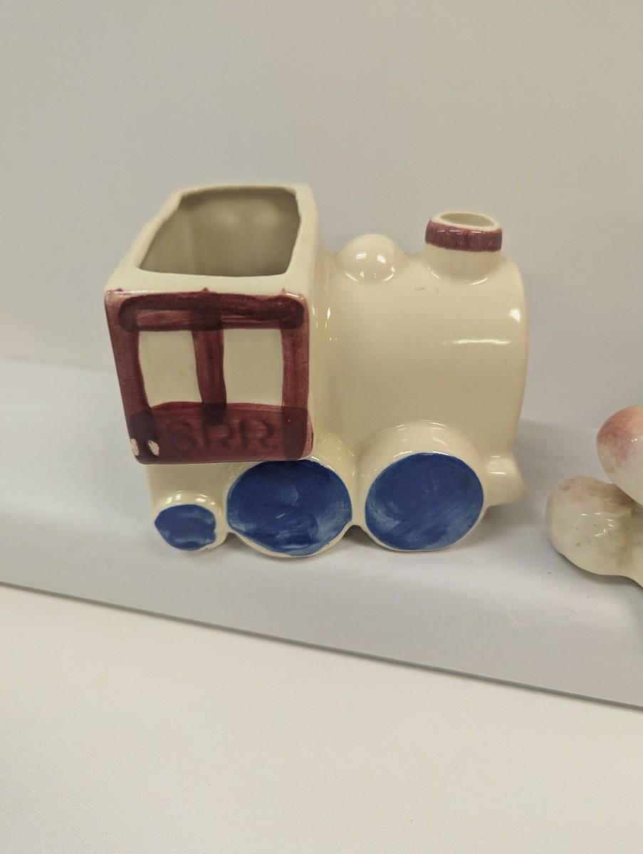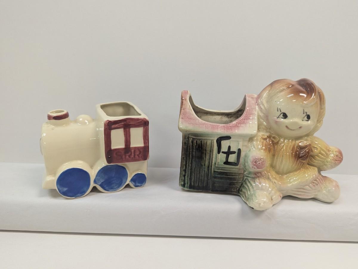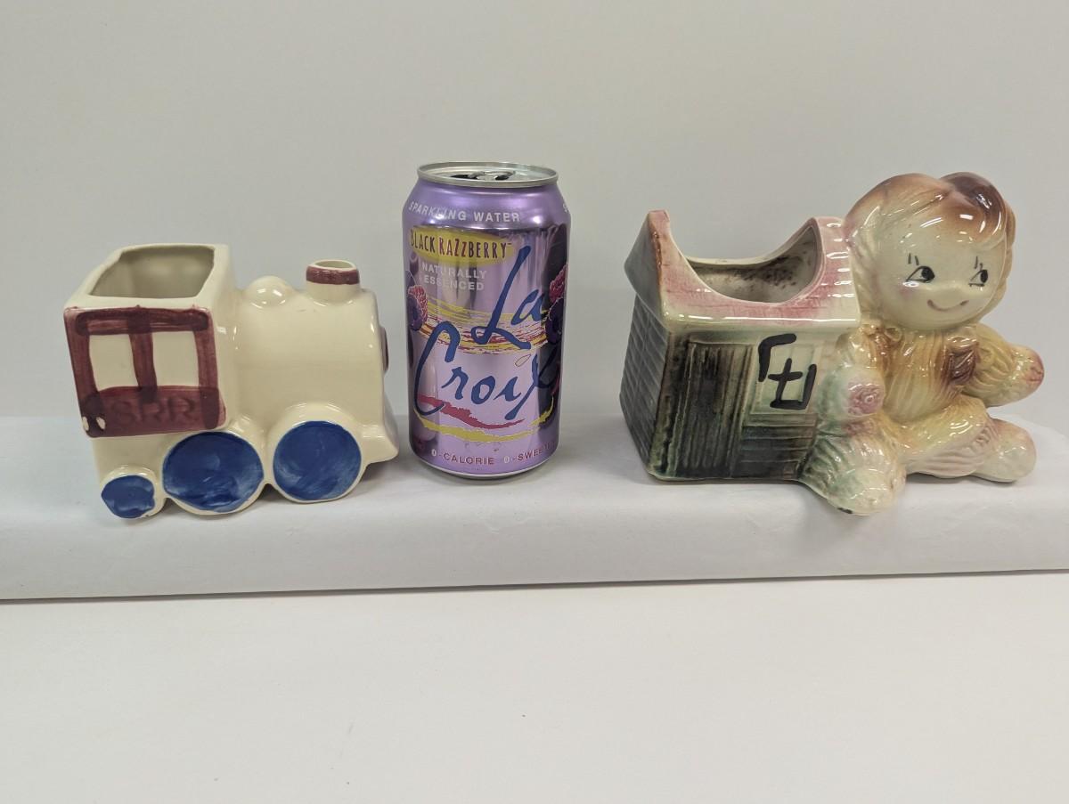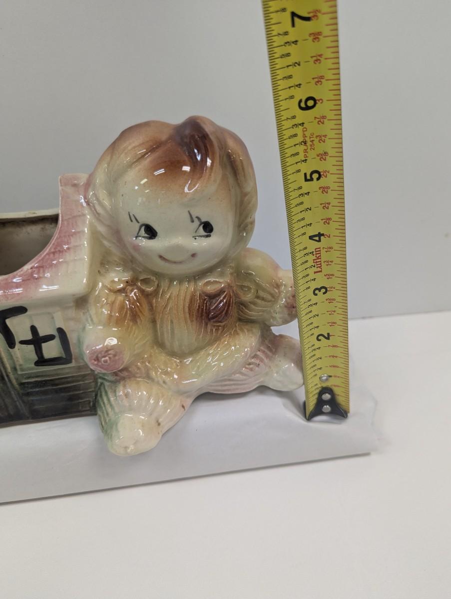 Vintage American Bisque Girl Rag Doll & Train Ceramic Planter
