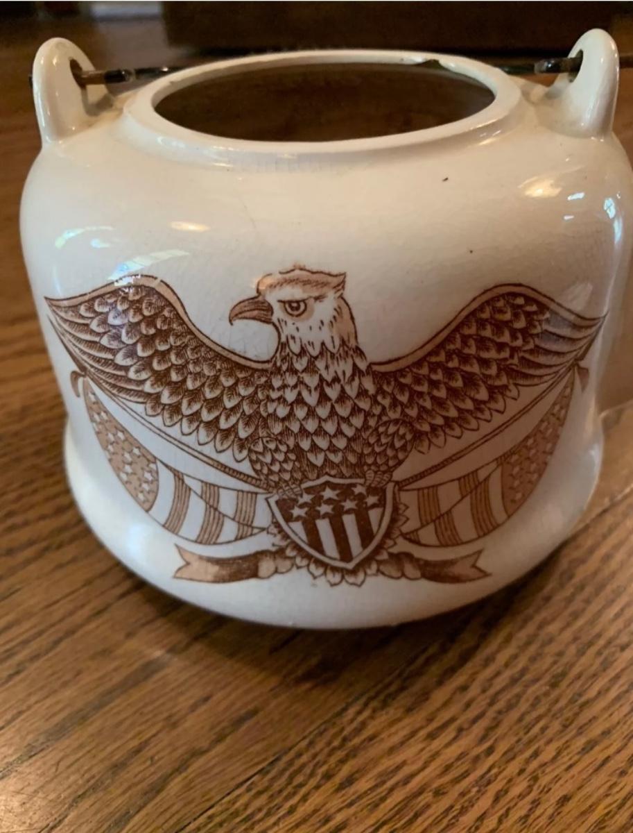 Vtg American Brown Eagle-shield-flags enamel handled teapot - Japan