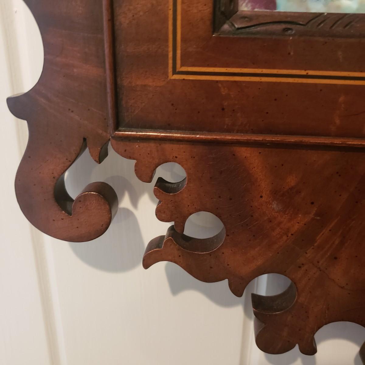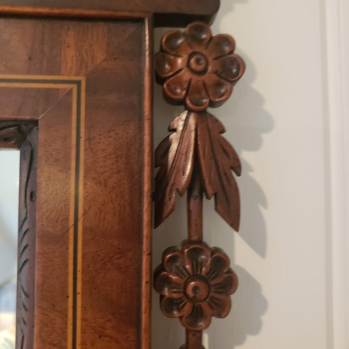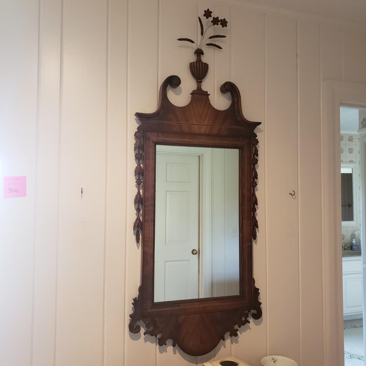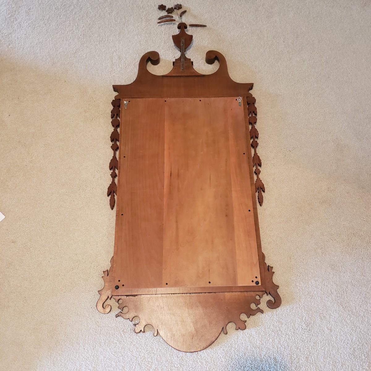This appears to be an American Chippendale mirror measuring 22" x 57"H. It appears to have fruitwood inlay and oval shell decoration at the top with giltwood decorations on the sides with rosettes and leaves. There is a carved urn with flowers and wheat at the top held in with wire, see pictures. There appears to be no blemishes.