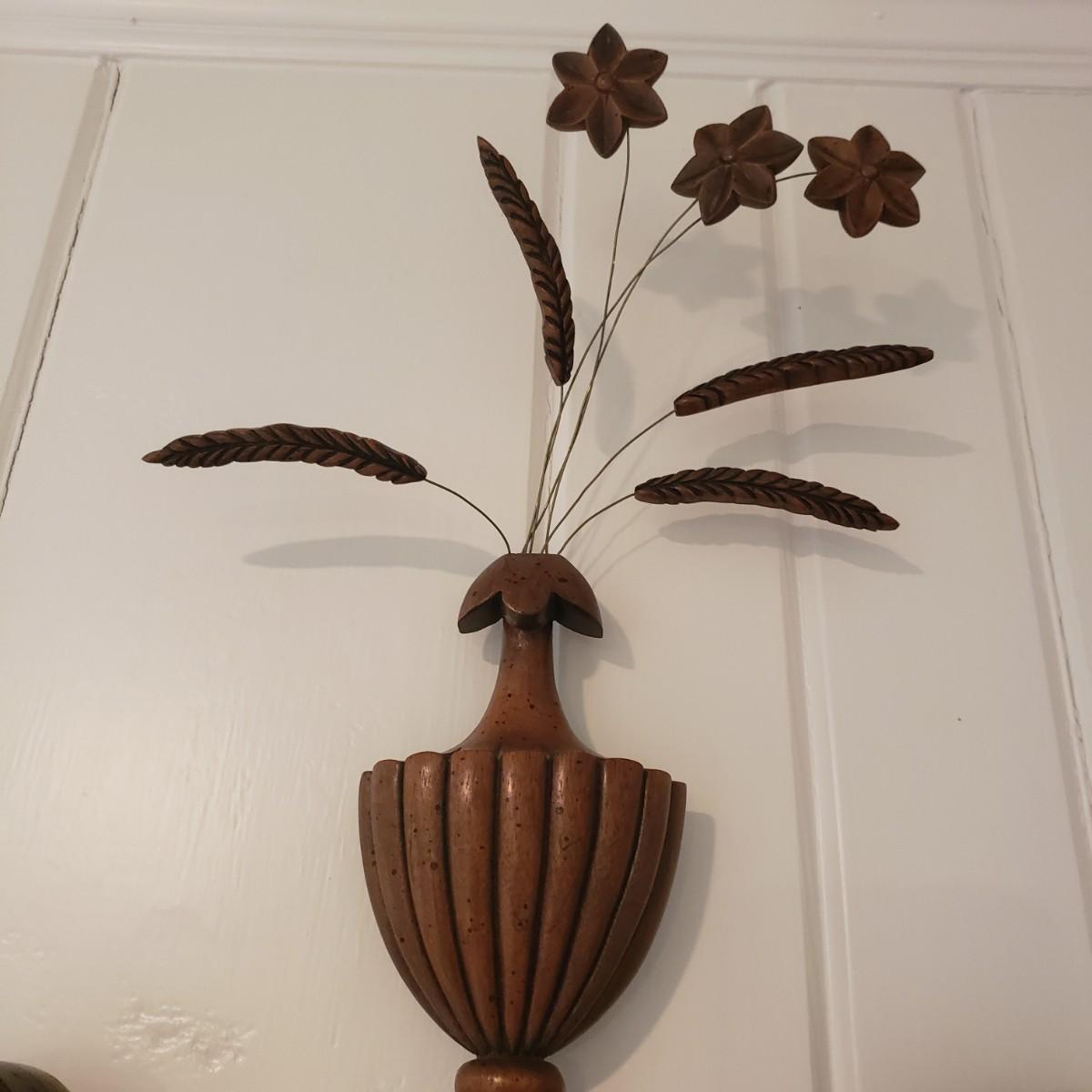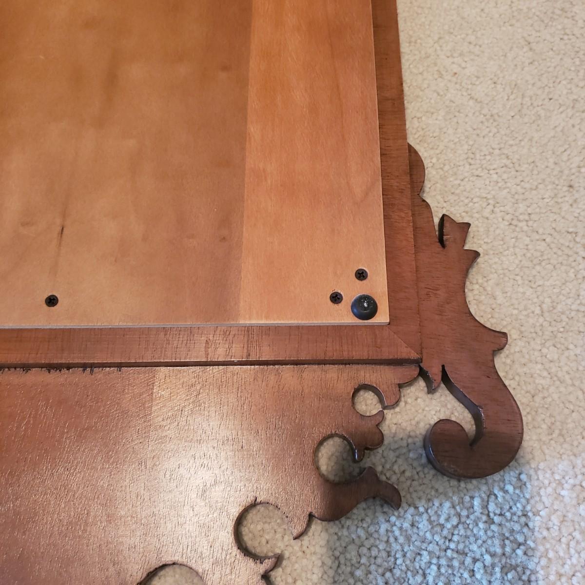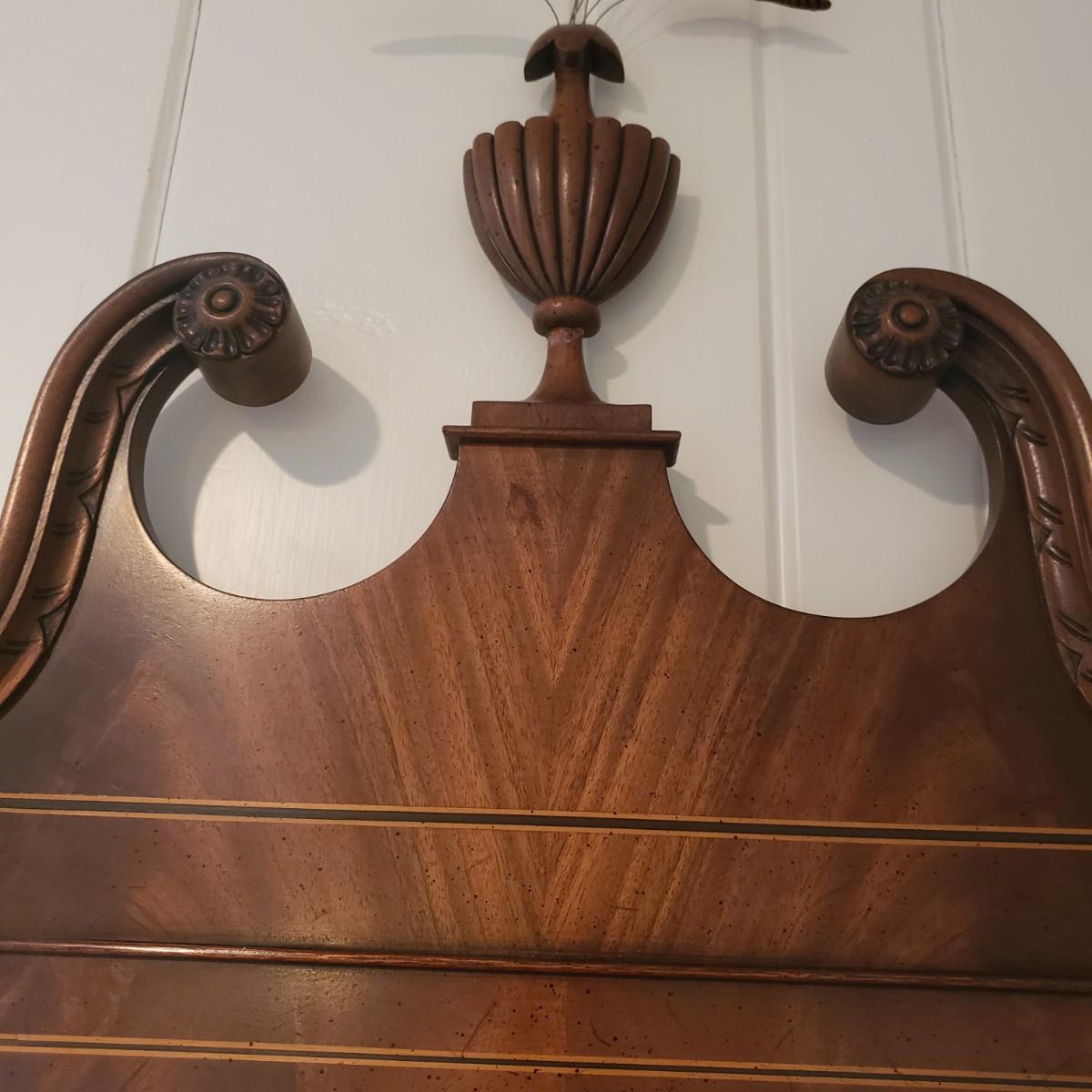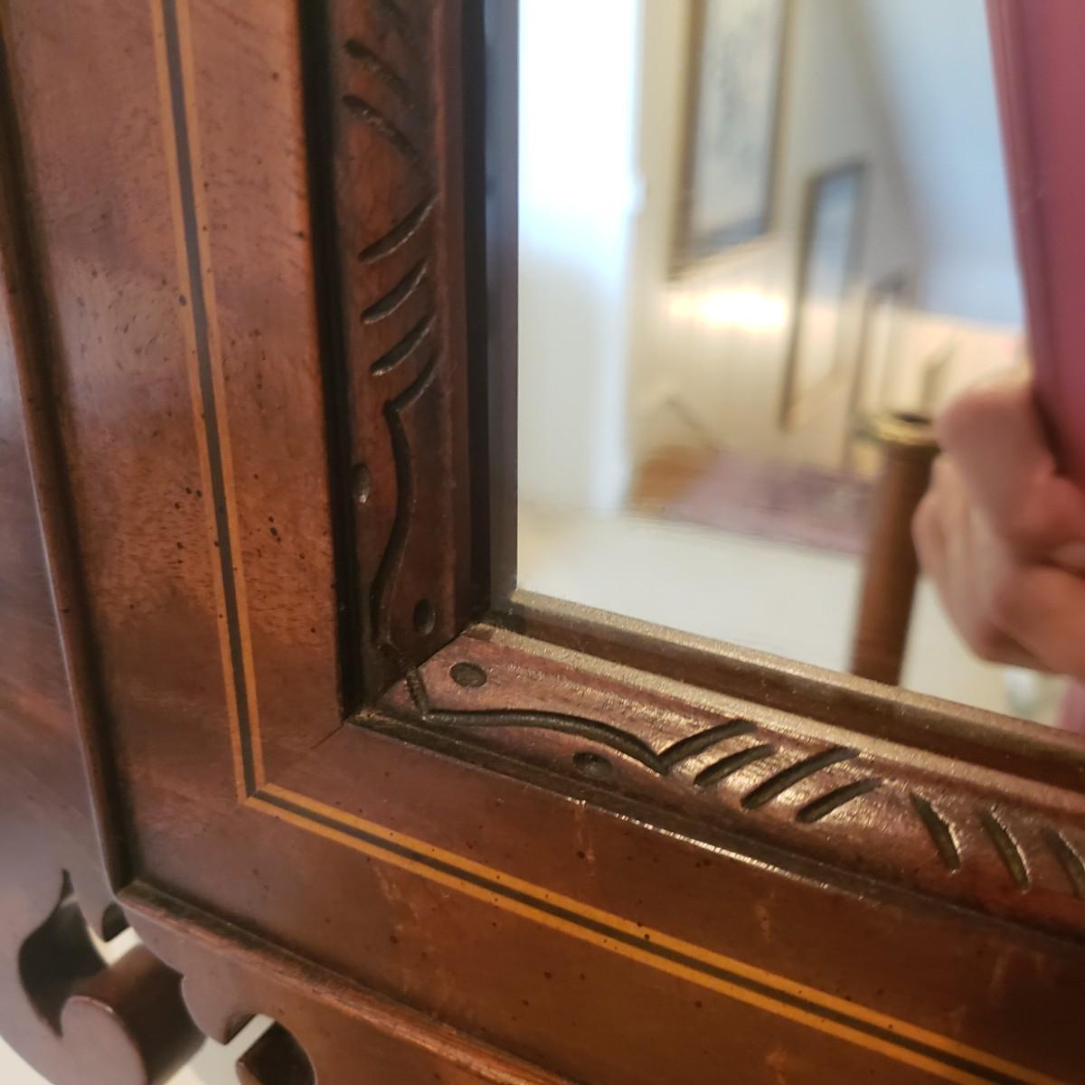 This appears to be an American Chippendale mirror measuring 22" x 57"H. It appears to have fruitwood inlay and oval shell decoration at the top with giltwood decorations on the sides with rosettes and leaves. There is a carved urn with flowers and wheat at the top held in with wire, see pictures. There appears to be no blemishes.