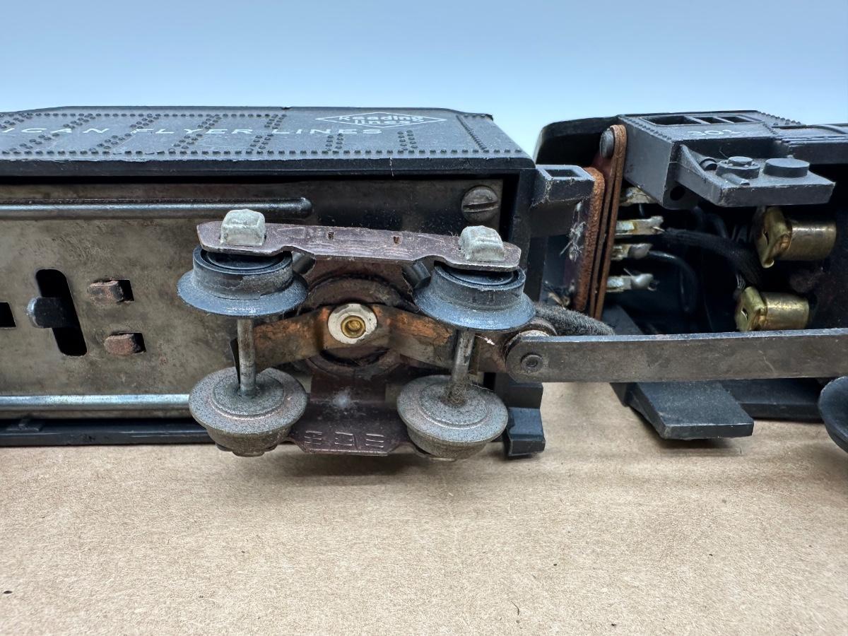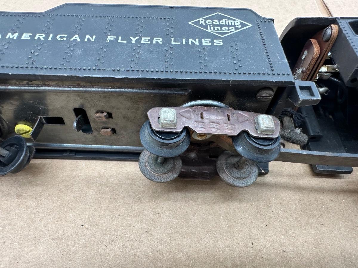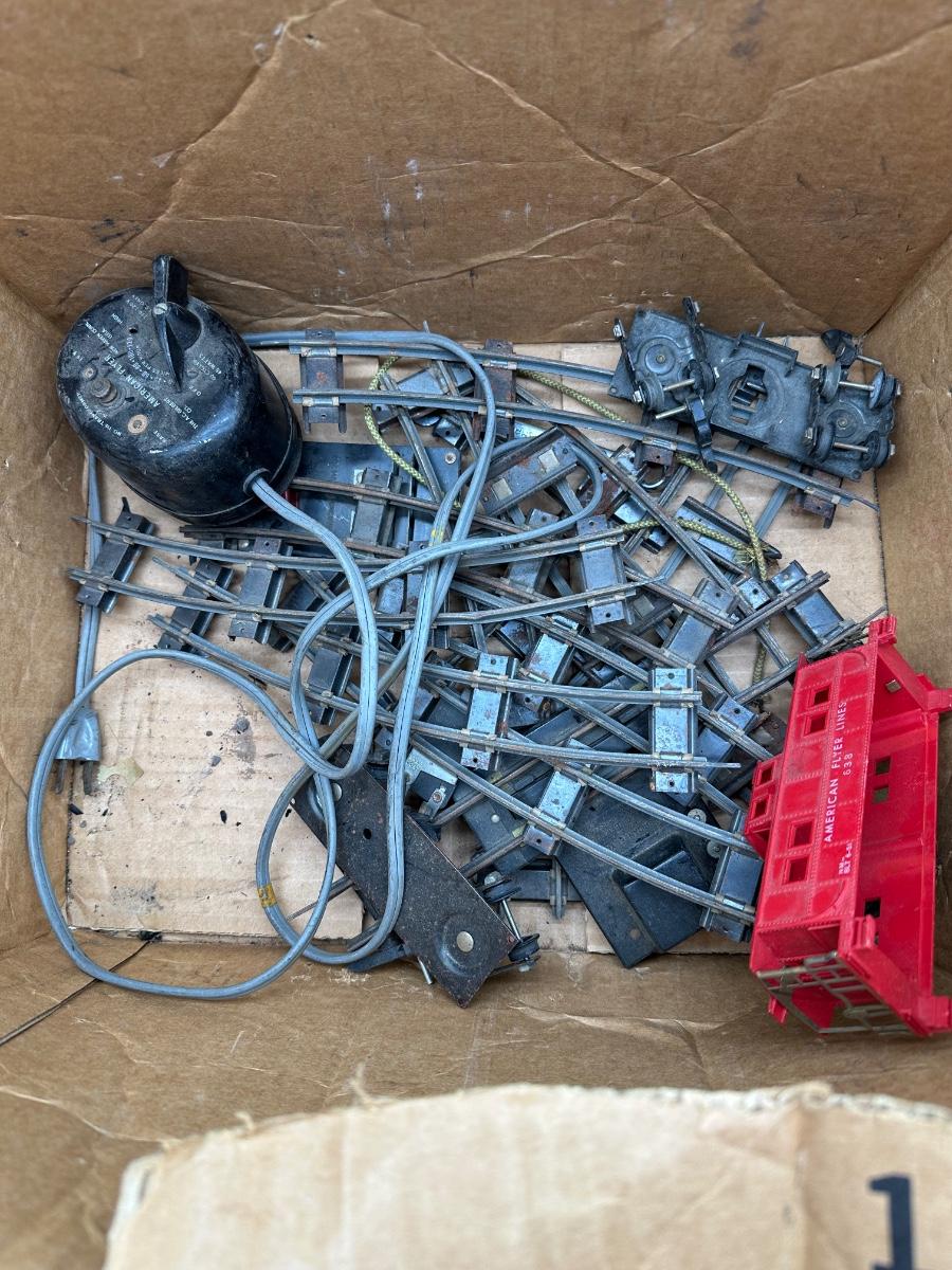 This mixed lot includes multiple classic American Flyer pieces from the mid-20th century era. Items show heavy age-appropriate wear from storage and use, with dust, surface rust, corrosion, brittle wiring, and missing or damaged components present.