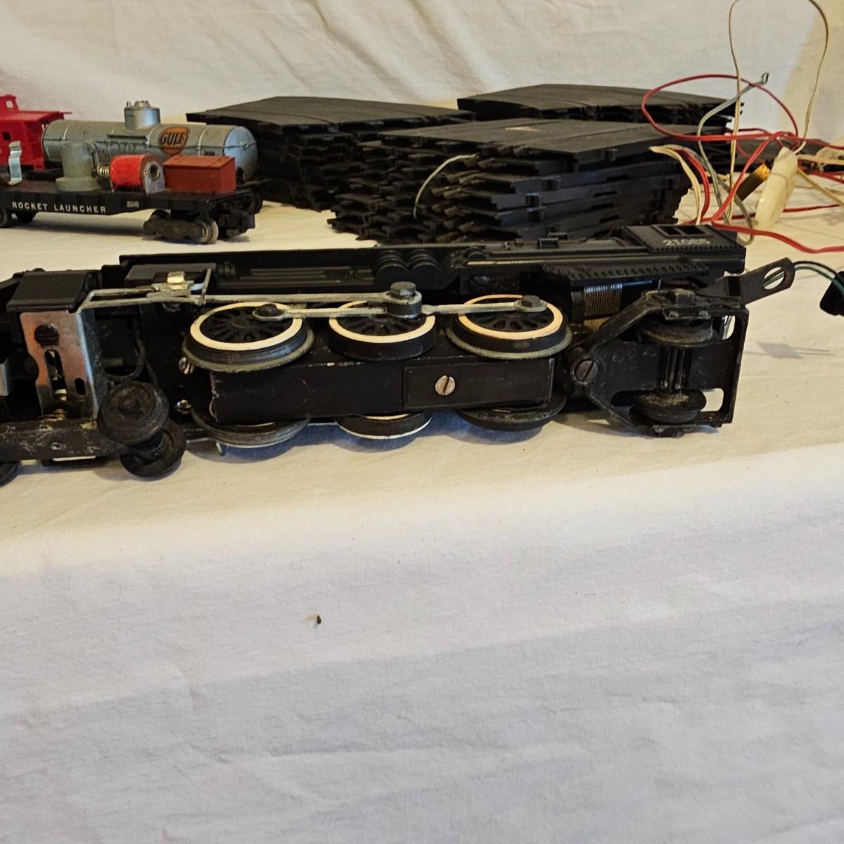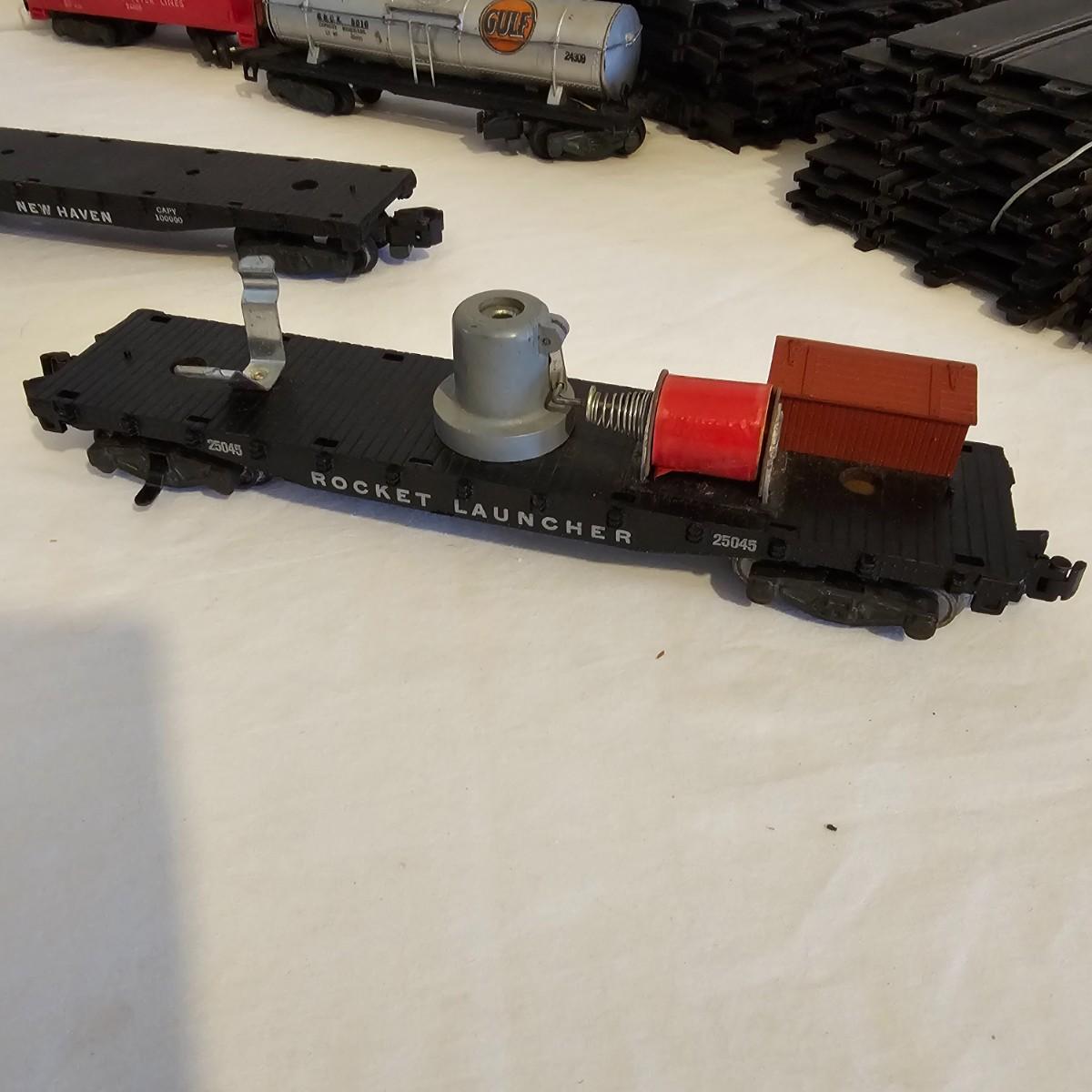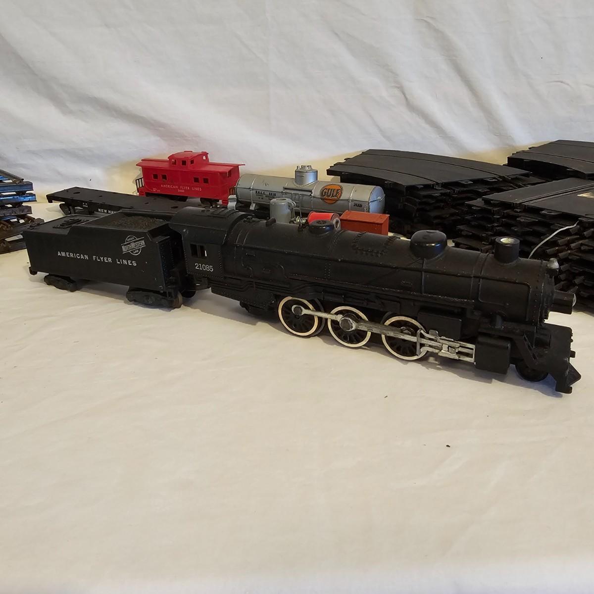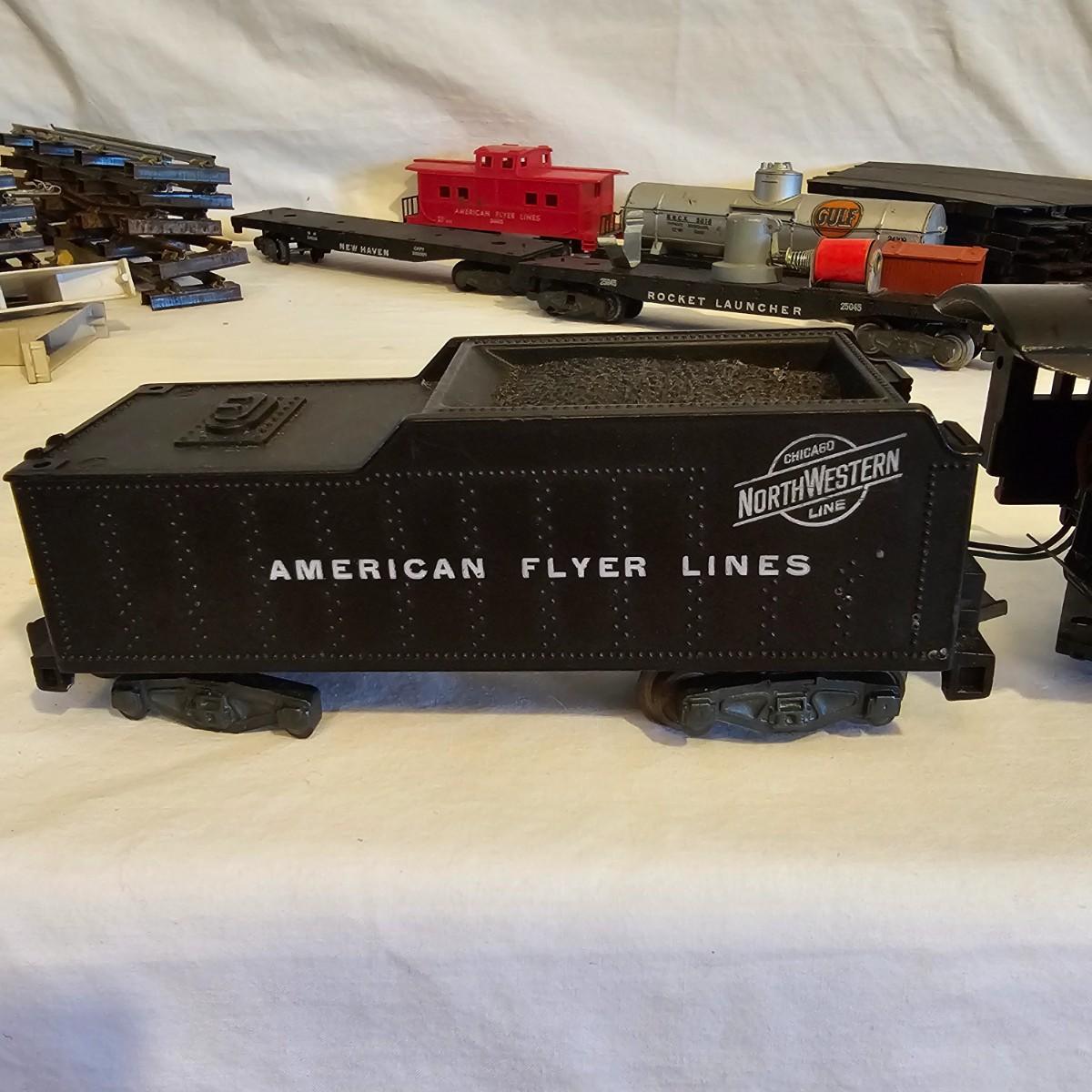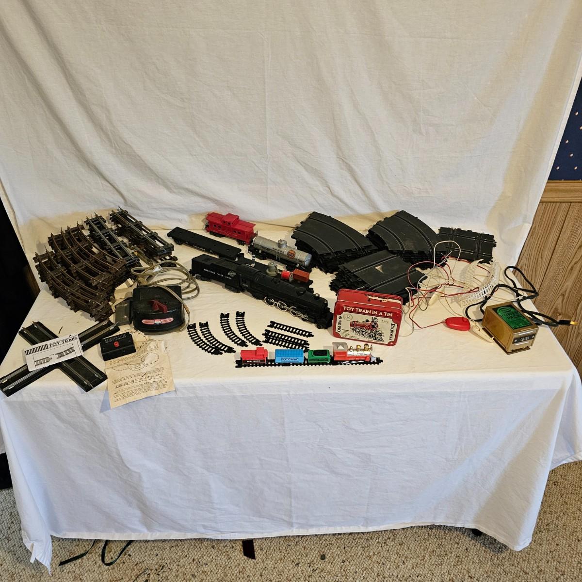 Amerivan Flyer 4-6-2 steam engine, tender and four additional cars plus straight, curved, crossover track. Includes one No. 22020 transformer which hummed when plugged in. Unable to test engine as caboose is missing some wheelsets. Missile launching car has no missile, just car and controller. Ten straight and 16 pieces curved two-rail track, rusty. Lot also includes some slot car track with an Eldon 3851 transformer which hummed when plugged in. No cars so unable to test. Two partial controller units, eight straight, 19 curved and one crossover track. Lastly, one Toy Train in a Tin. Small battery operated (item powered on when tested) Engine and three cars plus some track, may not be complete set. See photos for details. Shipping available.