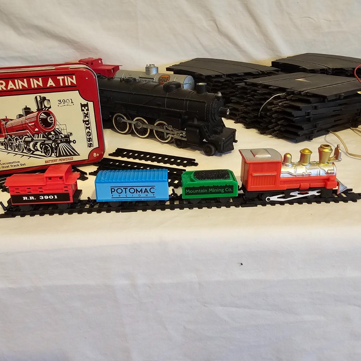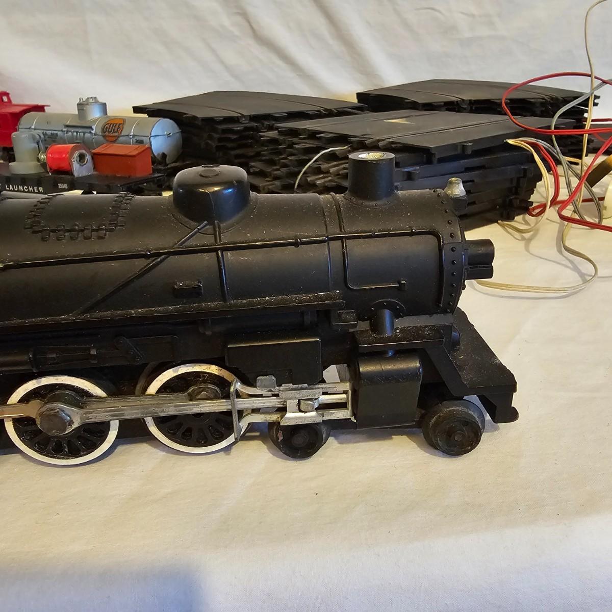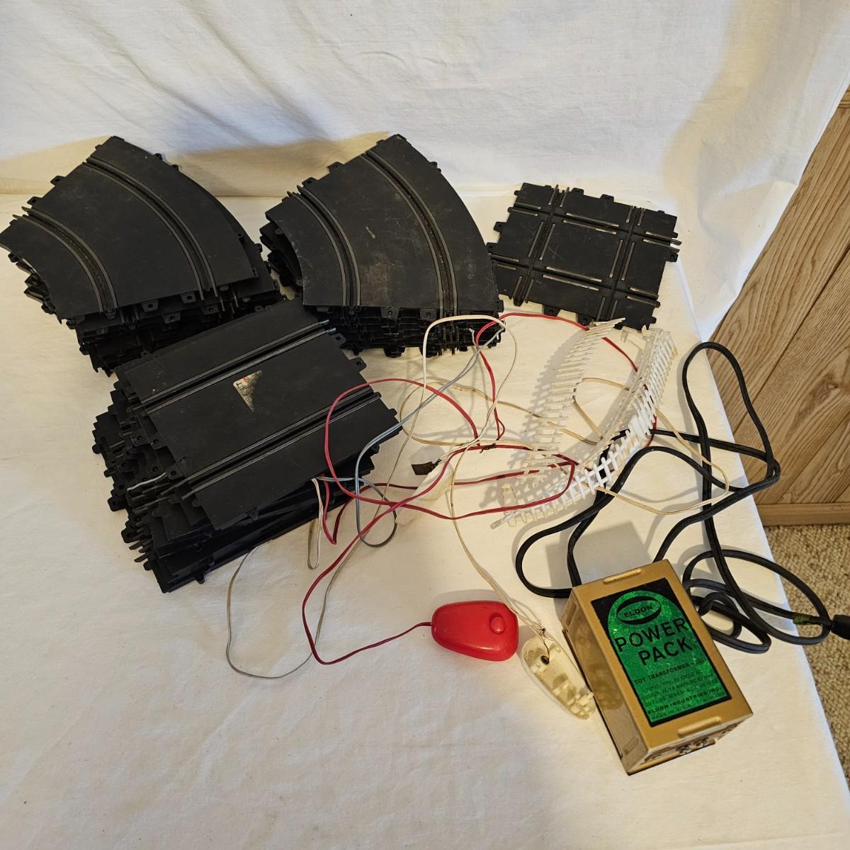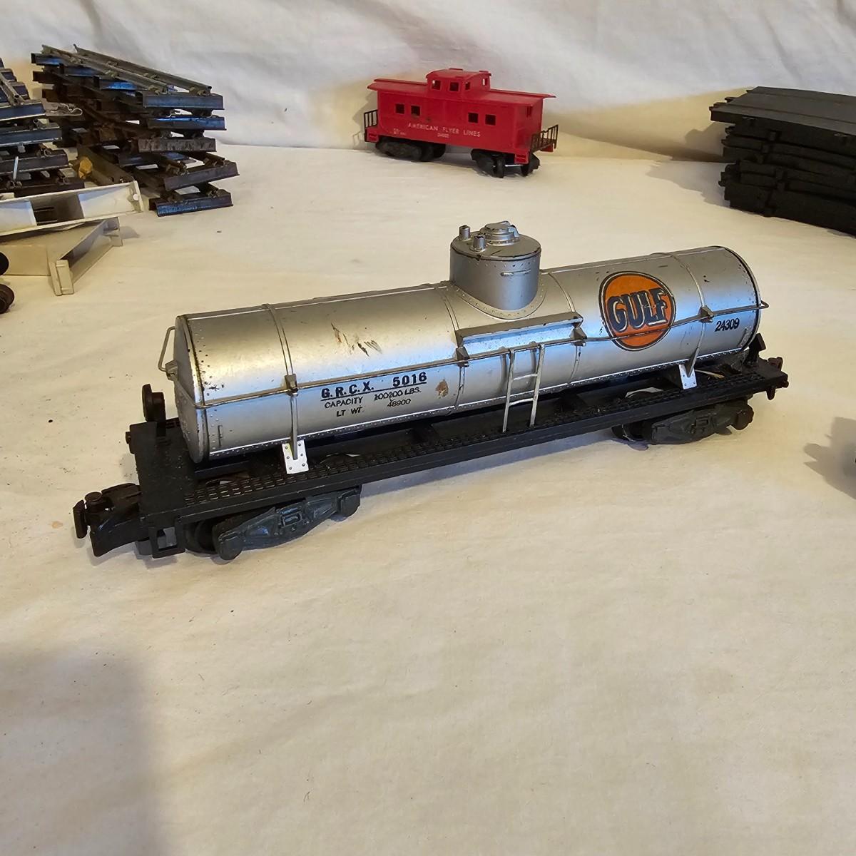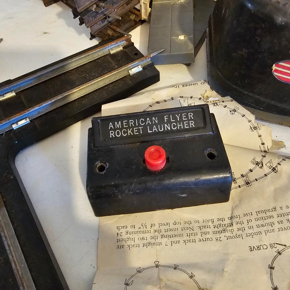 Amerivan Flyer 4-6-2 steam engine, tender and four additional cars plus straight, curved, crossover track. Includes one No. 22020 transformer which hummed when plugged in. Unable to test engine as caboose is missing some wheelsets. Missile launching car has no missile, just car and controller. Ten straight and 16 pieces curved two-rail track, rusty. Lot also includes some slot car track with an Eldon 3851 transformer which hummed when plugged in. No cars so unable to test. Two partial controller units, eight straight, 19 curved and one crossover track. Lastly, one Toy Train in a Tin. Small battery operated (item powered on when tested) Engine and three cars plus some track, may not be complete set. See photos for details. Shipping available.