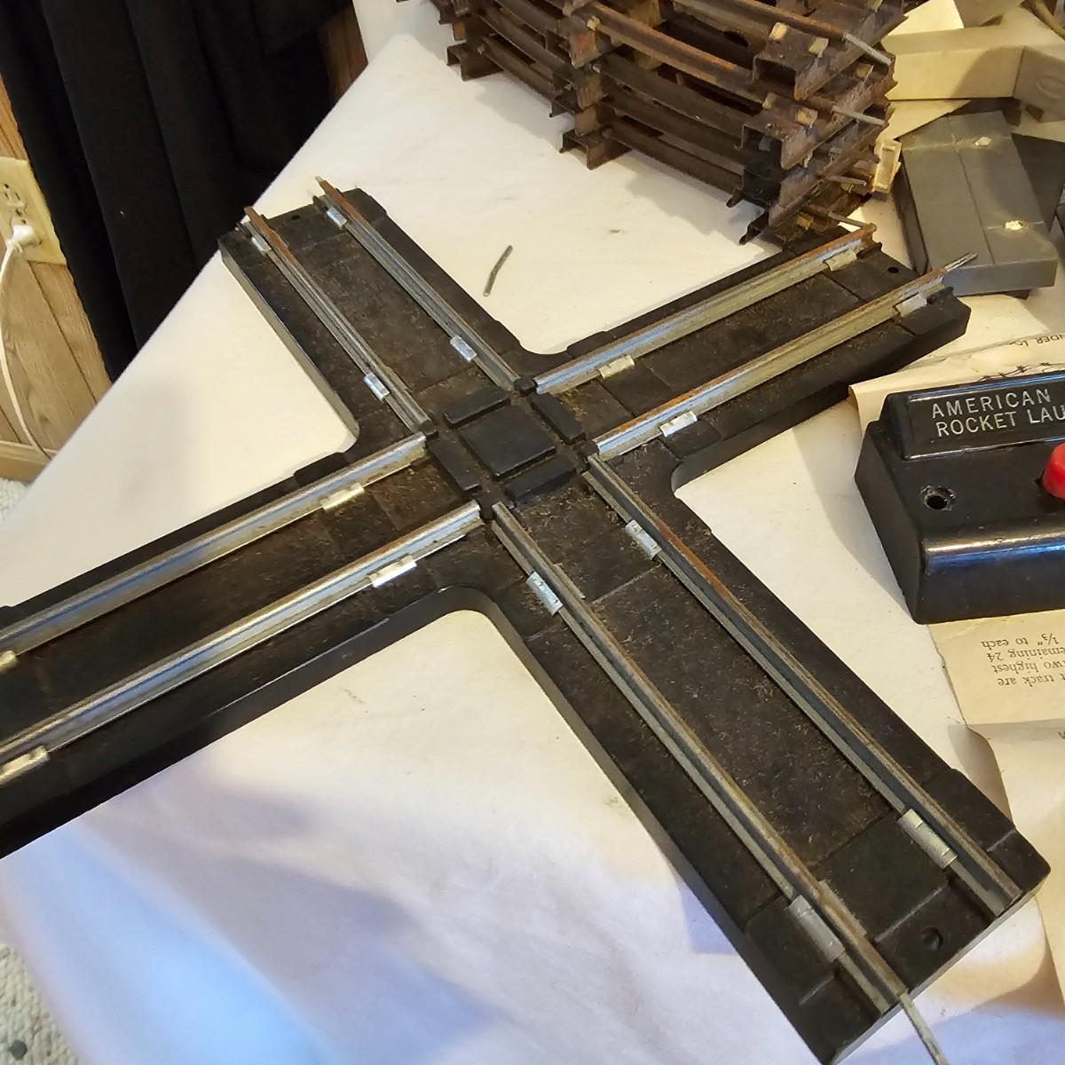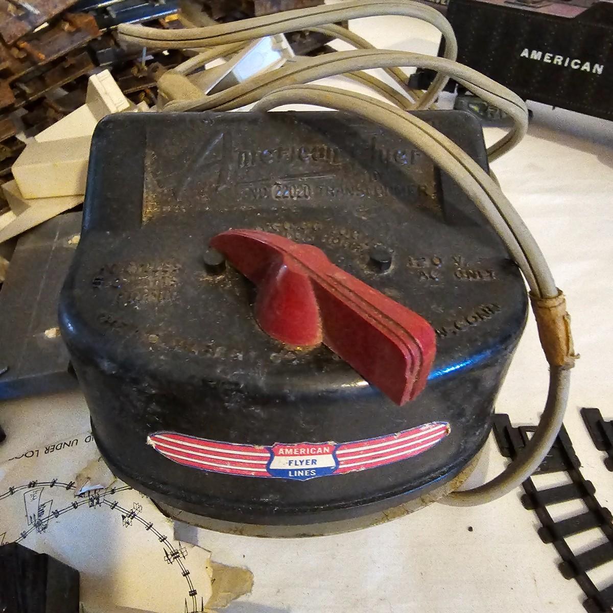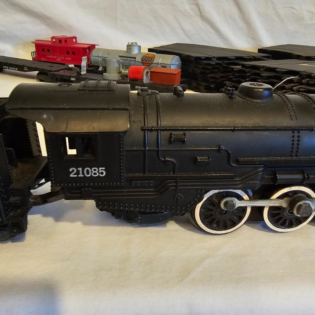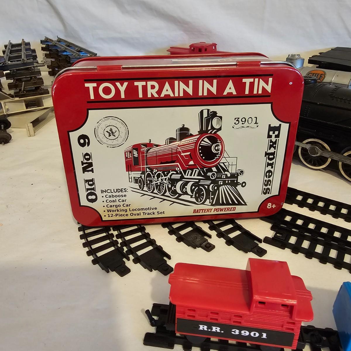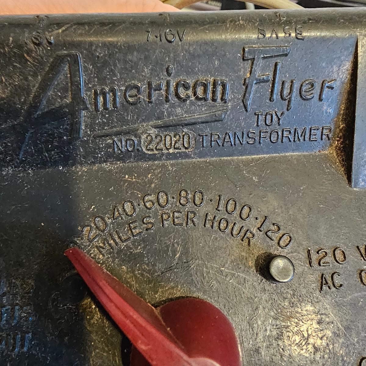 Amerivan Flyer 4-6-2 steam engine, tender and four additional cars plus straight, curved, crossover track. Includes one No. 22020 transformer which hummed when plugged in. Unable to test engine as caboose is missing some wheelsets. Missile launching car has no missile, just car and controller. Ten straight and 16 pieces curved two-rail track, rusty. Lot also includes some slot car track with an Eldon 3851 transformer which hummed when plugged in. No cars so unable to test. Two partial controller units, eight straight, 19 curved and one crossover track. Lastly, one Toy Train in a Tin. Small battery operated (item powered on when tested) Engine and three cars plus some track, may not be complete set. See photos for details. Shipping available.