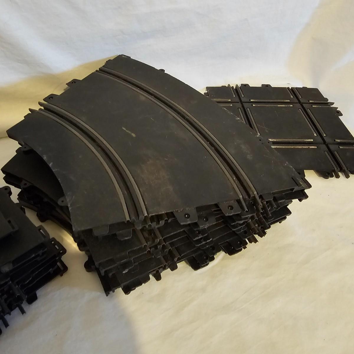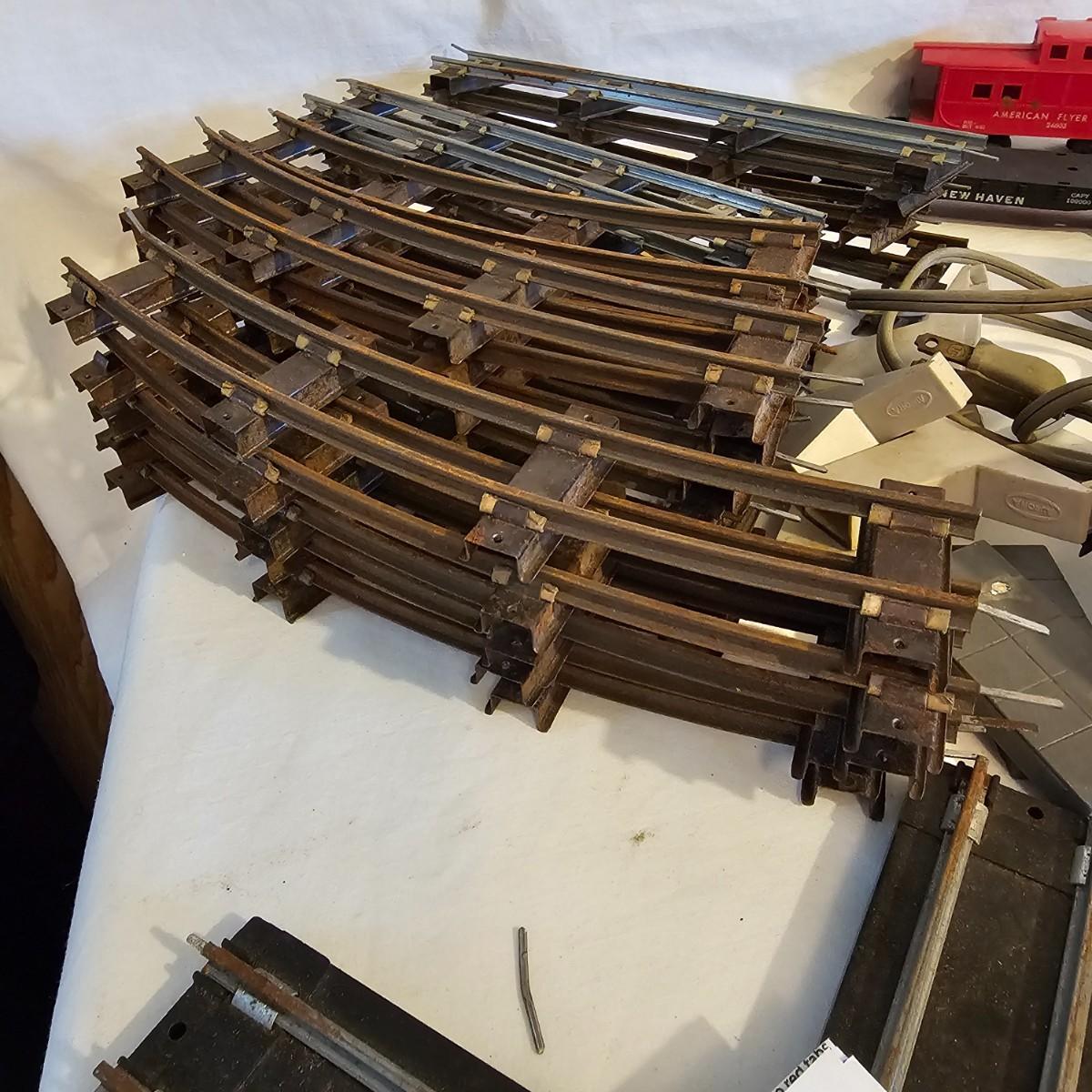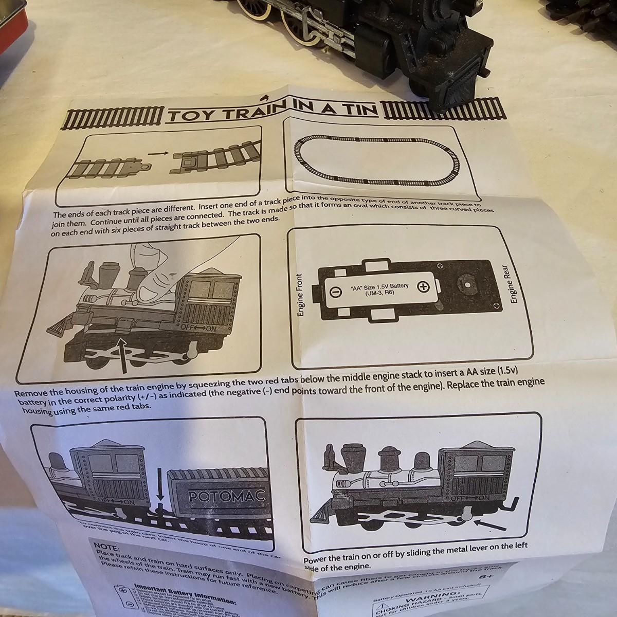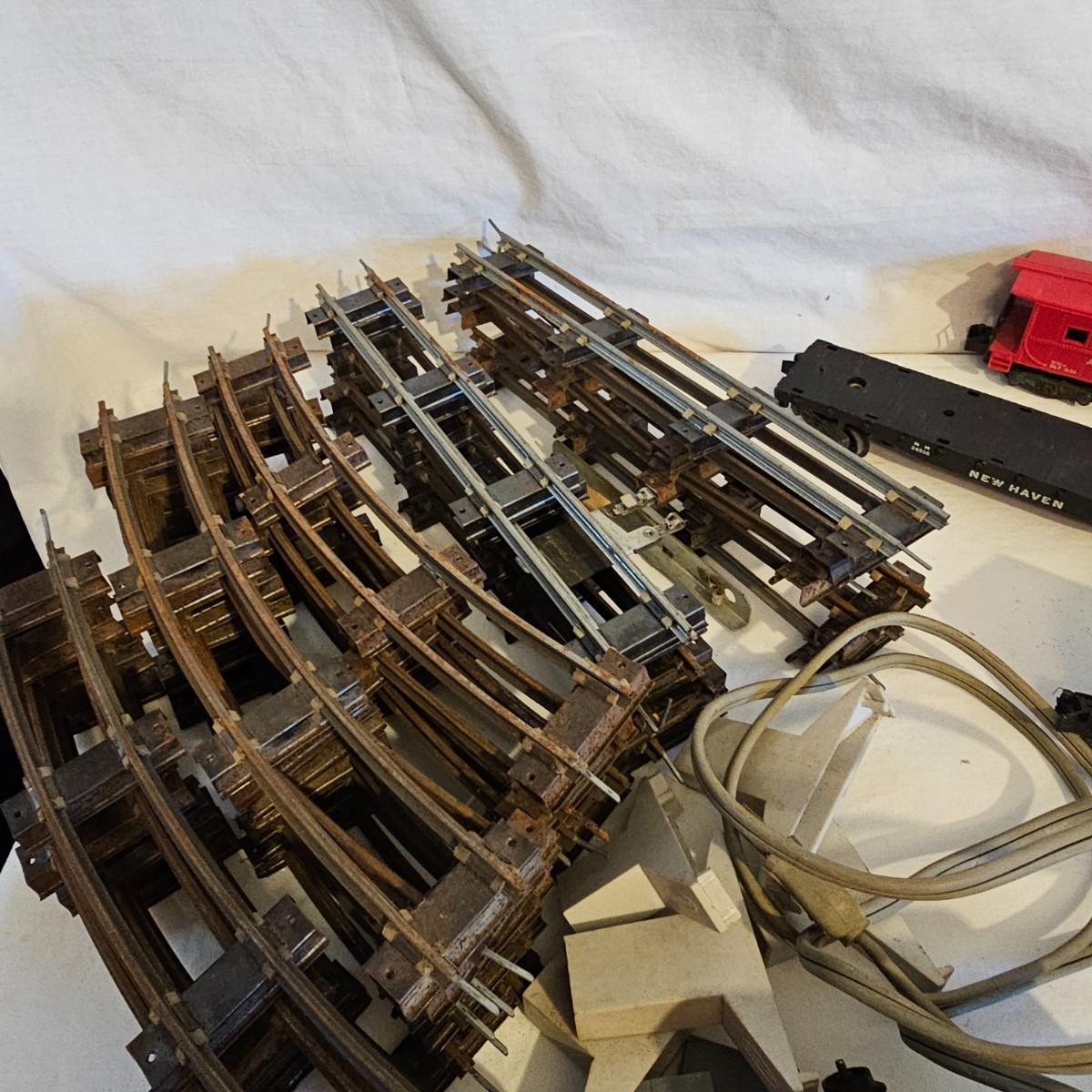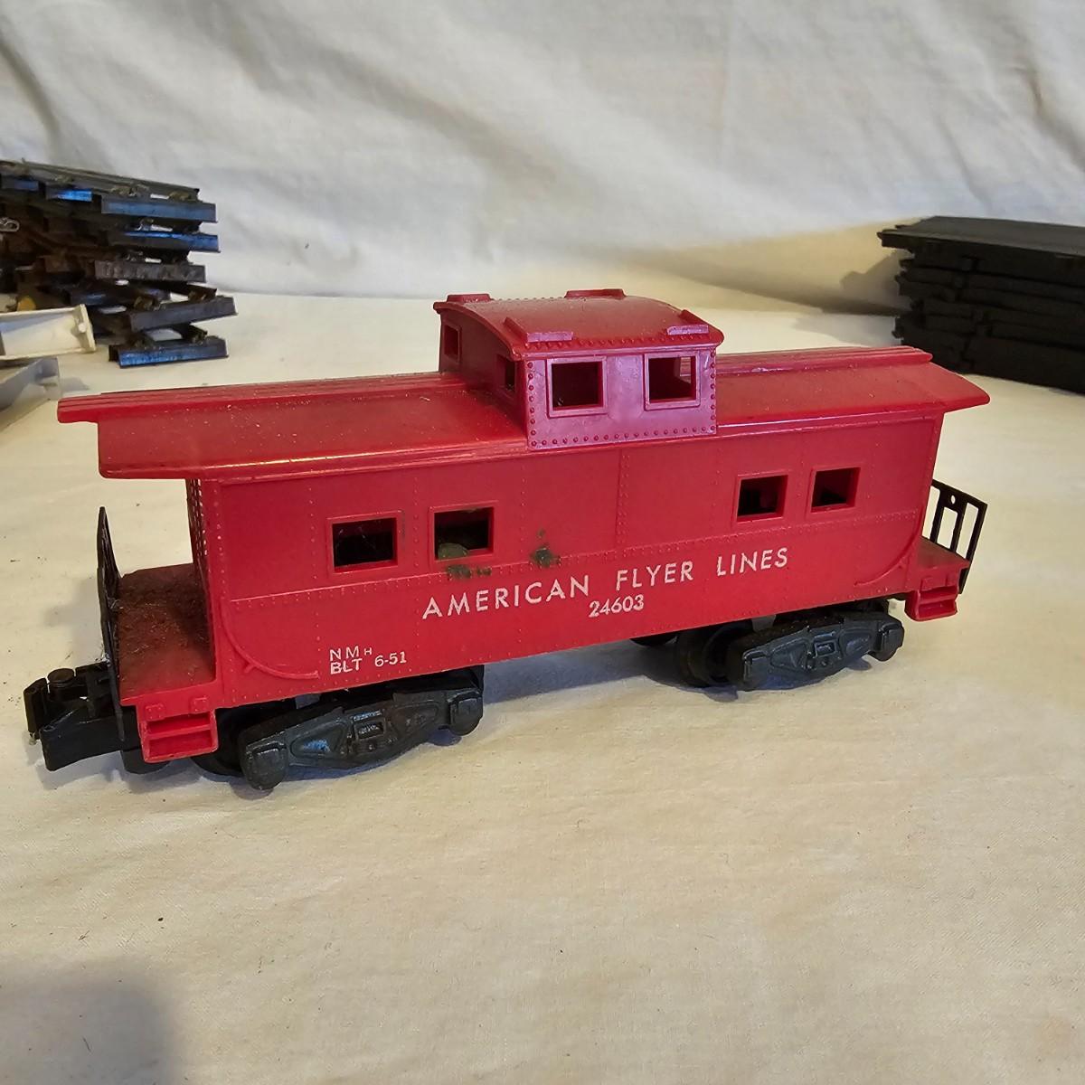 Amerivan Flyer 4-6-2 steam engine, tender and four additional cars plus straight, curved, crossover track. Includes one No. 22020 transformer which hummed when plugged in. Unable to test engine as caboose is missing some wheelsets. Missile launching car has no missile, just car and controller. Ten straight and 16 pieces curved two-rail track, rusty. Lot also includes some slot car track with an Eldon 3851 transformer which hummed when plugged in. No cars so unable to test. Two partial controller units, eight straight, 19 curved and one crossover track. Lastly, one Toy Train in a Tin. Small battery operated (item powered on when tested) Engine and three cars plus some track, may not be complete set. See photos for details. Shipping available.