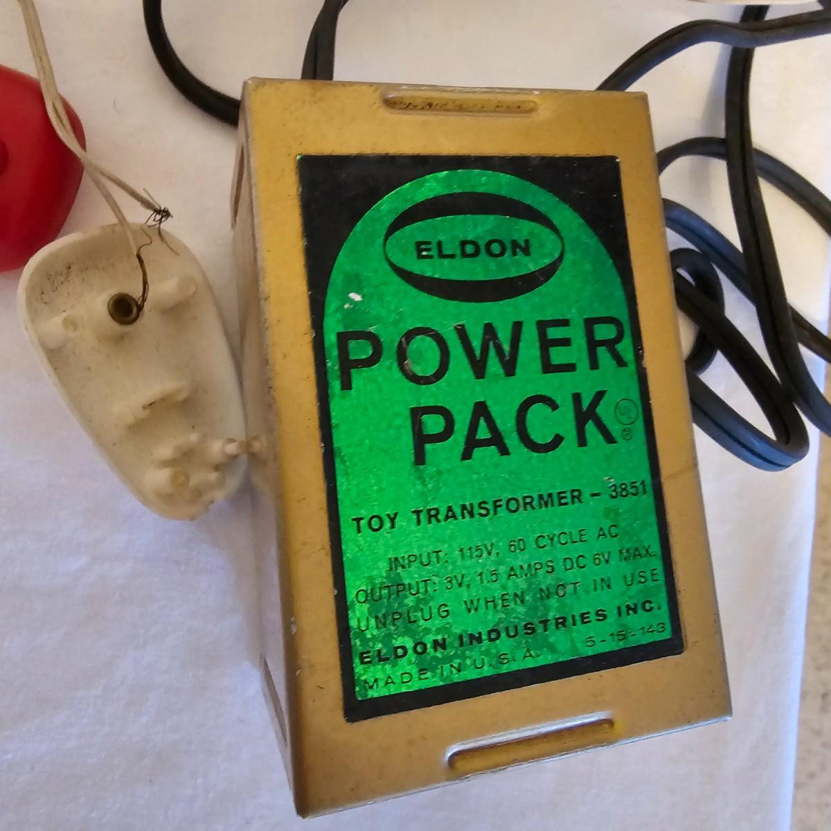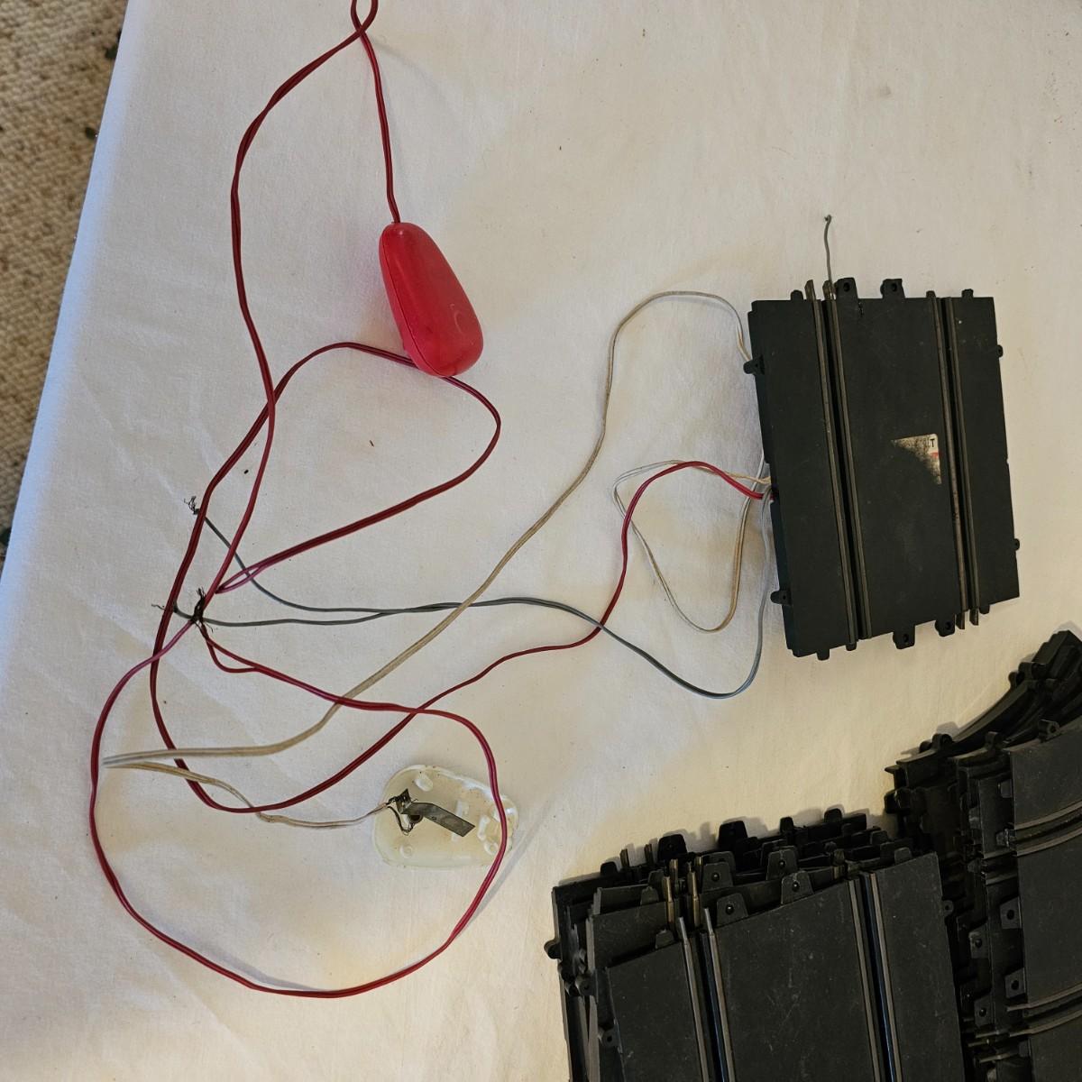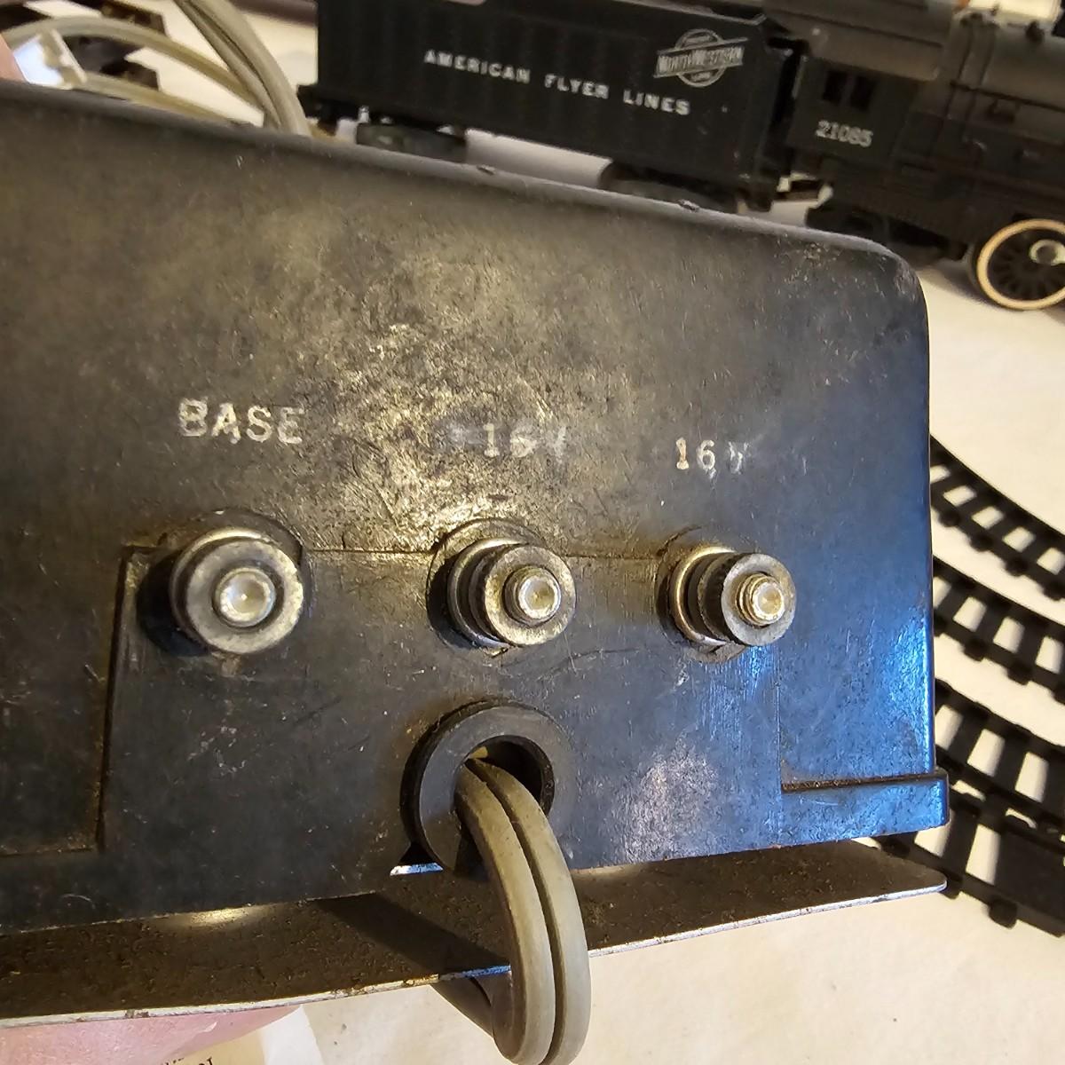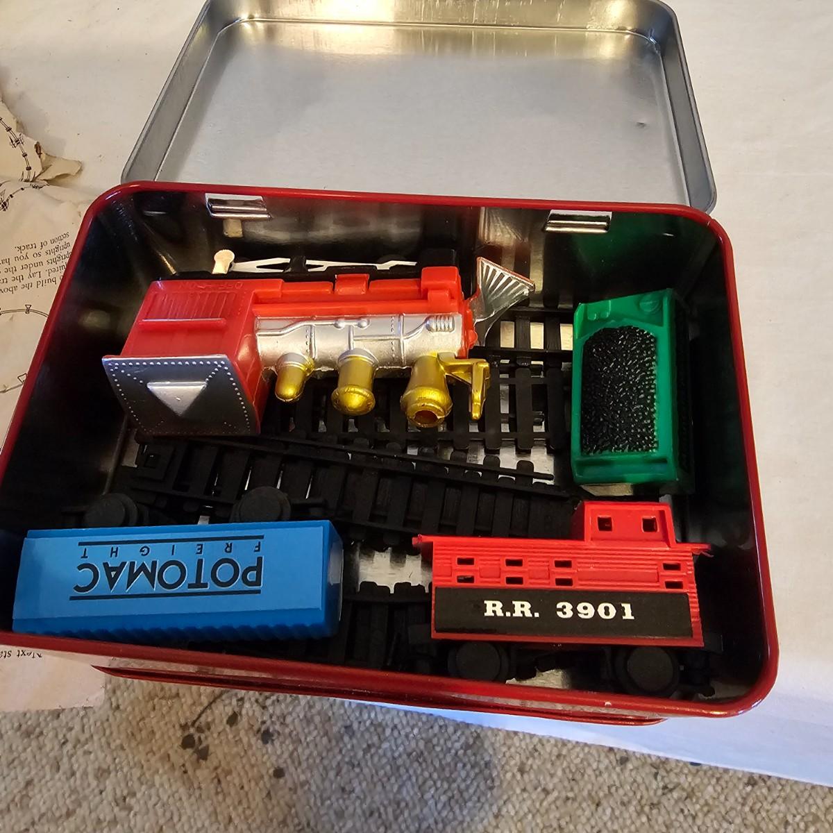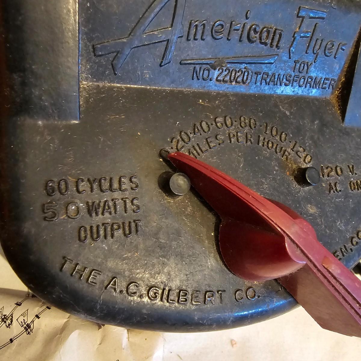 Amerivan Flyer 4-6-2 steam engine, tender and four additional cars plus straight, curved, crossover track. Includes one No. 22020 transformer which hummed when plugged in. Unable to test engine as caboose is missing some wheelsets. Missile launching car has no missile, just car and controller. Ten straight and 16 pieces curved two-rail track, rusty. Lot also includes some slot car track with an Eldon 3851 transformer which hummed when plugged in. No cars so unable to test. Two partial controller units, eight straight, 19 curved and one crossover track. Lastly, one Toy Train in a Tin. Small battery operated (item powered on when tested) Engine and three cars plus some track, may not be complete set. See photos for details. Shipping available.
