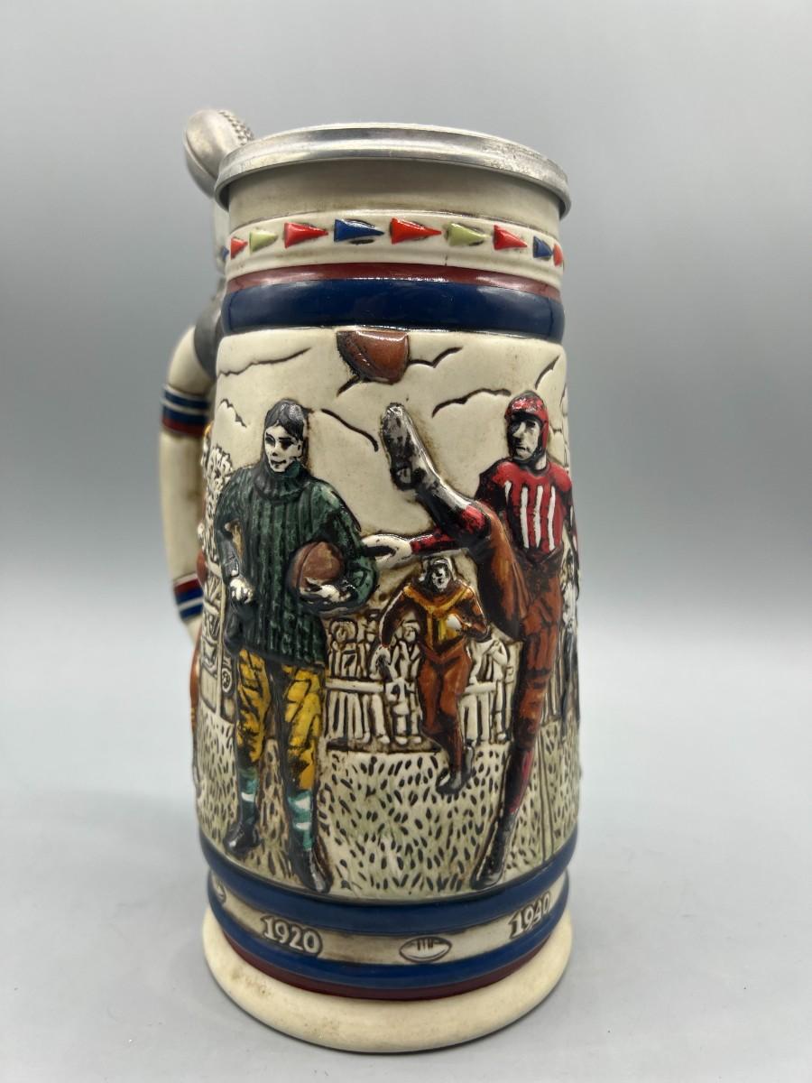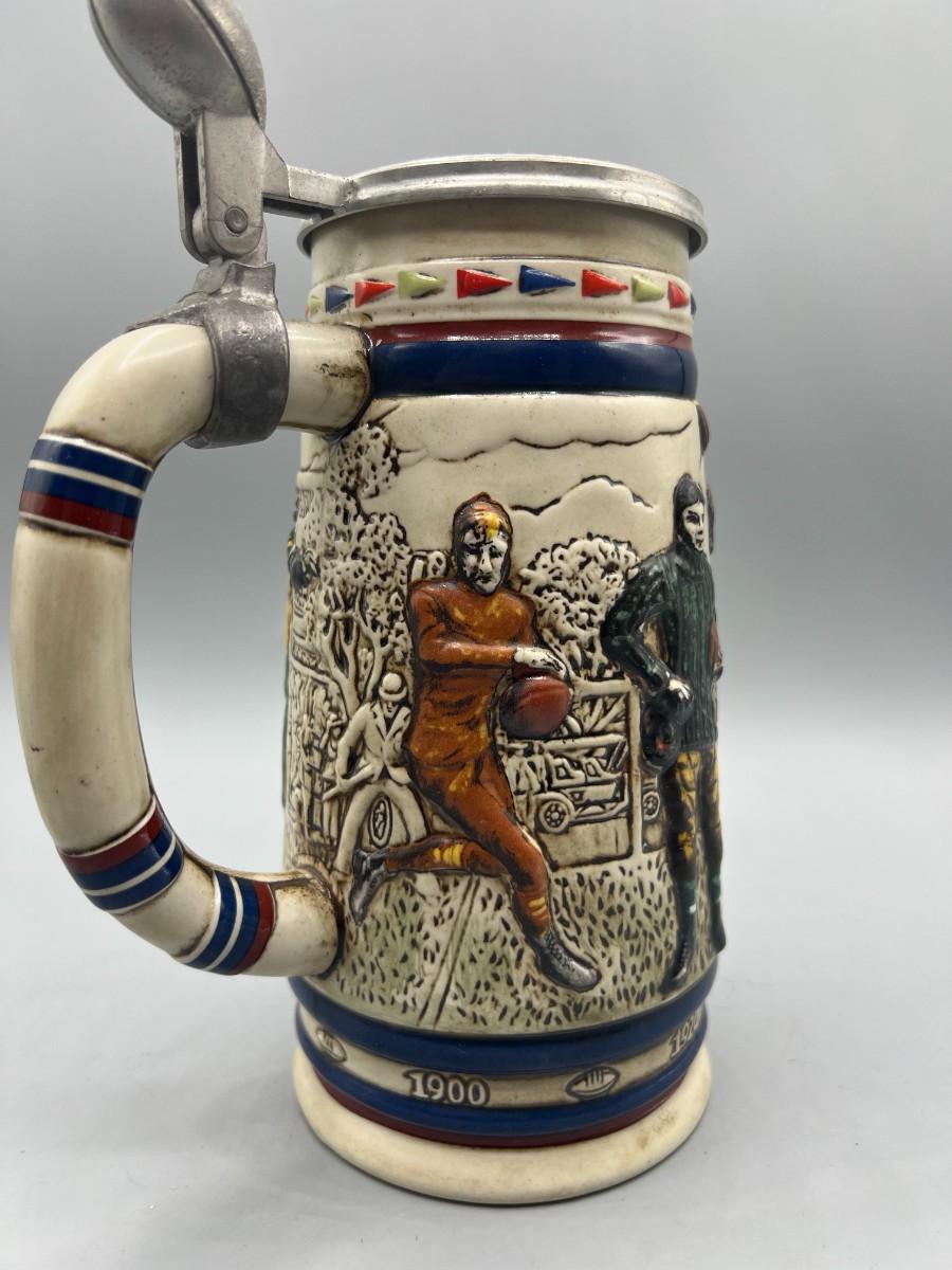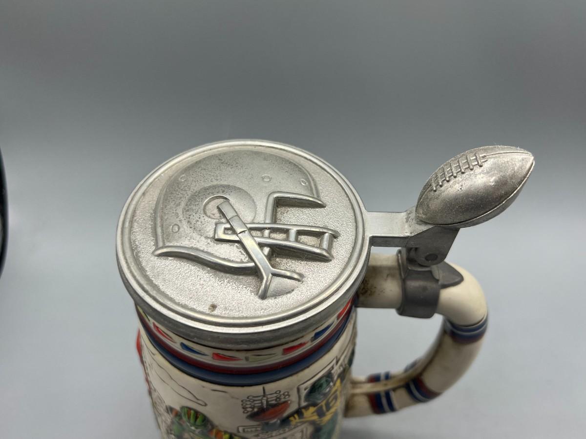 Vintage American Football Themed Lidded Beer Stein Mug. Good previously displayed condition.