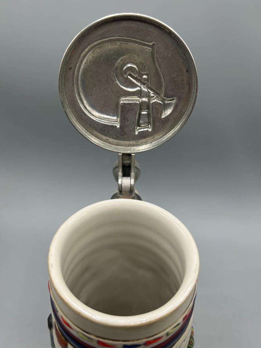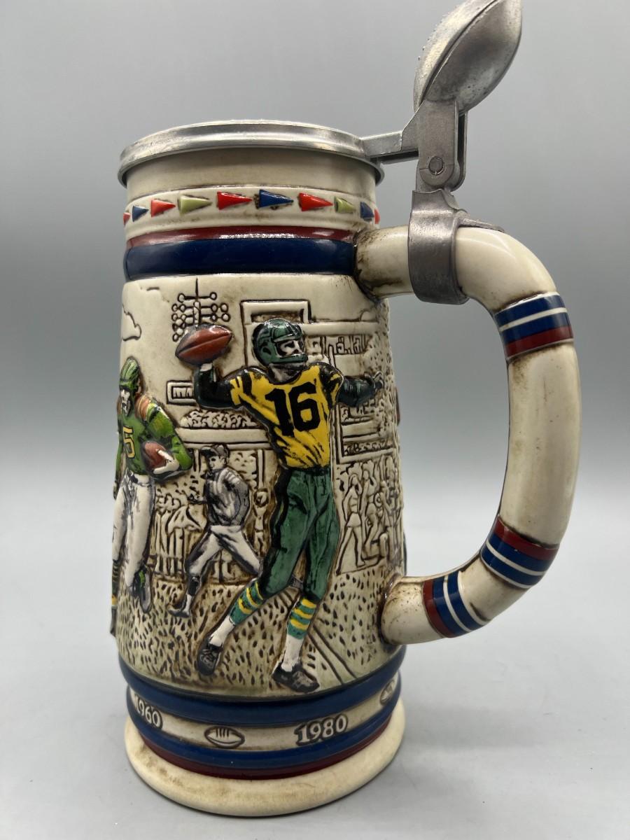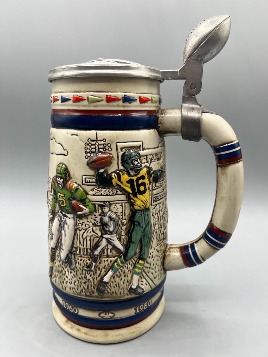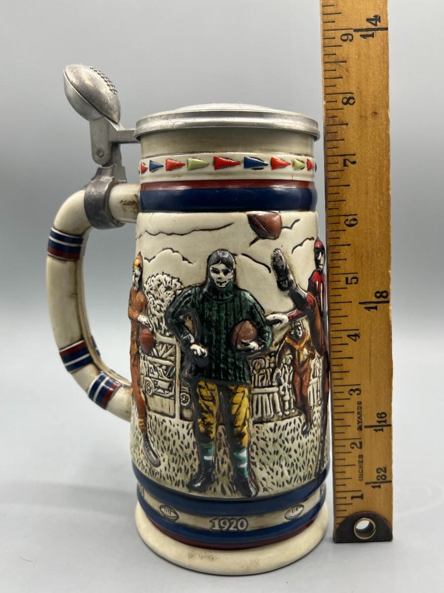 Vintage American Football Themed Lidded Beer Stein Mug. Good previously displayed condition.