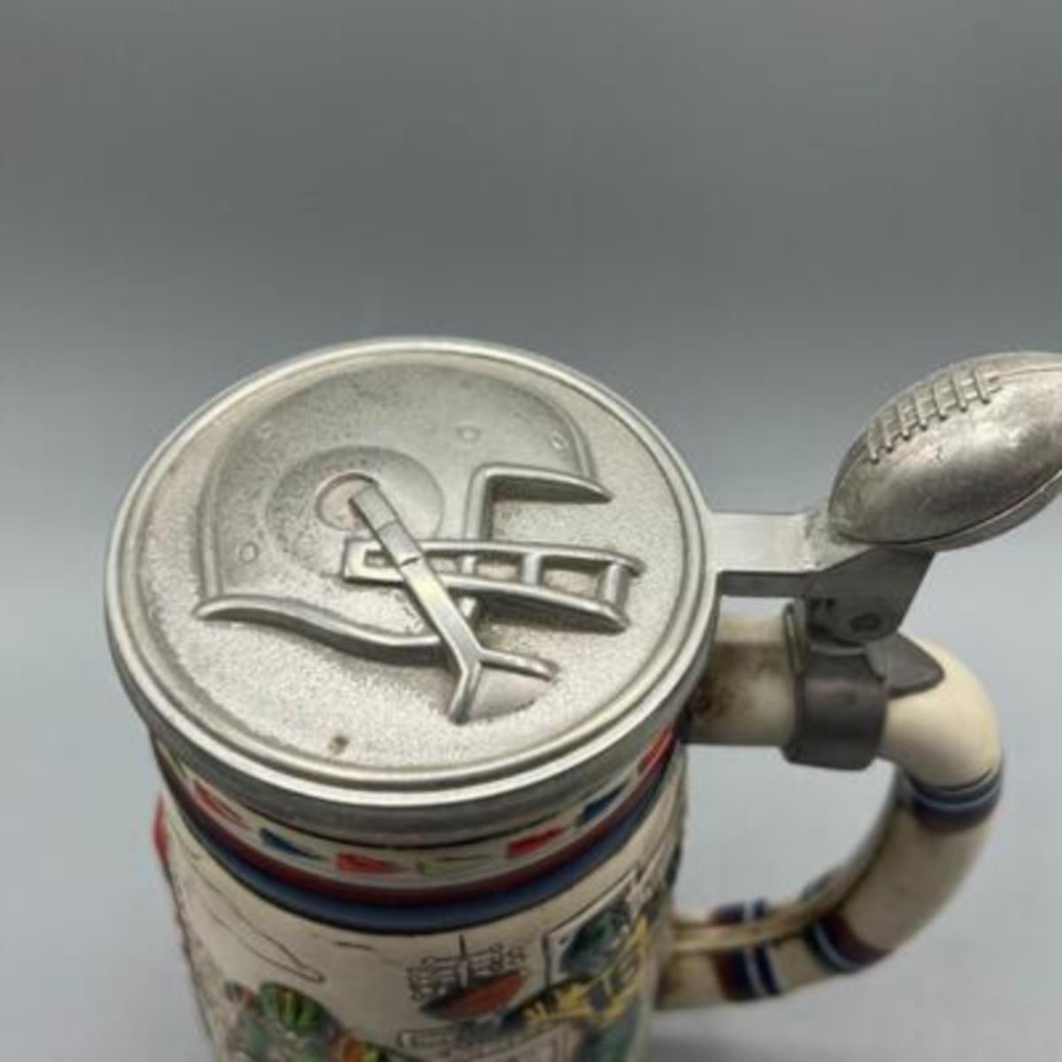 Vintage American Football Themed Lidded Beer Stein Mug. Good previously displayed condition.