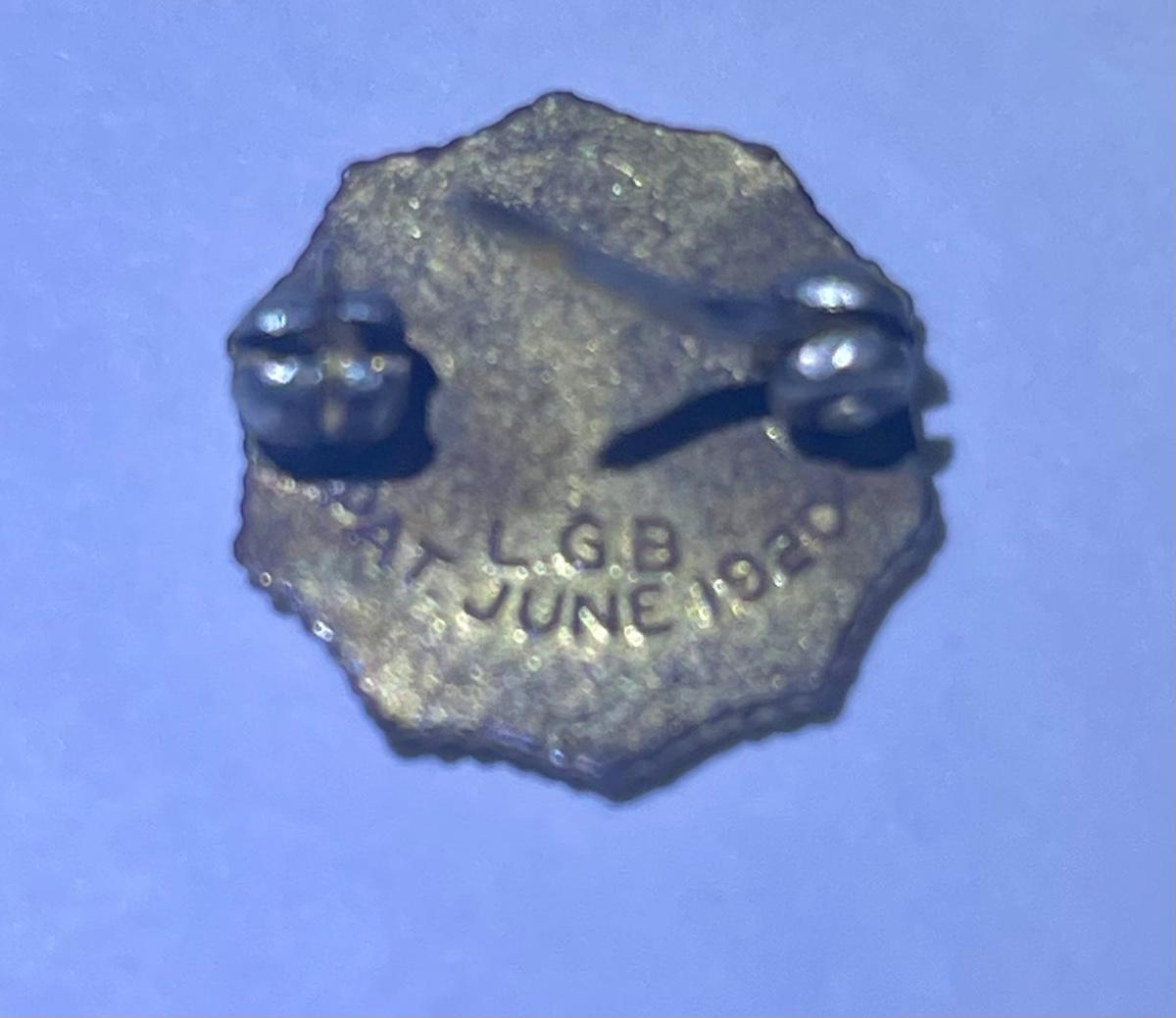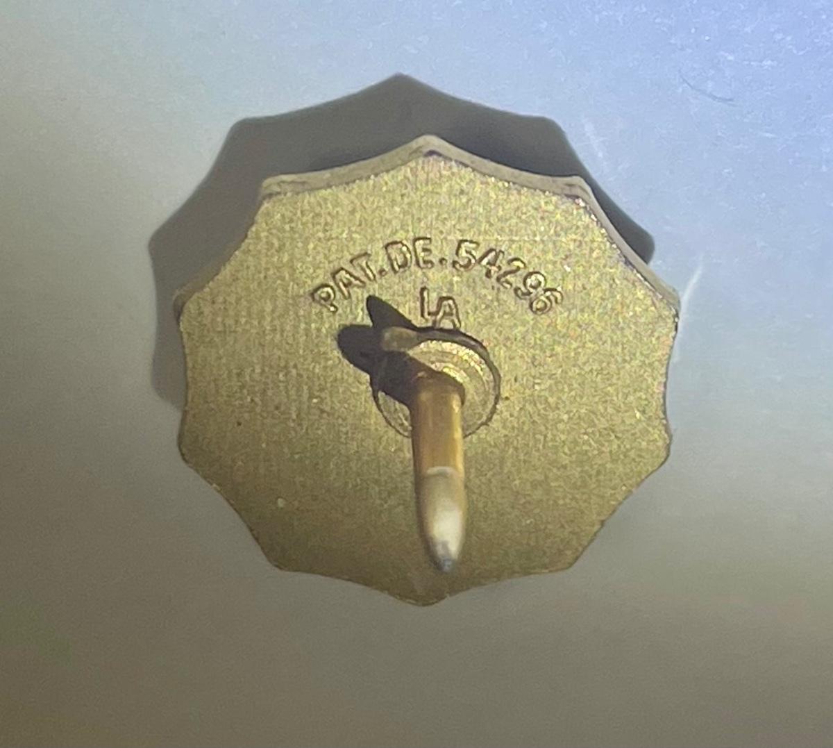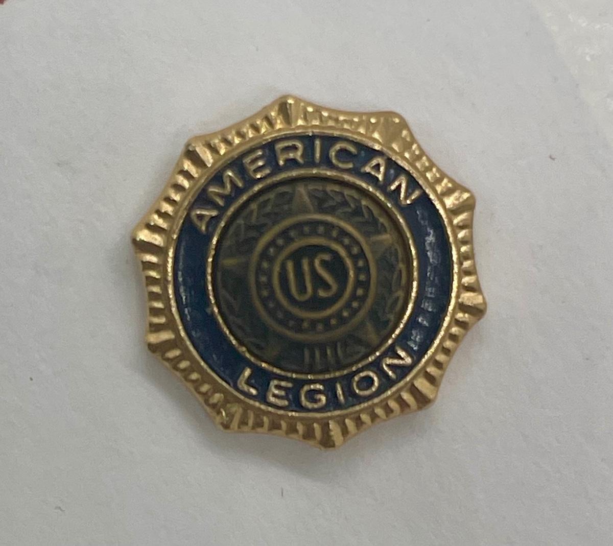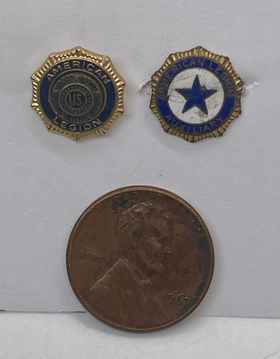Men’s bronze-colored star, blue enamel ring with American Legion in raised gold letters, with gold-colored scallop-edged rim and woman’s auxiliary pin with a blue star inside a white circle, blue enamel ring with American Legion in raised gold letters, with gold-colored scallop-edged rim. Both are in good vintage condition.