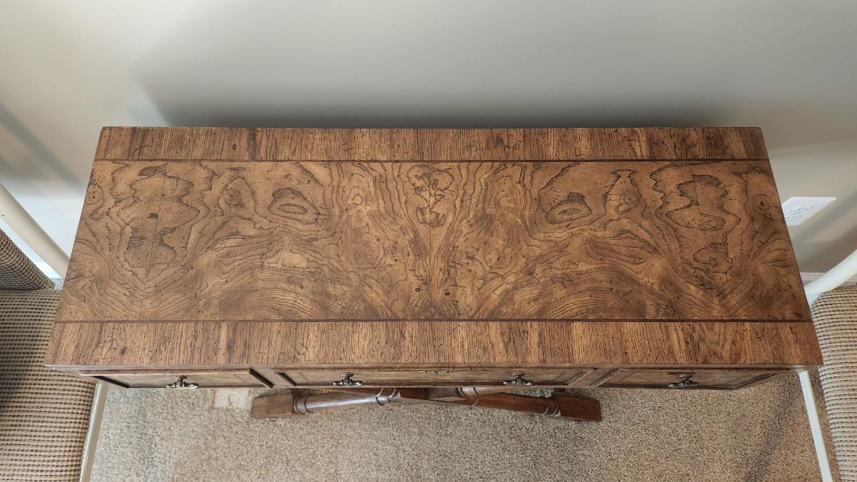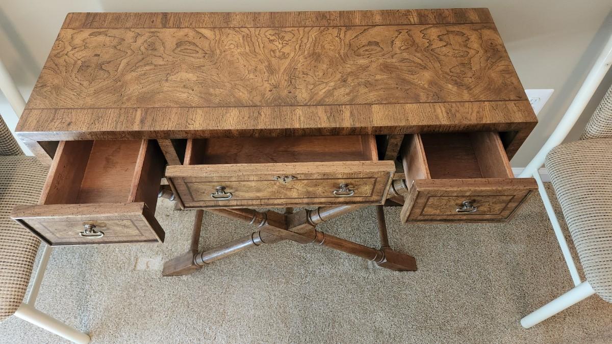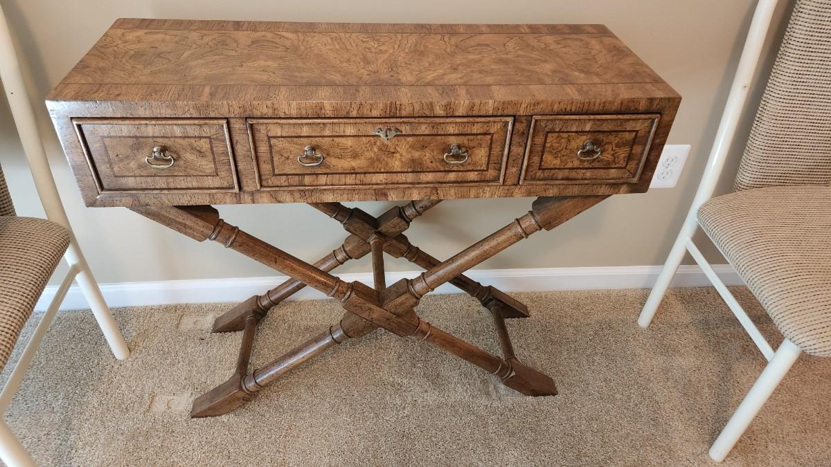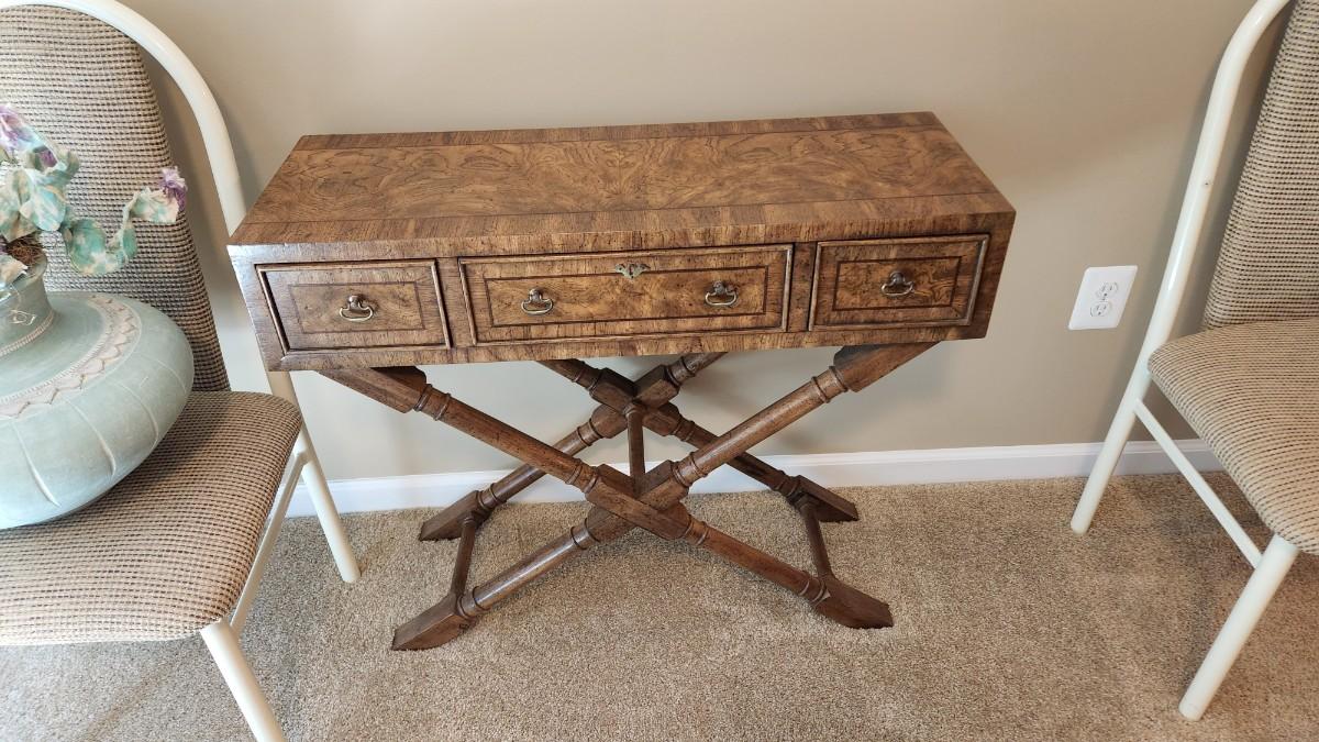 Vintage American of Martinsville Burl Wood X Frame Console Table 36"x13"x31"