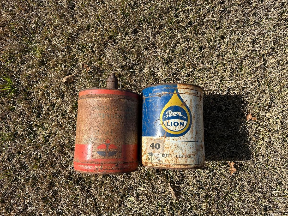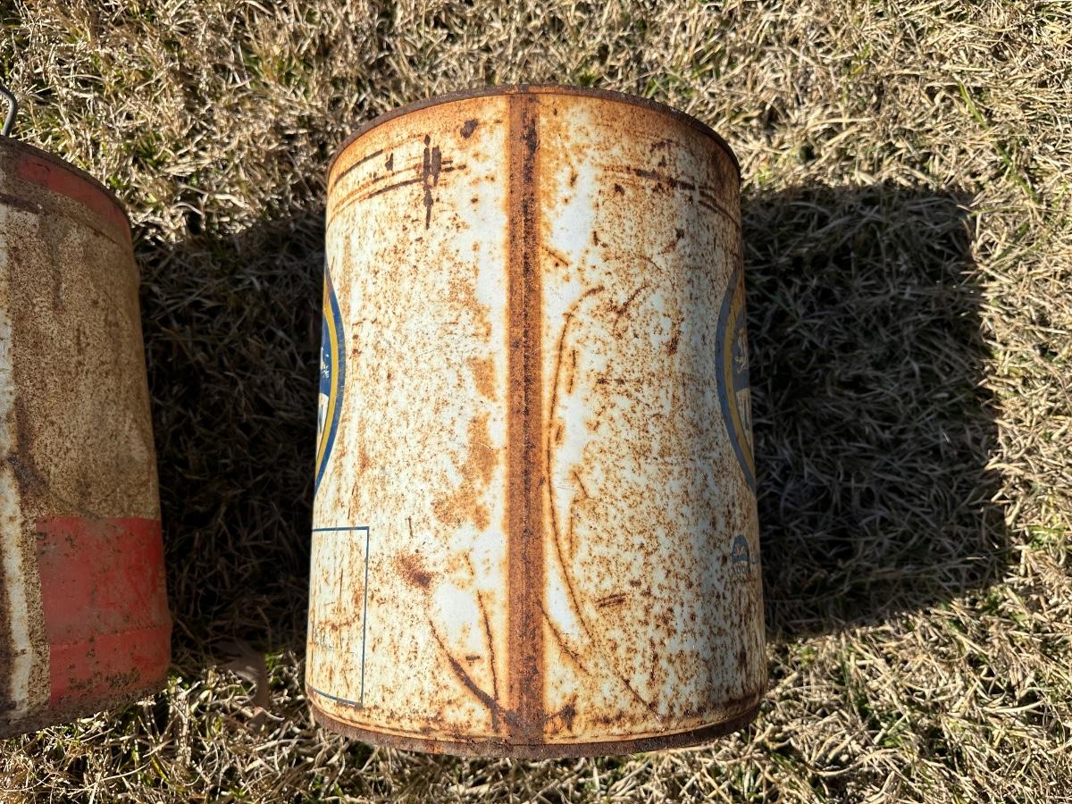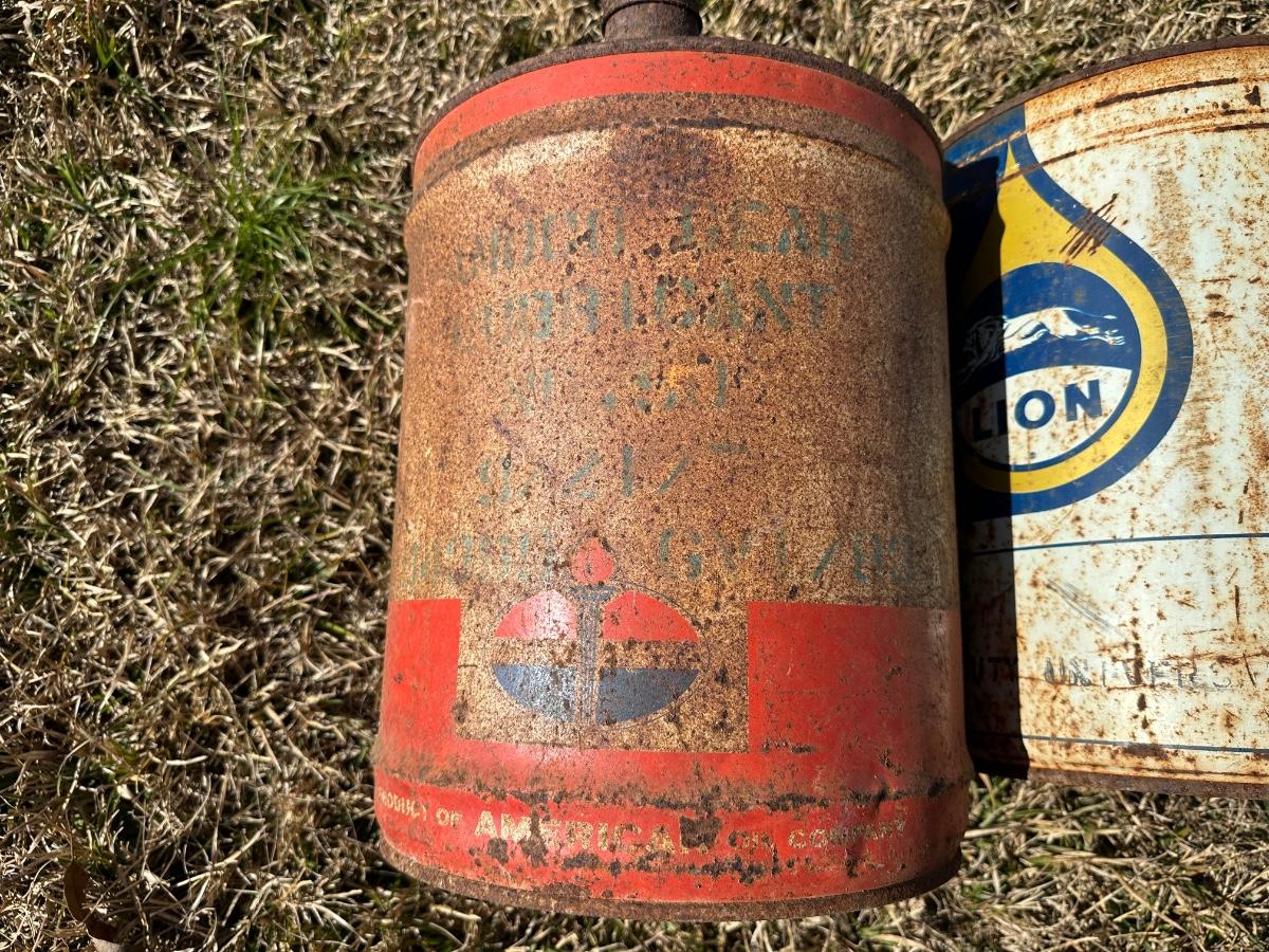 Vintage American Oil Company & Lion Motor Oil Cans – Heavy Duty 5-Gallon Oil Cans (2-Piece Lot)