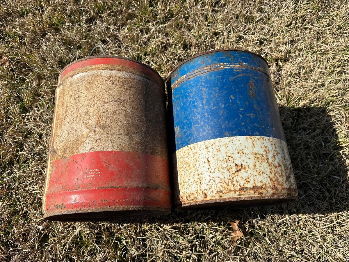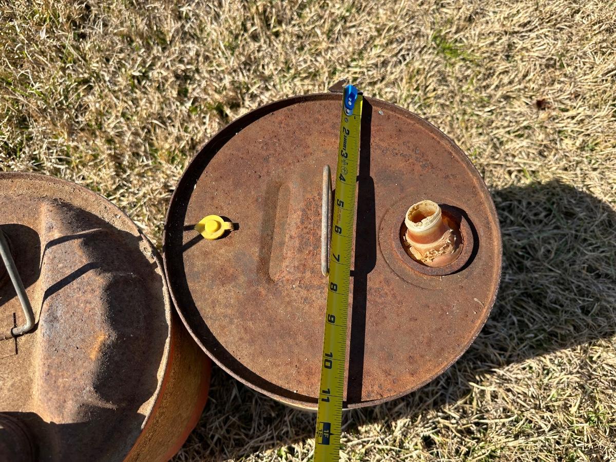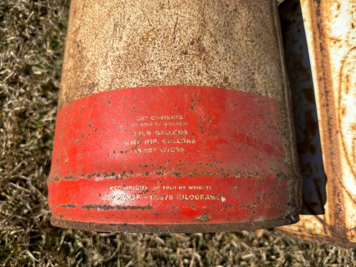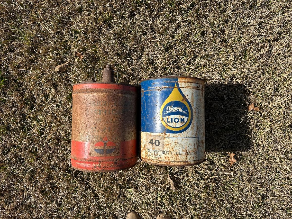 Vintage American Oil Company & Lion Motor Oil Cans – Heavy Duty 5-Gallon Oil Cans (2-Piece Lot)