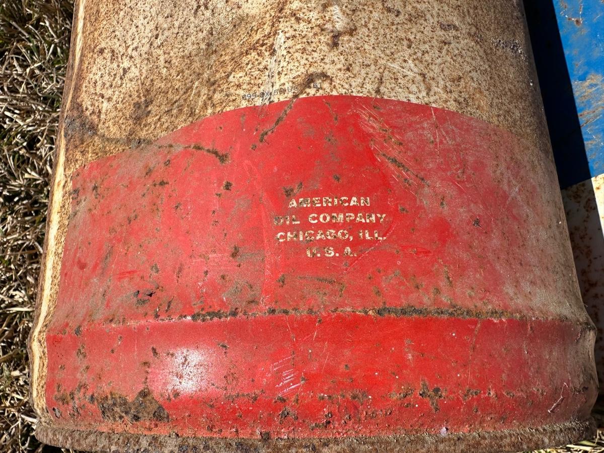 Authentic vintage 5-gallon oil cans featuring American Oil Company and Lion Motor Oil branding. Both cans show original paint, graphics, and heavy age-related patina consistent with early to mid-20th-century industrial use.