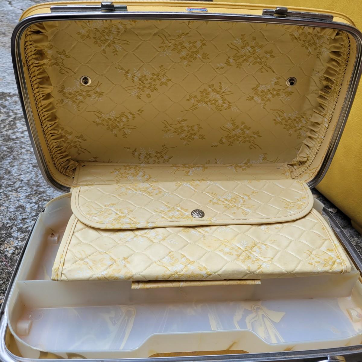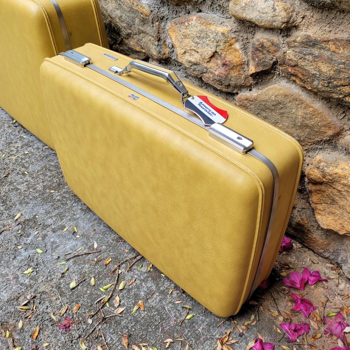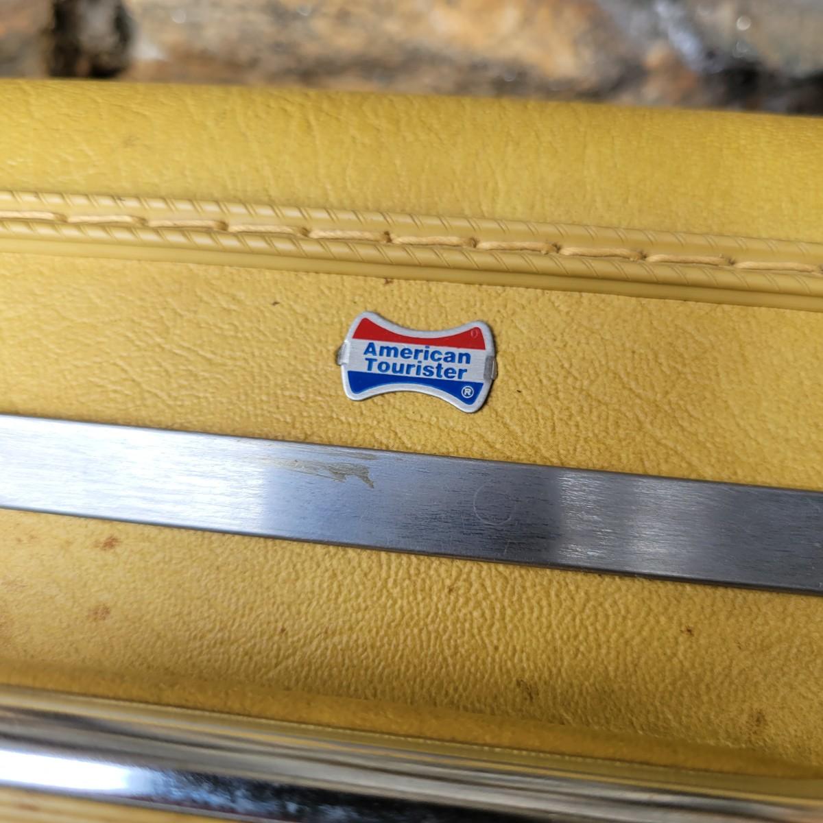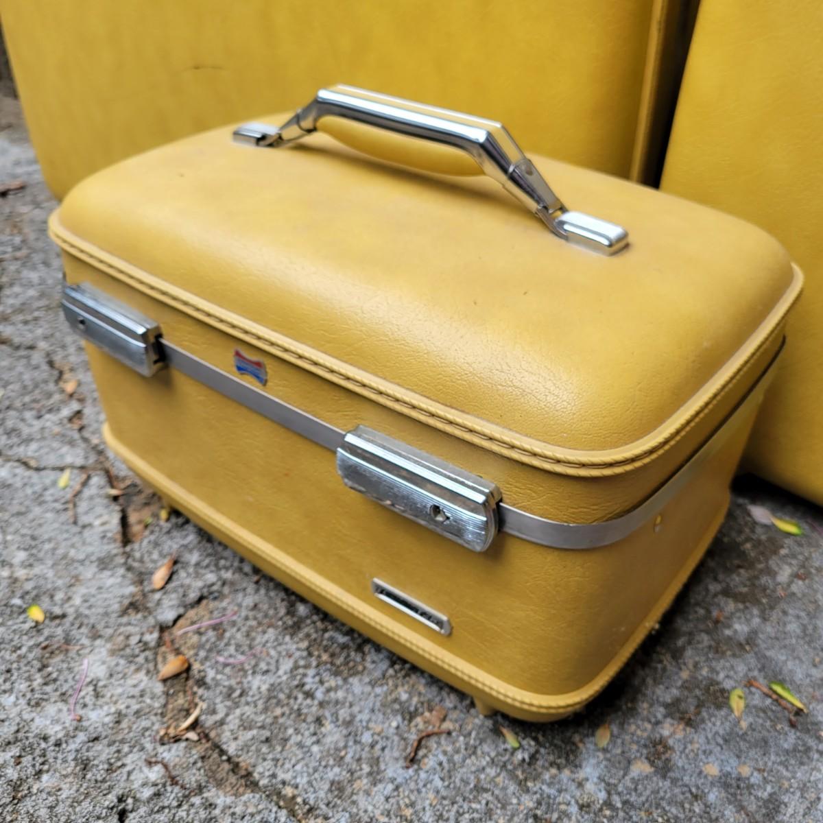 A three piece set of vintage American Tourister luggage in a harvest gold color. Included is a training case with accessories and two larger pieces of luggage. The largest piece measures approximately 27" x 8" x 22"H. Local pickup only