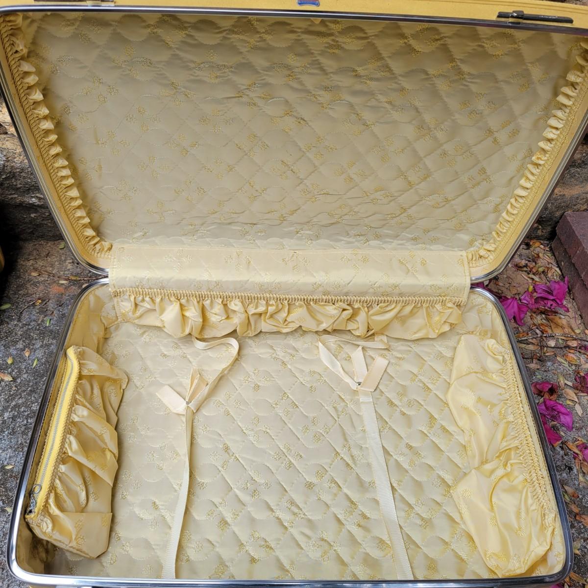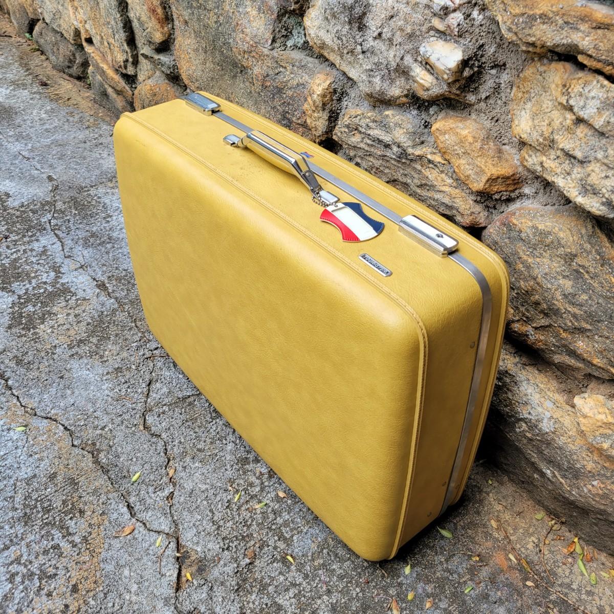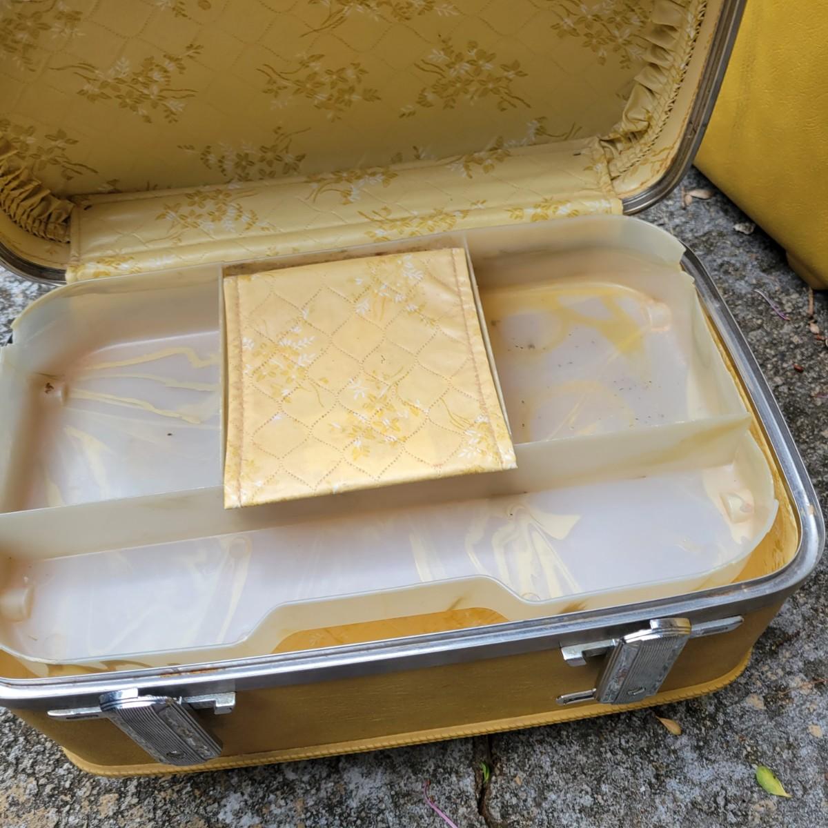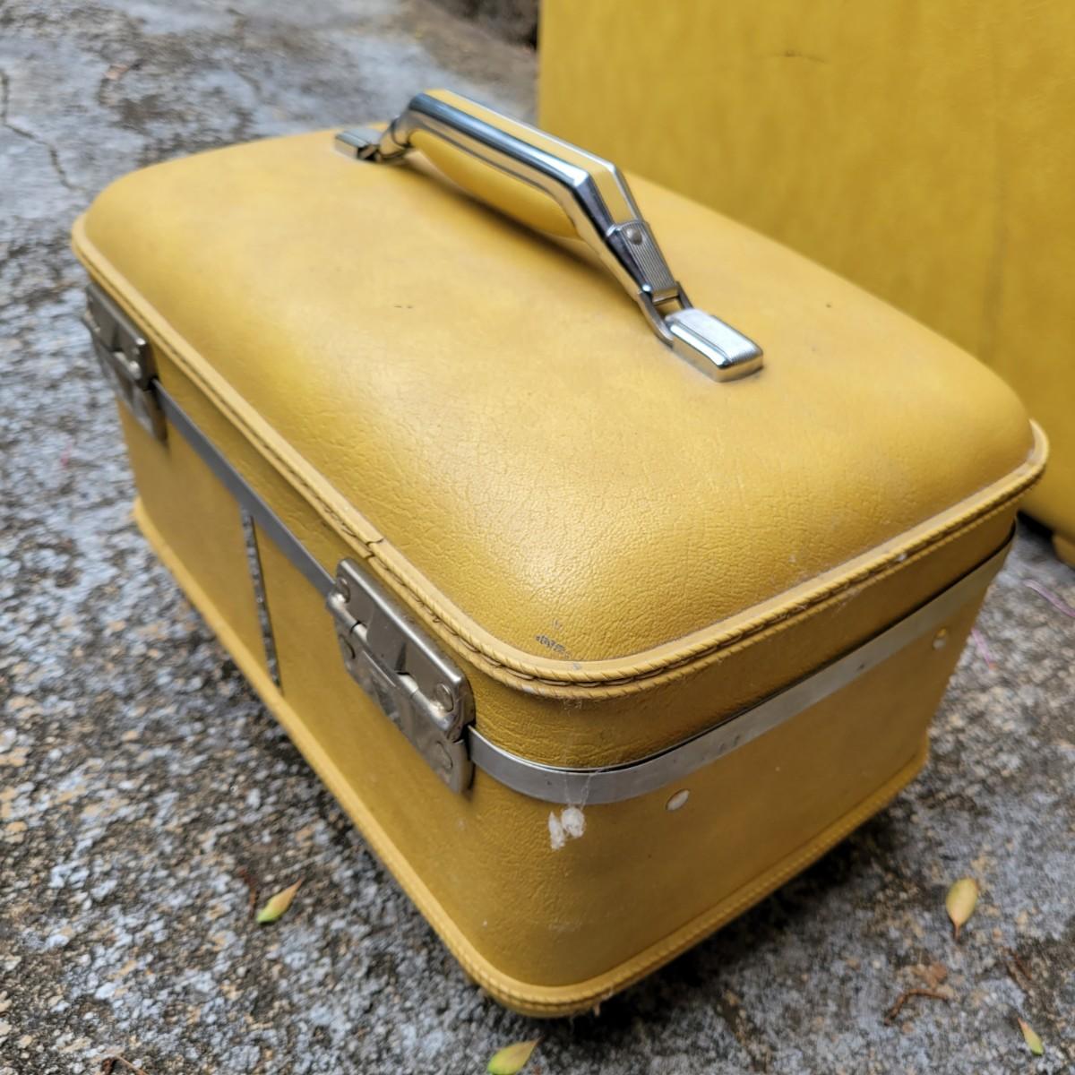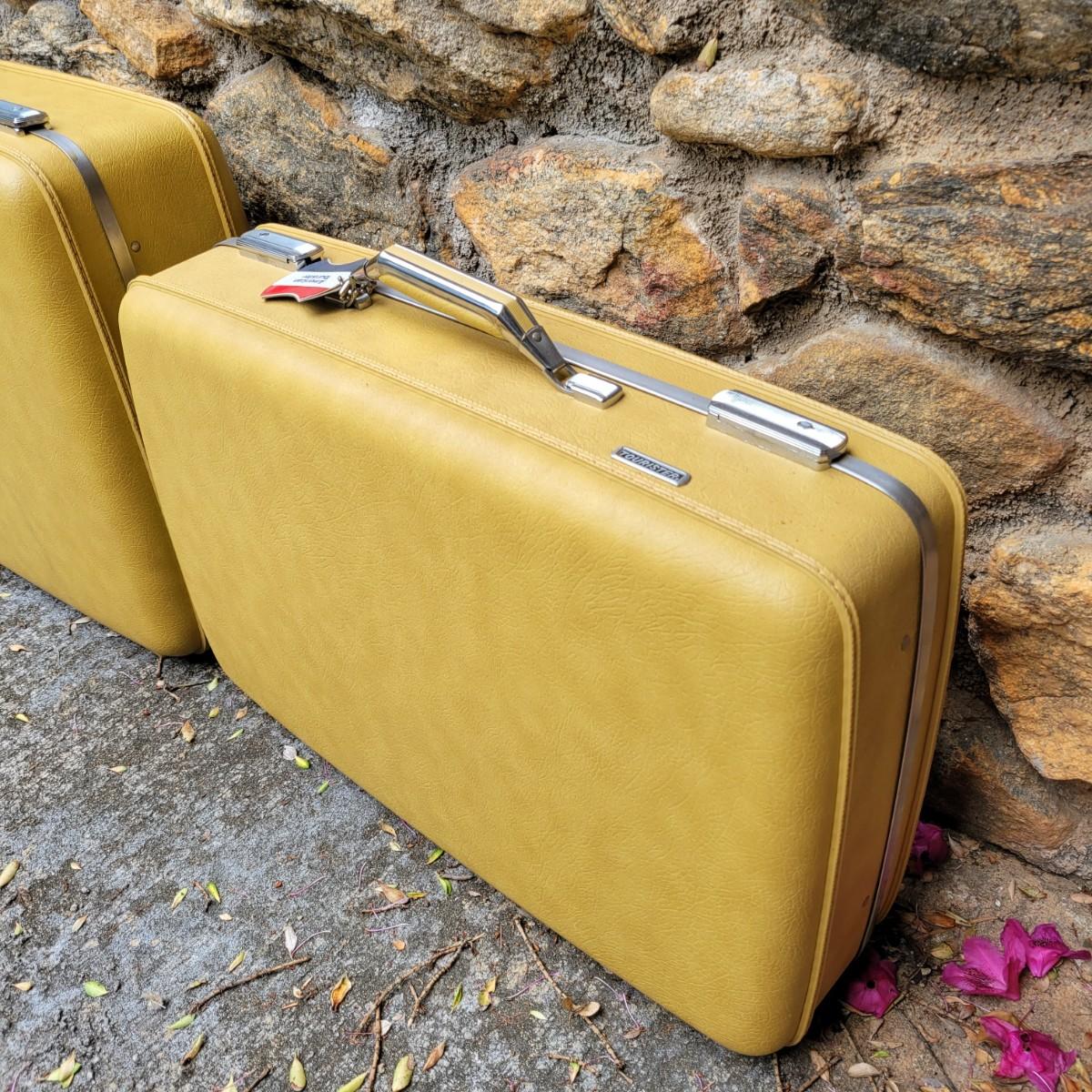 A three piece set of vintage American Tourister luggage in a harvest gold color. Included is a training case with accessories and two larger pieces of luggage. The largest piece measures approximately 27" x 8" x 22"H. Local pickup only