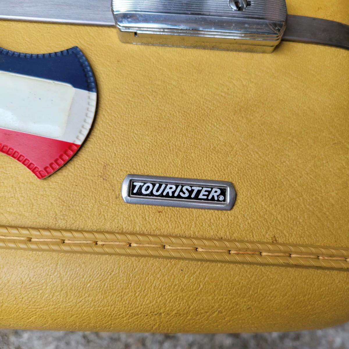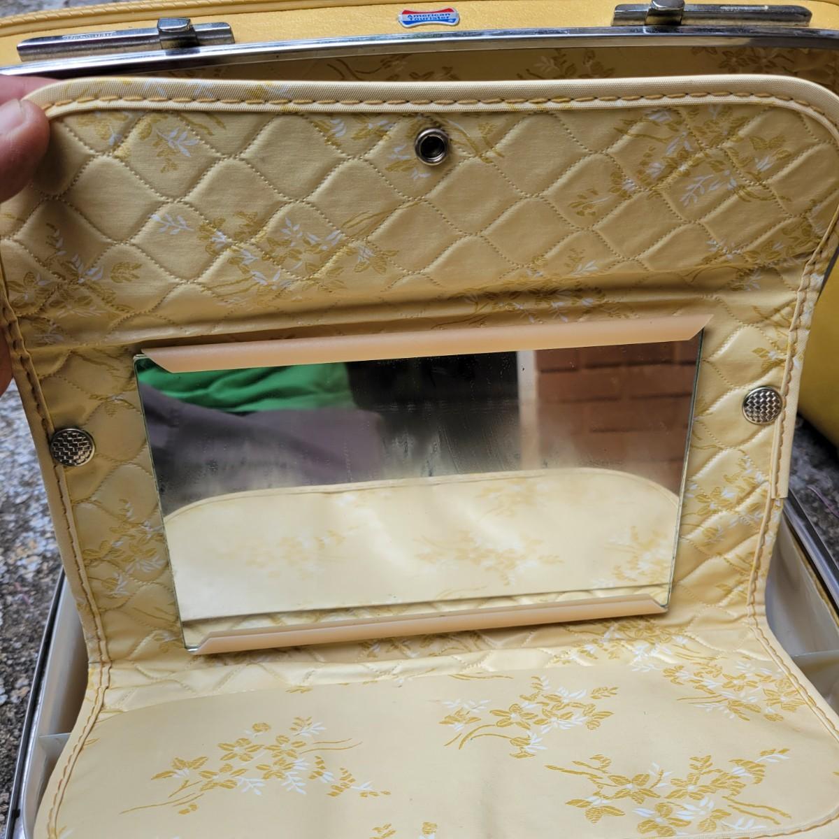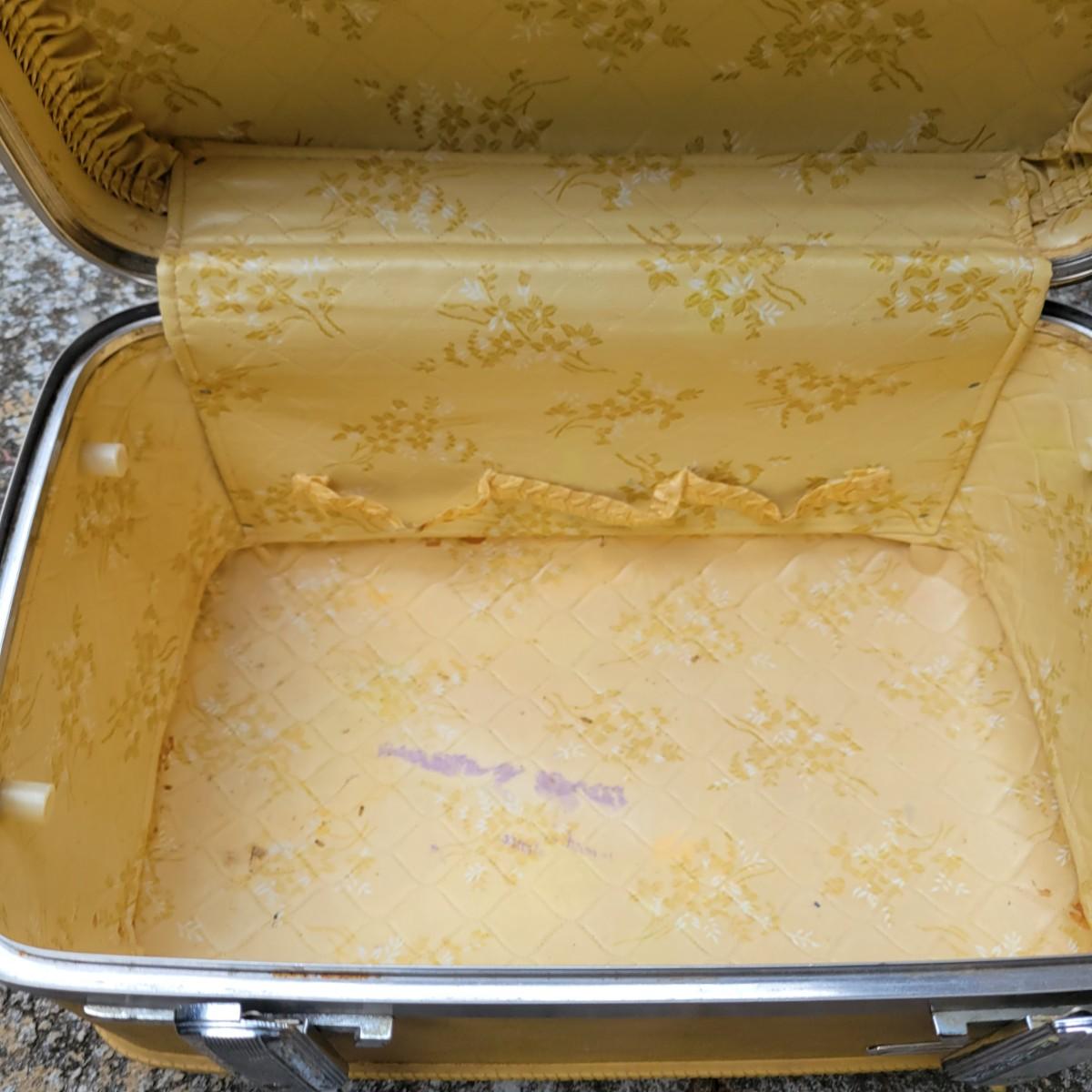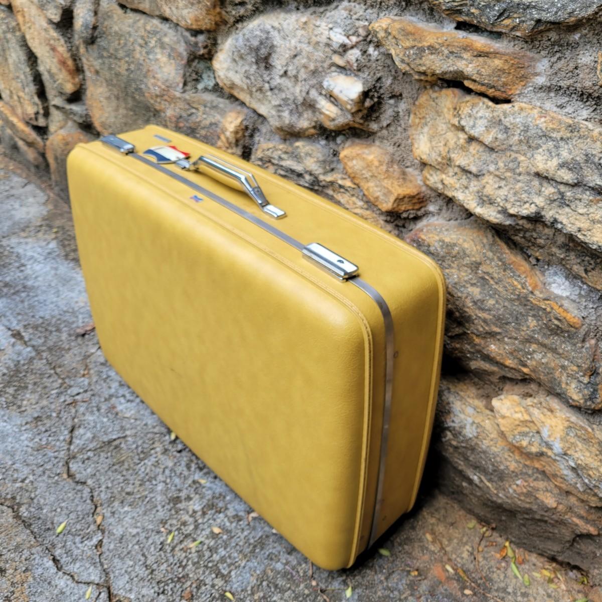 A three piece set of vintage American Tourister luggage in a harvest gold color. Included is a training case with accessories and two larger pieces of luggage. The largest piece measures approximately 27" x 8" x 22"H. Local pickup only