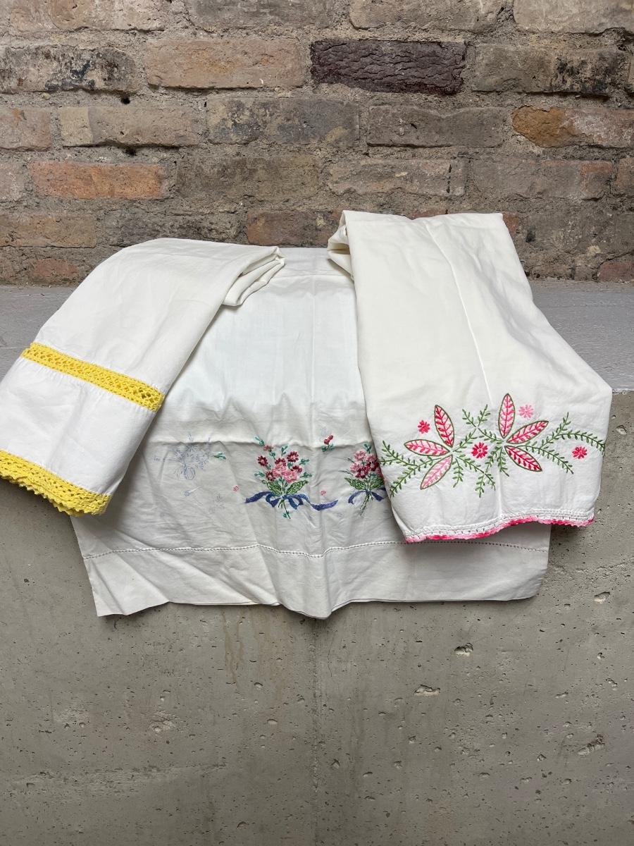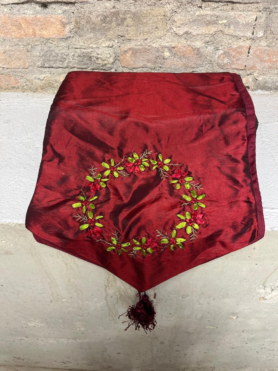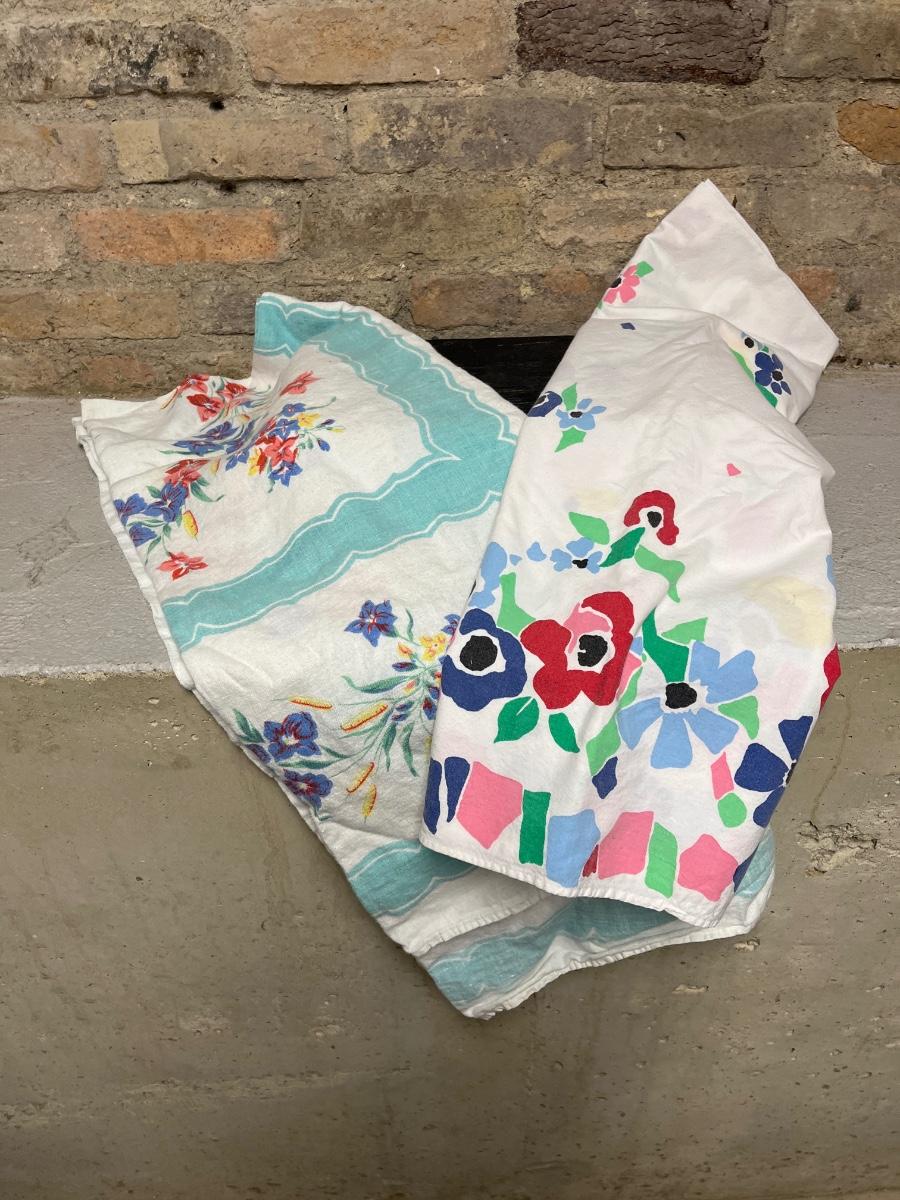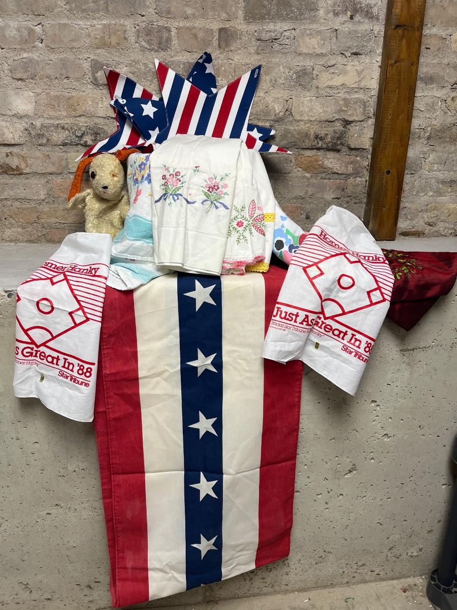 Satiny burgundy runner is 70”, basket from Marcy Blikre of West Fargo, aqua & flowers vintage tablecloth is 45 x 60, flowers/poppies tablecloth is 50 x 55, 3 vintage pillowcases, one is not completed, two 1988 Homer Hankies, five interlocking fabric stars, twenty feet of patriotic bunting, and a very well- loved hand puppet