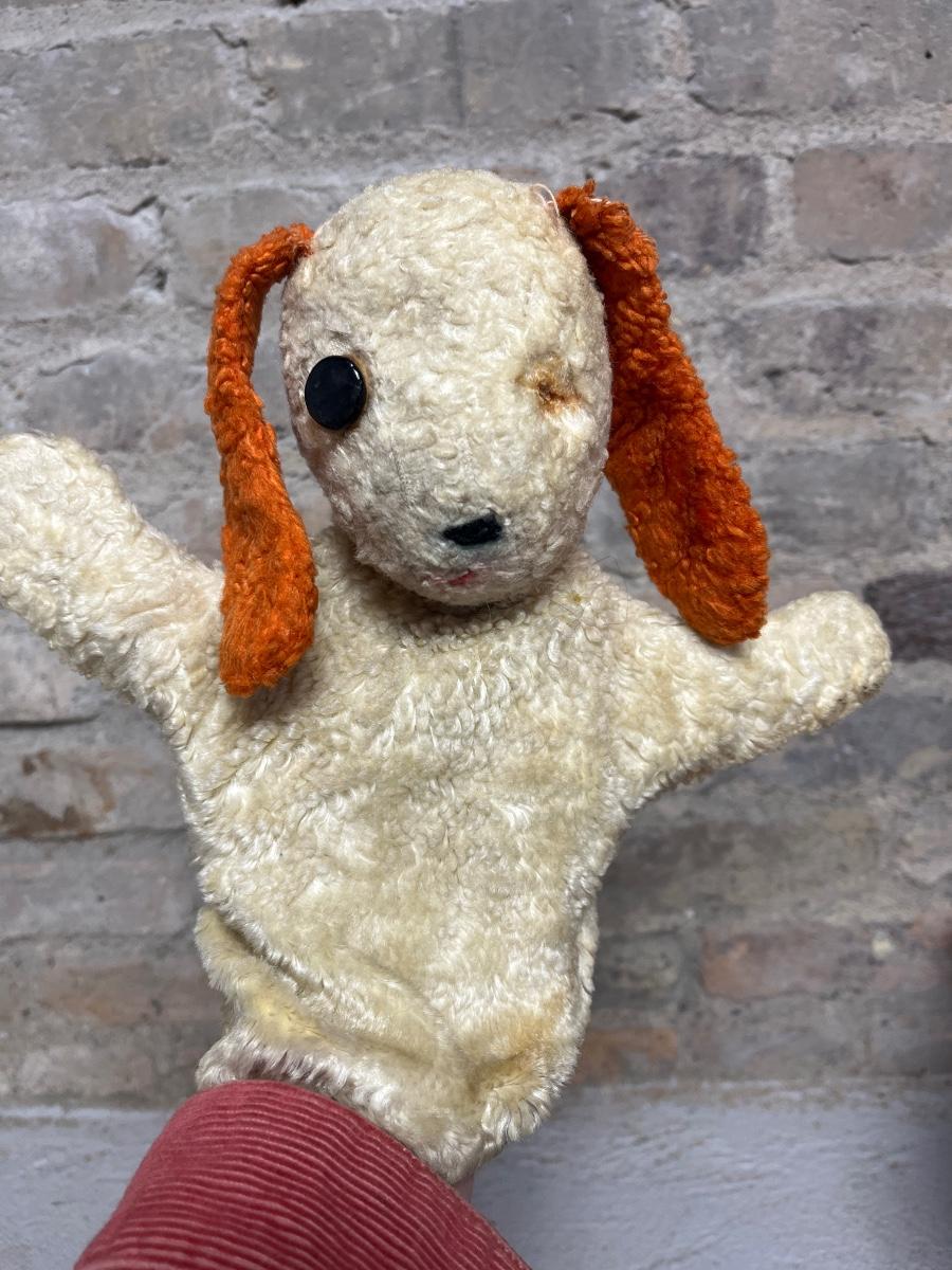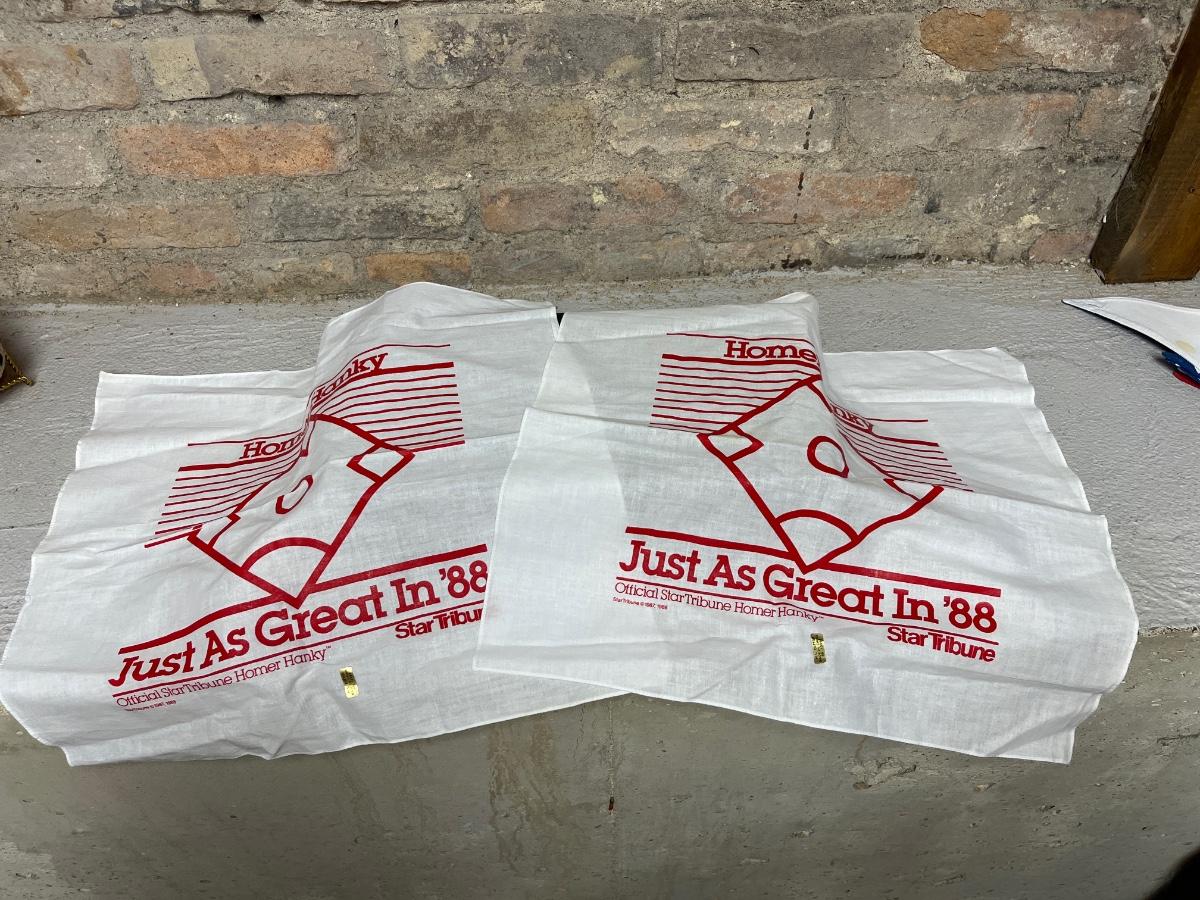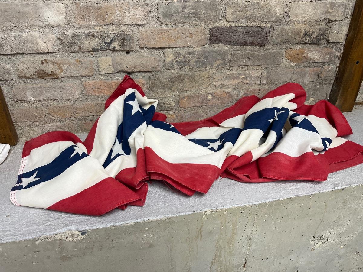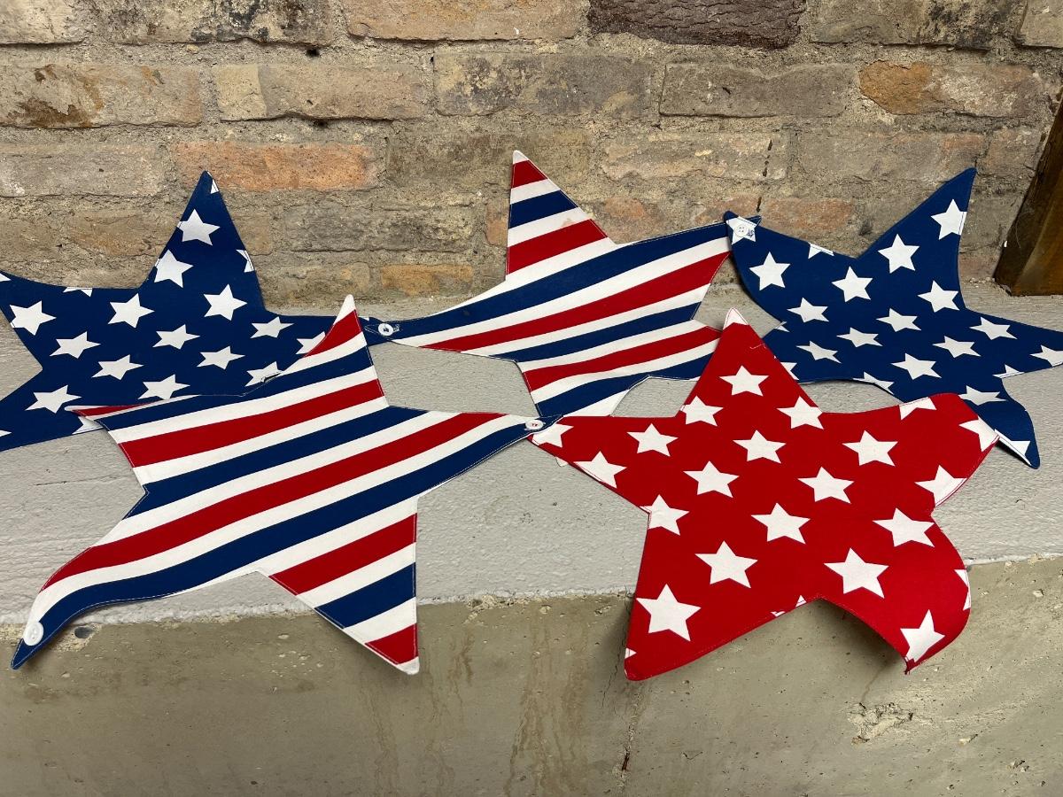 Satiny burgundy runner is 70”, basket from Marcy Blikre of West Fargo, aqua & flowers vintage tablecloth is 45 x 60, flowers/poppies tablecloth is 50 x 55, 3 vintage pillowcases, one is not completed, two 1988 Homer Hankies, five interlocking fabric stars, twenty feet of patriotic bunting, and a very well- loved hand puppet