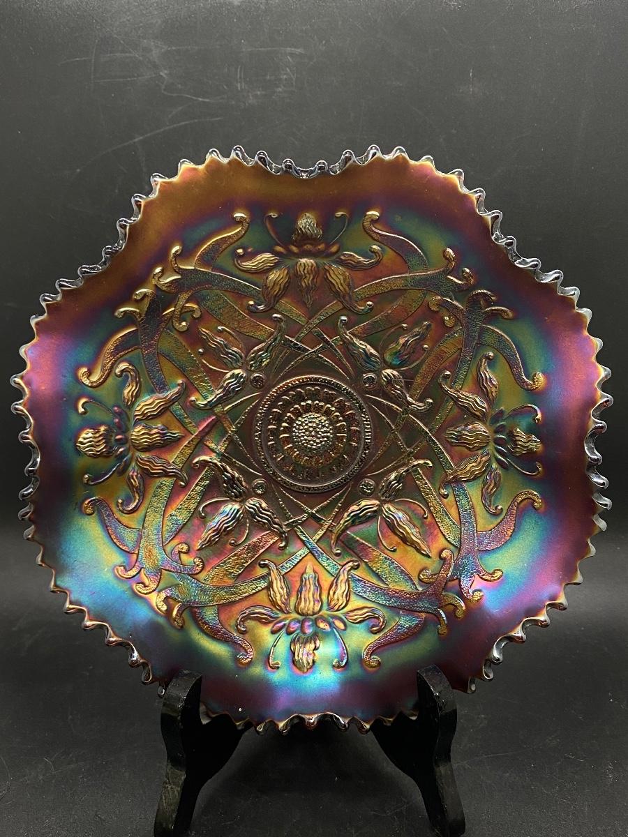 Vintage Northwood amethyst carnival glass bowl. Footed ruffled bowl in Wishbone pattern. In good condition, no chips. About 9" size.
