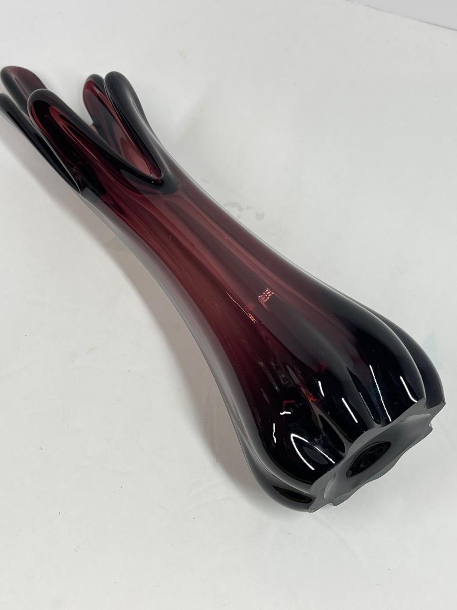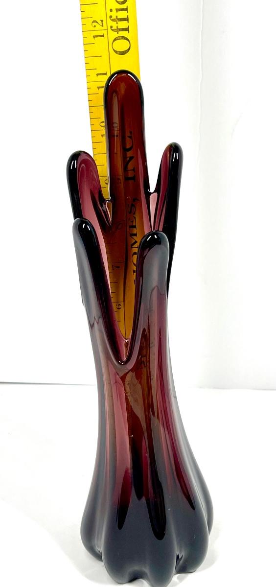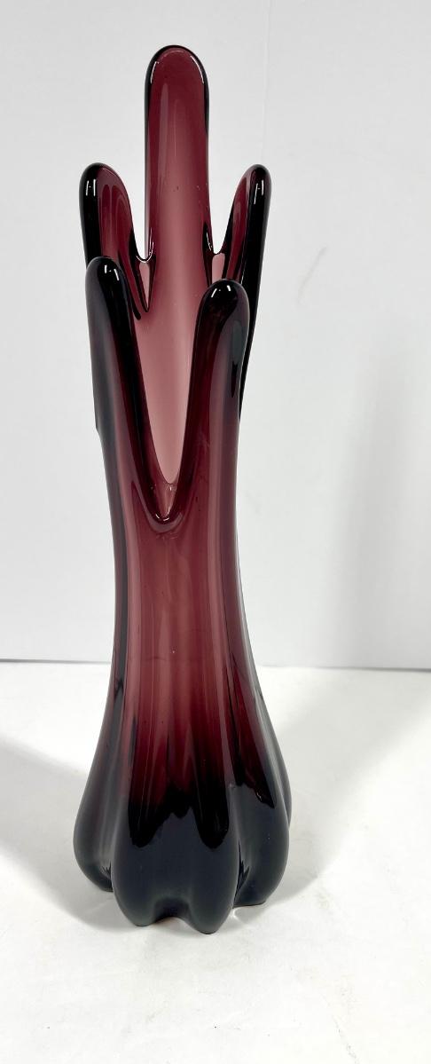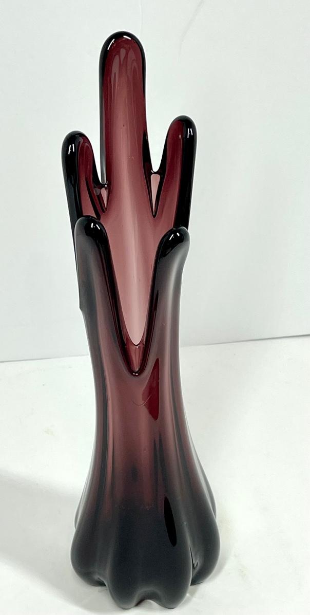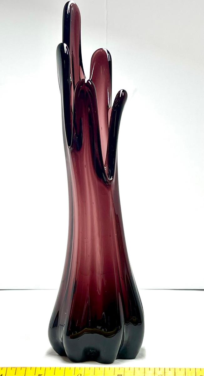 Great 5 finger amethyst vase for the collector of MCM glass. No chips or cracks. 1 small scratch but barely noticeable unless looking for it. Great size and color to add variety to you display!