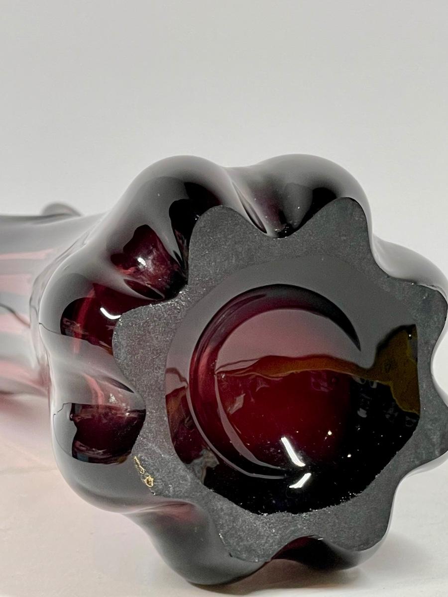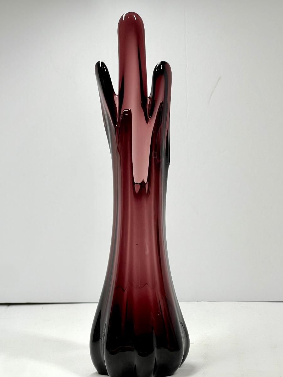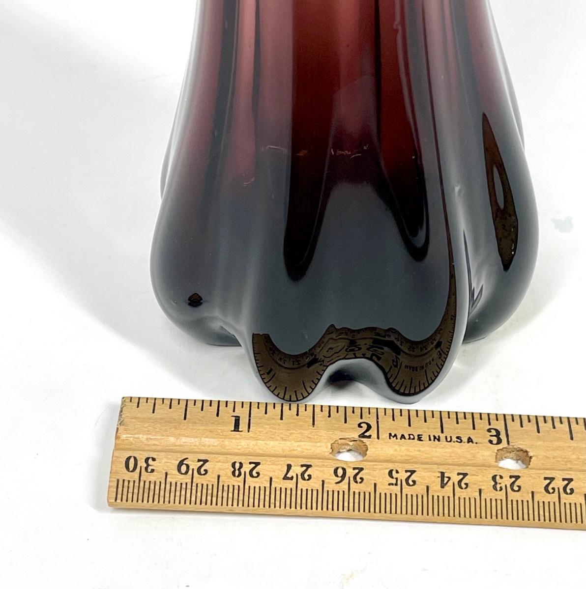 Great 5 finger amethyst vase for the collector of MCM glass. No chips or cracks. 1 small scratch but barely noticeable unless looking for it. Great size and color to add variety to you display!