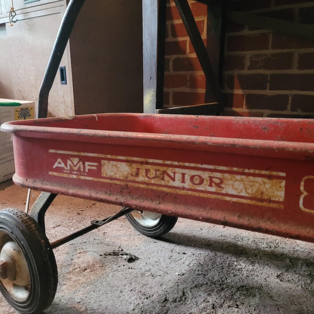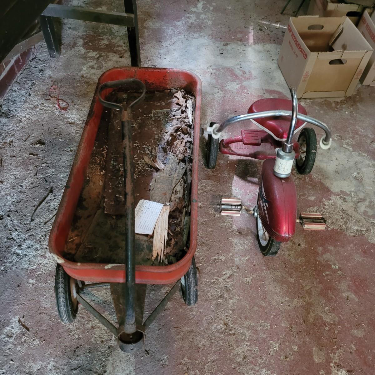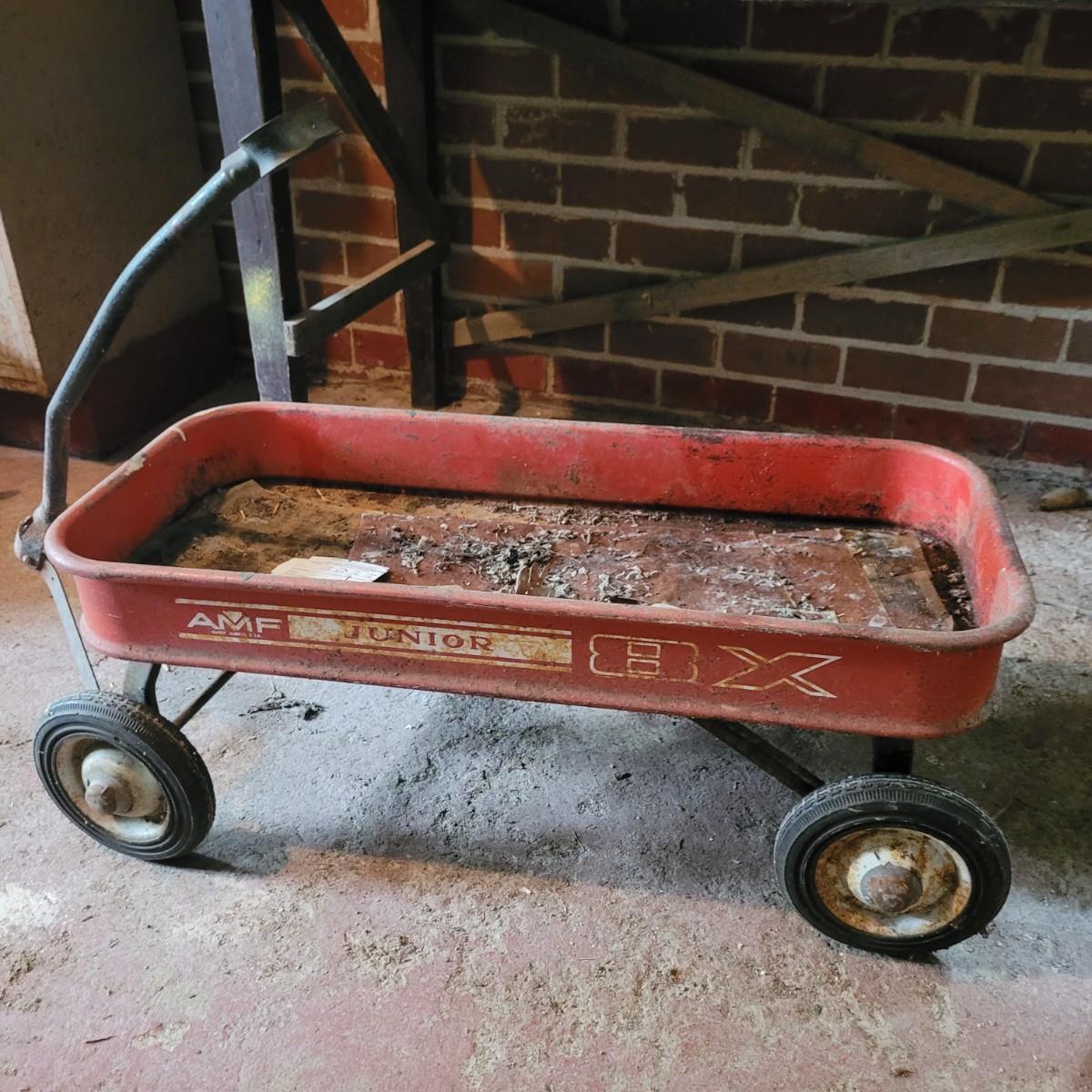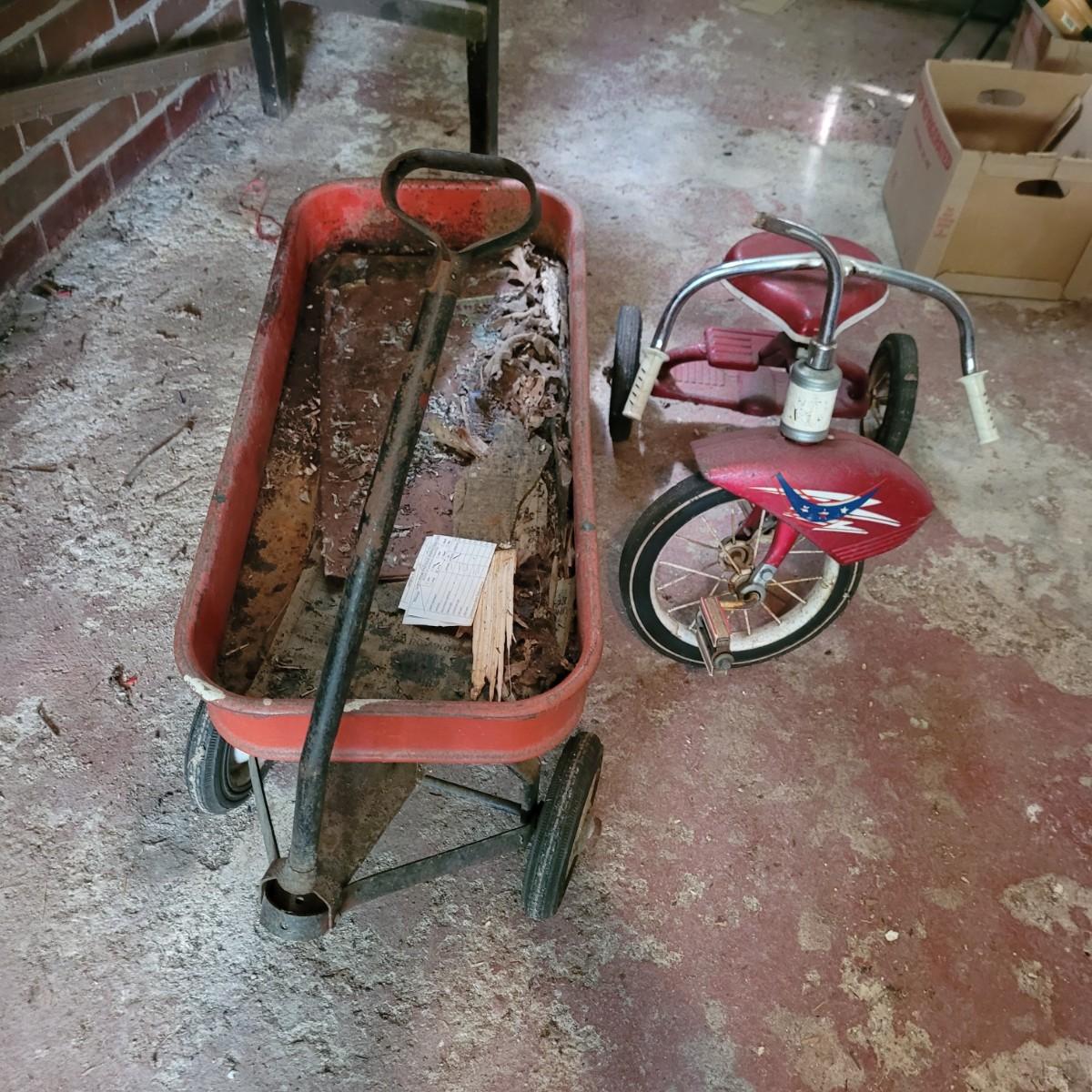 AMF wagon has significant rusting throughout, especially in basin. Handle and axles swivel well. Very loud and squeaky when rolled. Tricycle handlebars broken off, may be able to be reattached. Significant rusting throughout. Rolls well but loud. Wagon measures approximately 34"L x15.5"D x14"H. Tricycle is 27"L x16.5"W x24"H. Seat height 16". Local pickup only.
