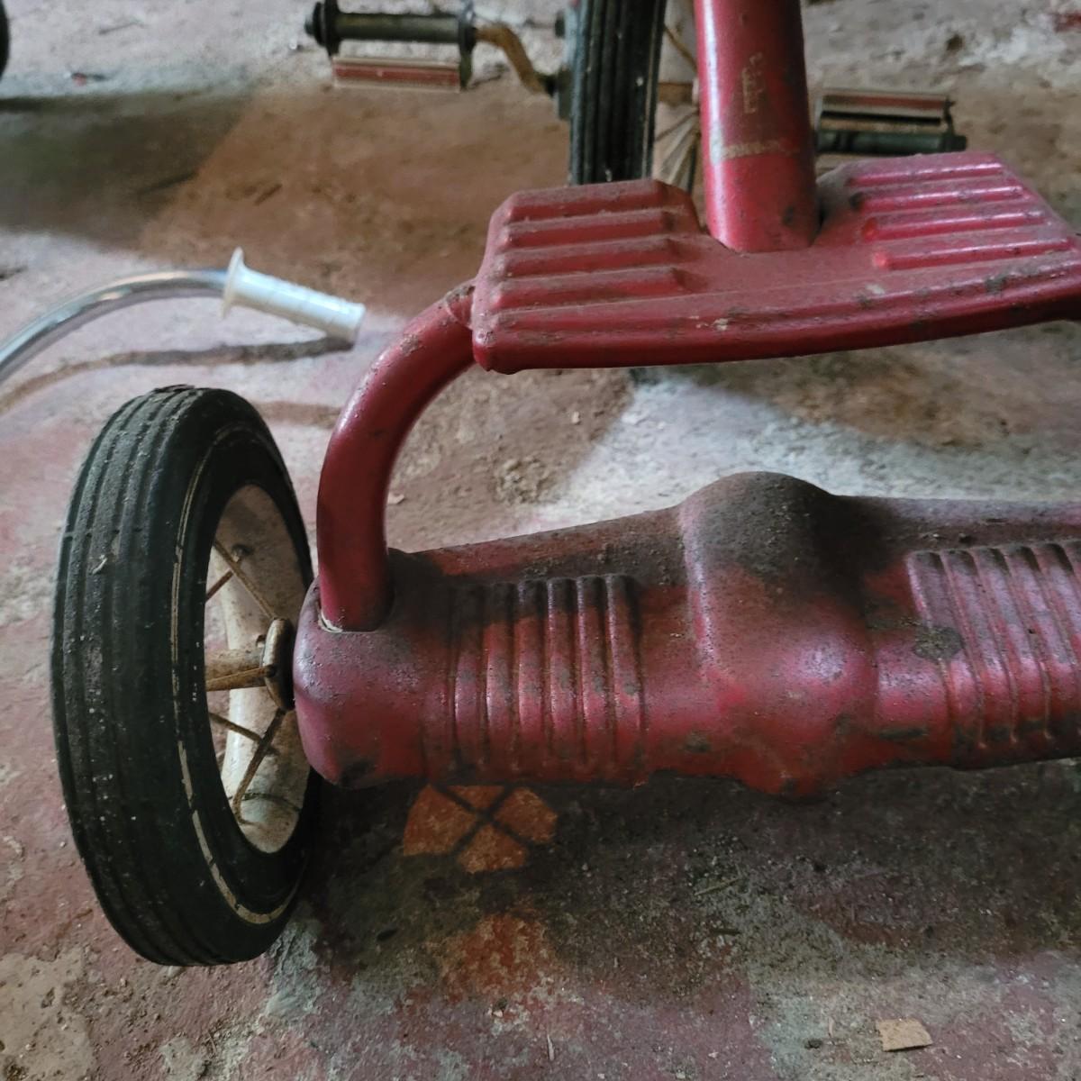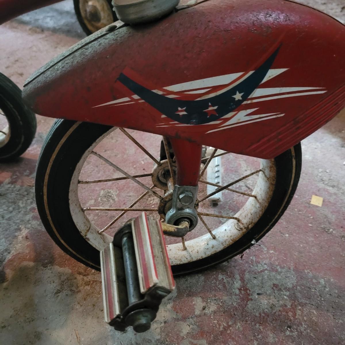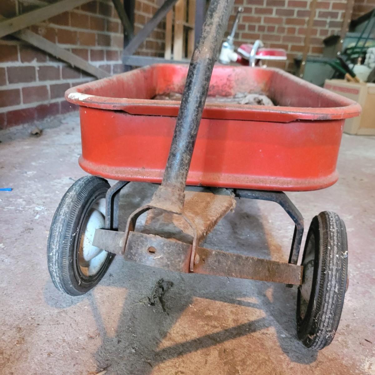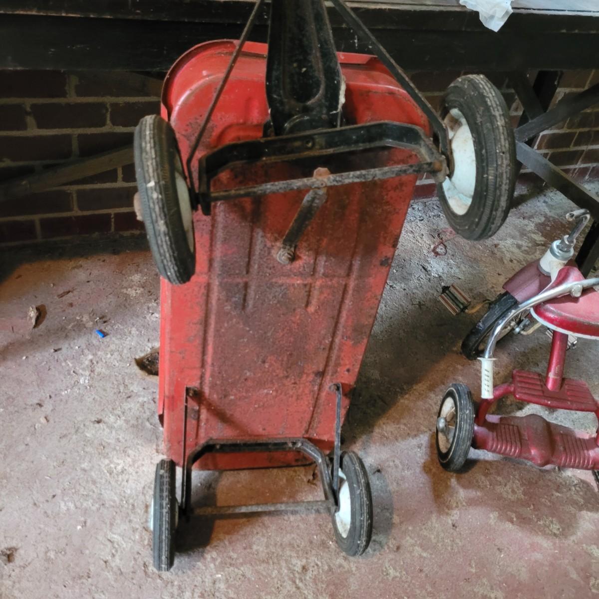 AMF wagon has significant rusting throughout, especially in basin. Handle and axles swivel well. Very loud and squeaky when rolled. Tricycle handlebars broken off, may be able to be reattached. Significant rusting throughout. Rolls well but loud. Wagon measures approximately 34"L x15.5"D x14"H. Tricycle is 27"L x16.5"W x24"H. Seat height 16". Local pickup only.