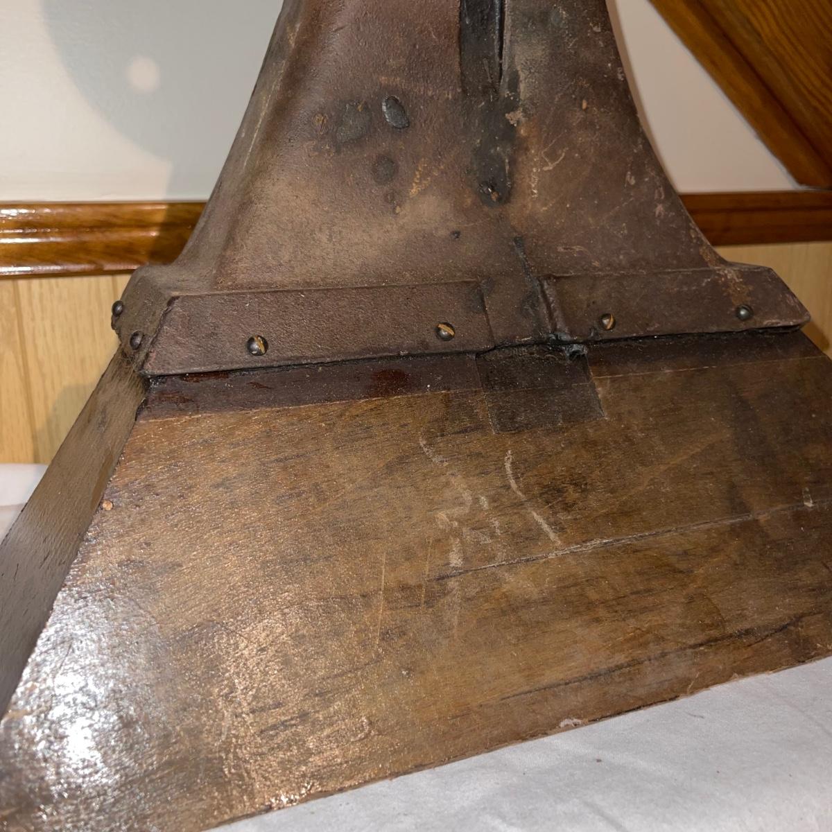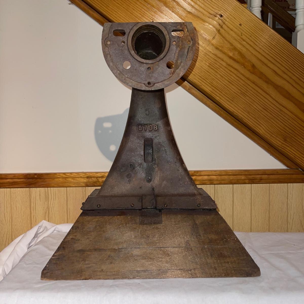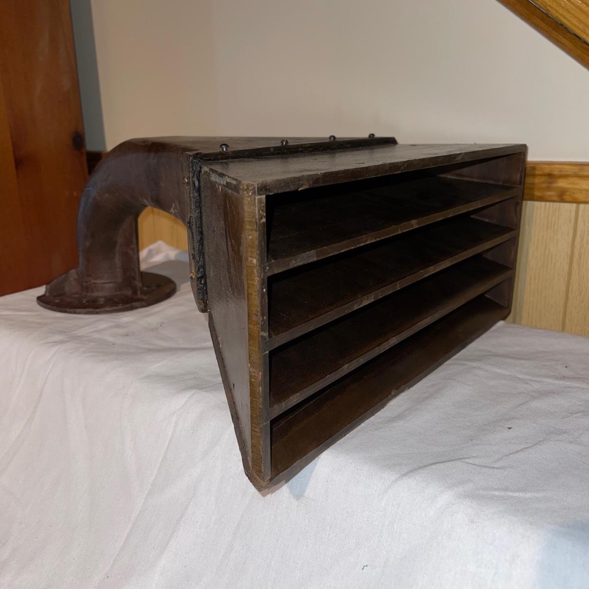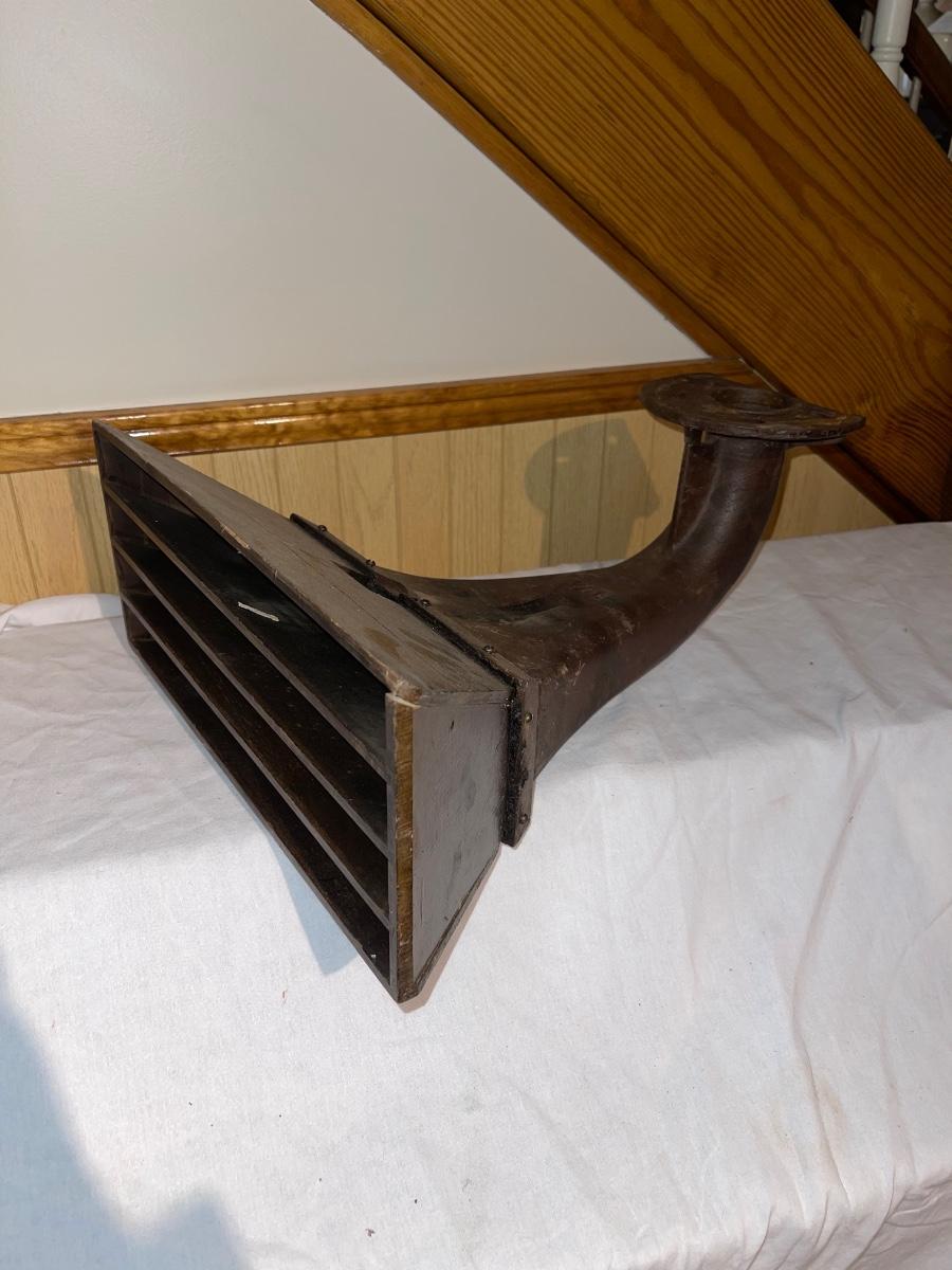 This item appears to be a vintage amplifier or something similar. It has a slightly curved iron base, where it has holes for attachment, and a slatted wooden box top. It measures about 16” tall and 15” wide at its widest part. The underside of the iron part has the numbers “5 and 570B”.