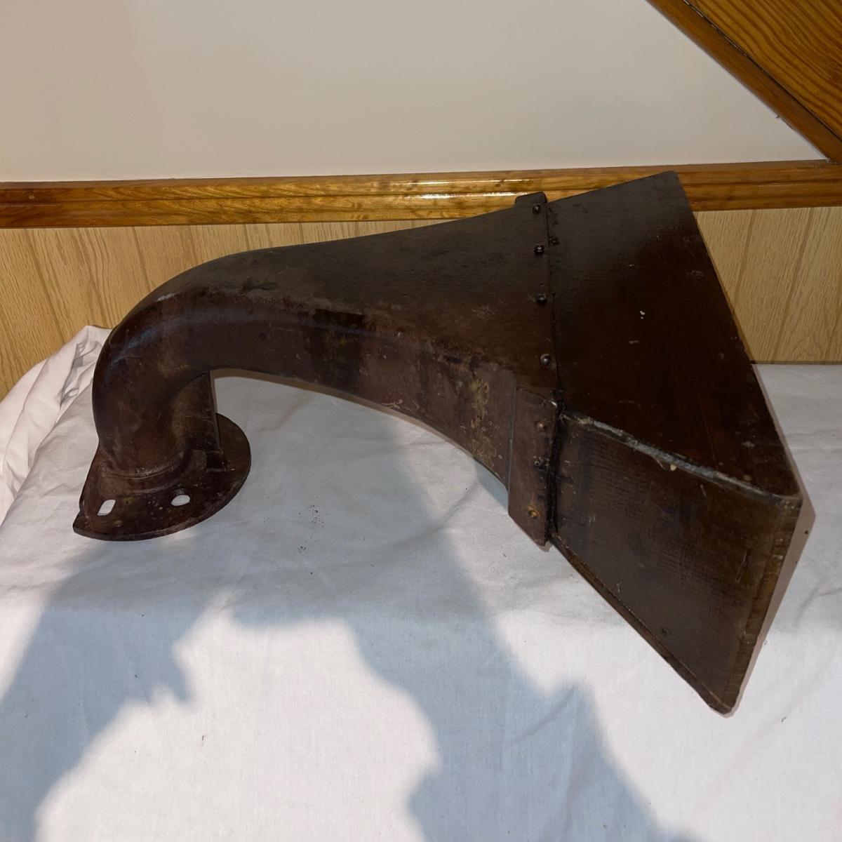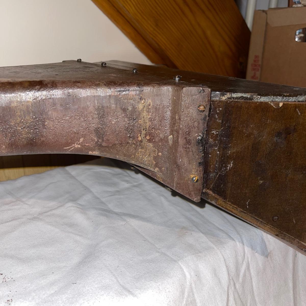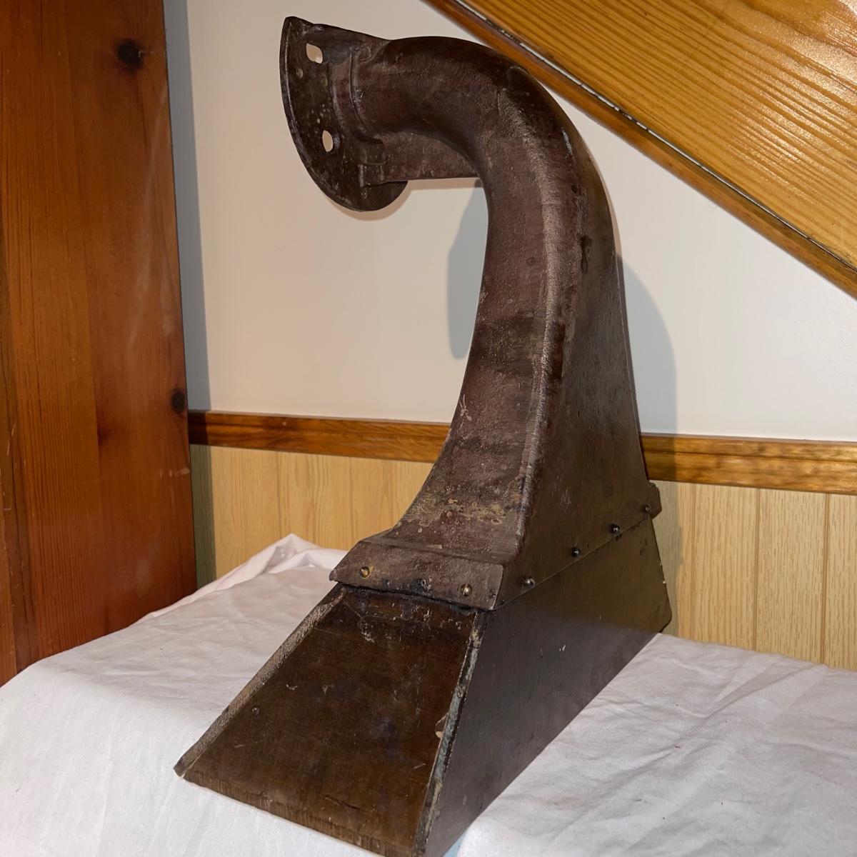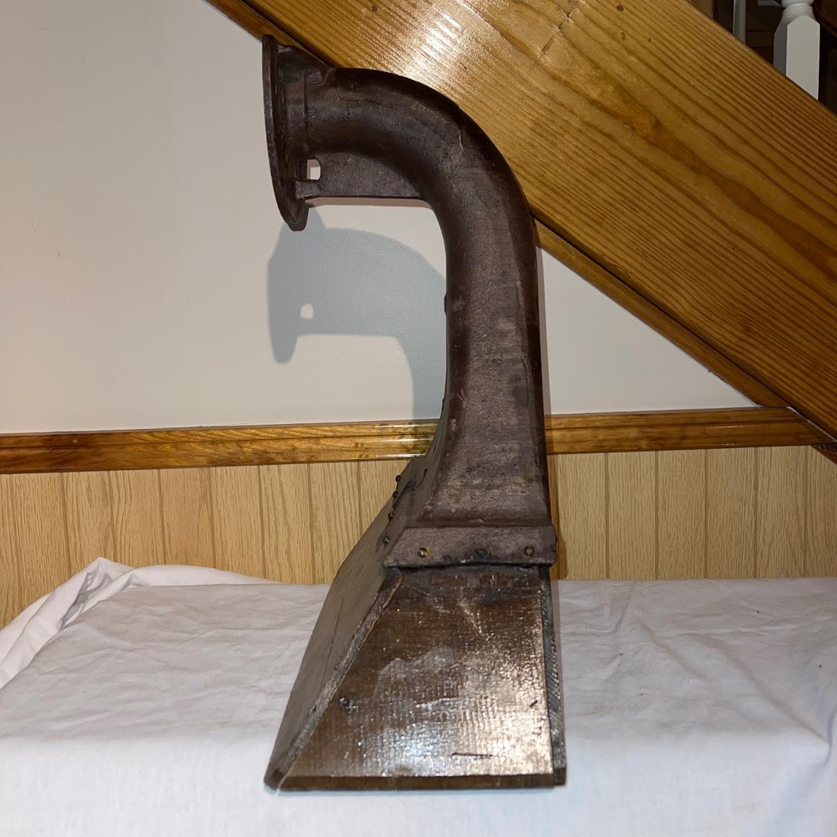 This item appears to be a vintage amplifier or something similar. It has a slightly curved iron base, where it has holes for attachment, and a slatted wooden box top. It measures about 16” tall and 15” wide at its widest part. The underside of the iron part has the numbers “5 and 570B”.