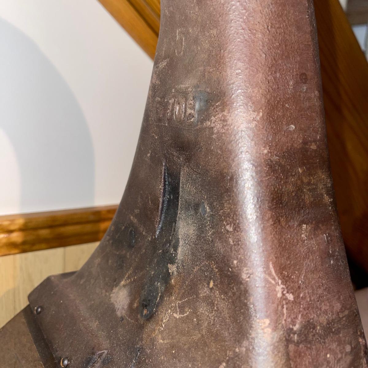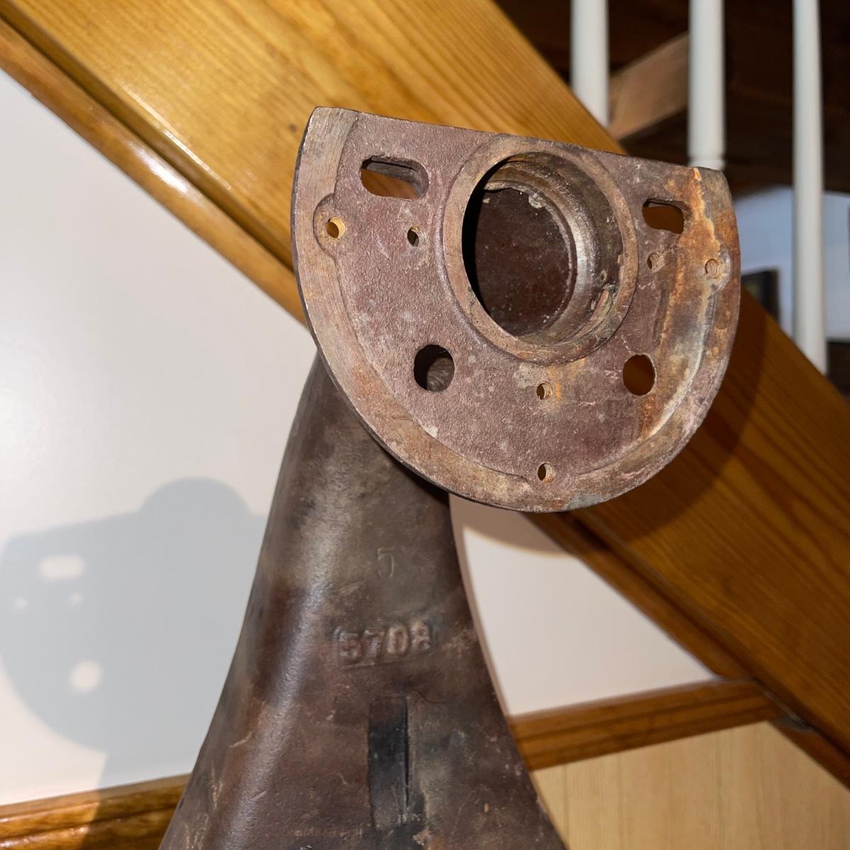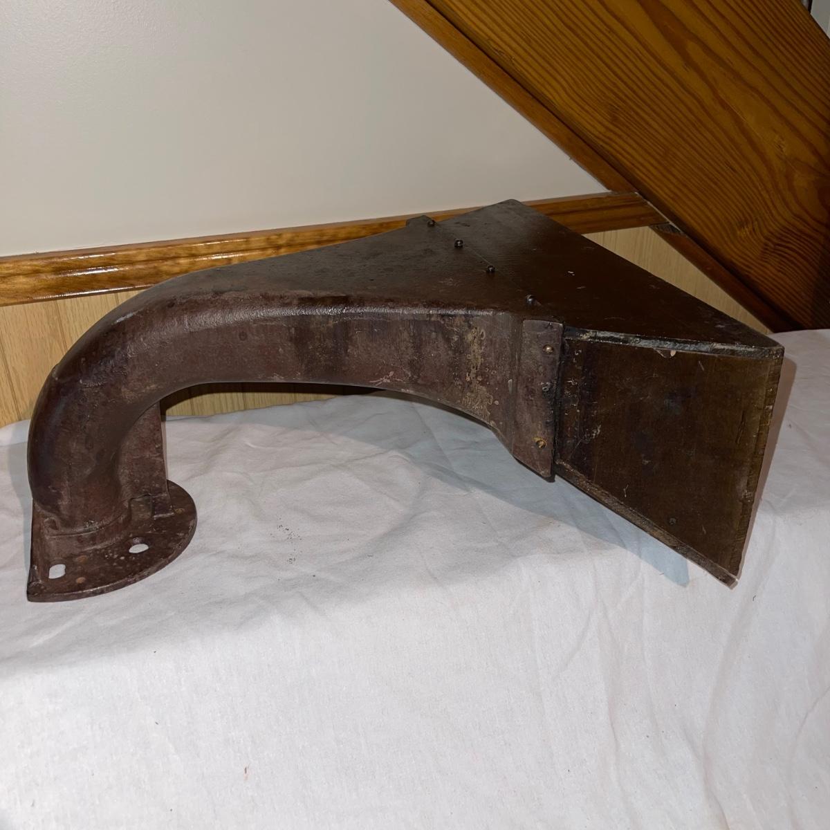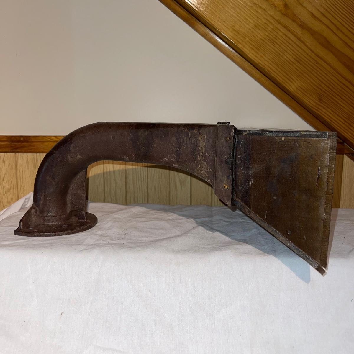 This item appears to be a vintage amplifier or something similar. It has a slightly curved iron base, where it has holes for attachment, and a slatted wooden box top. It measures about 16” tall and 15” wide at its widest part. The underside of the iron part has the numbers “5 and 570B”.