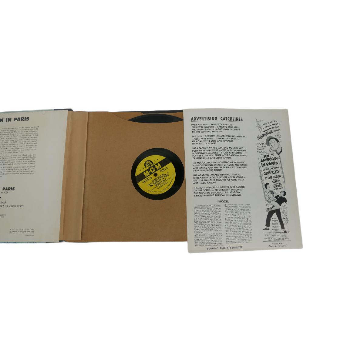Two vintage "An American in Paris" musical with Gene Kelly, Georges Guetary, and Johnny Green. MGM vinyl record sets in 33 rpm Lp and 45 rpms. Good condition. Lot weighs 4 lbs and will be shipped via Media Mail with insurance to the contiguous states. (M35)