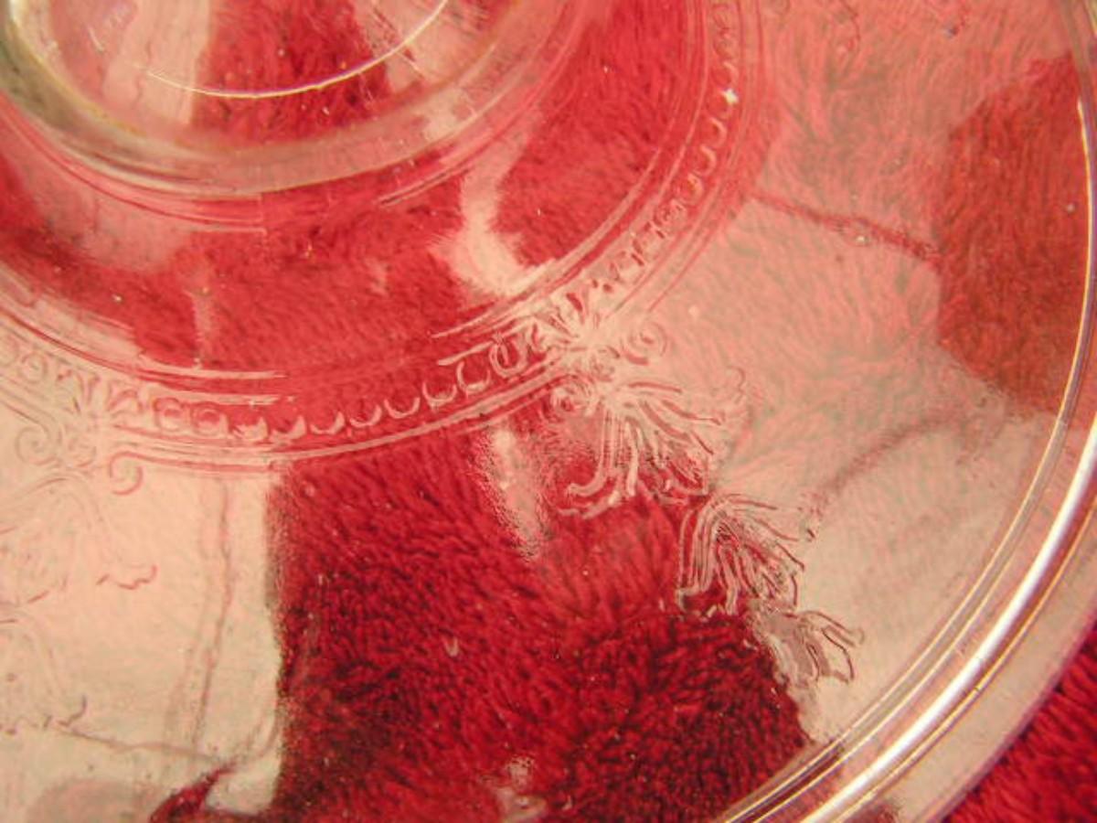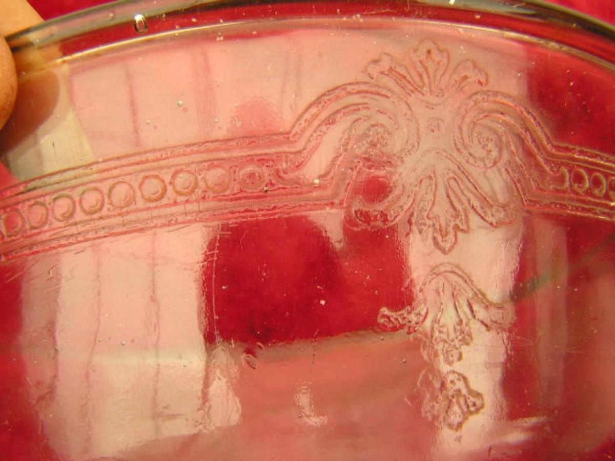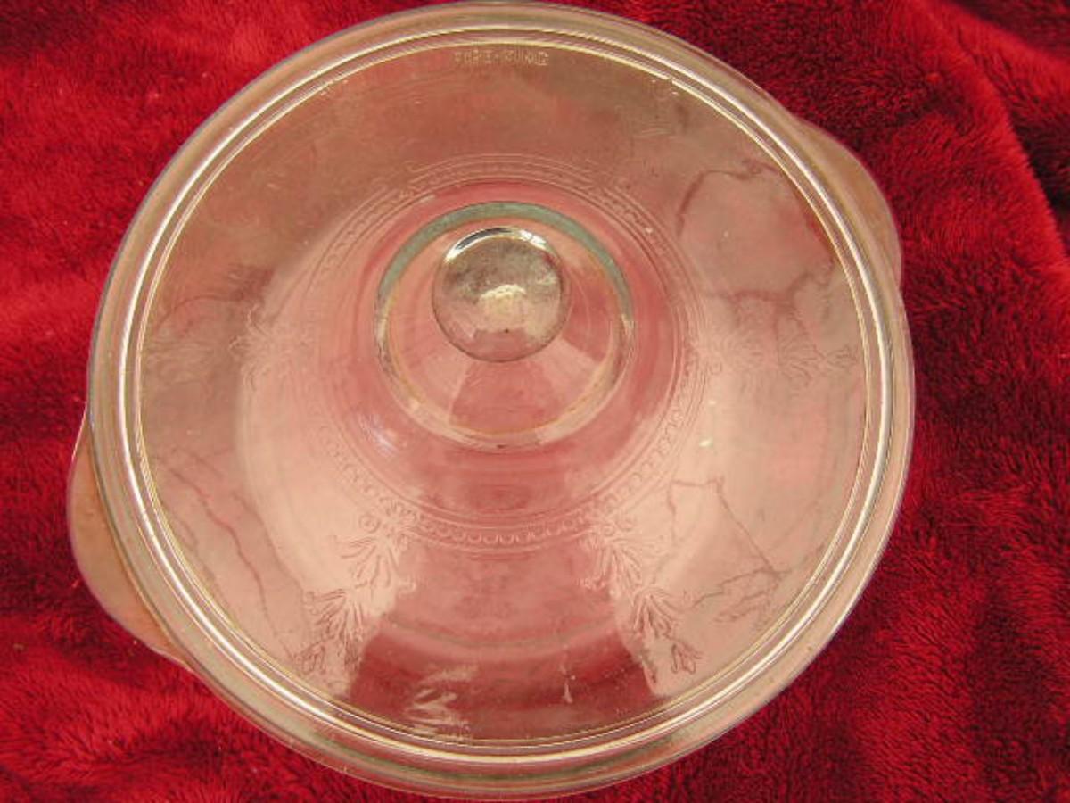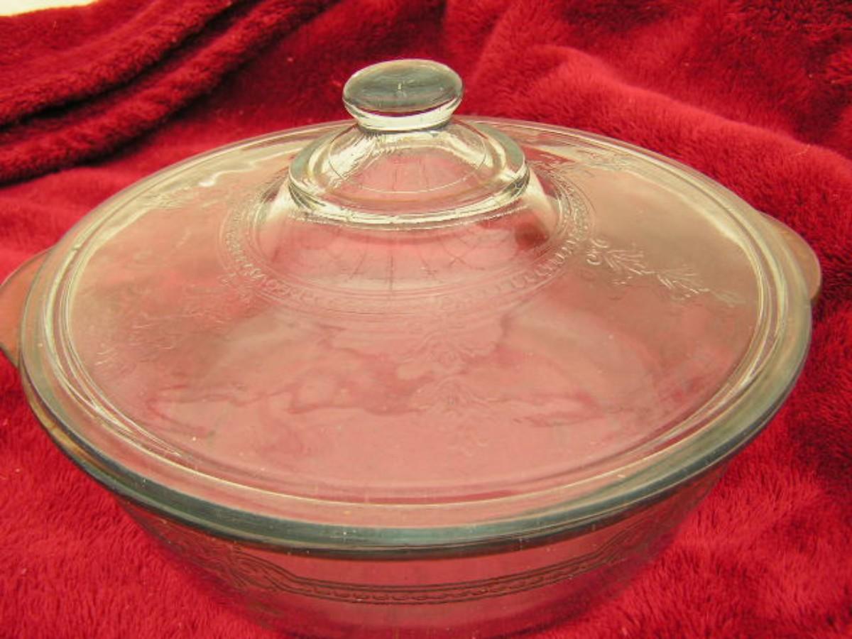 Vintage Anchor Hocking “Fire King” clear glass ovenware casserole w/ lifting ears & lid. Decorative patterns all over dish and lid are hard to see in photos. Labeled “FIRE KING” on lid. About 9" diameter x 3-1/4" deep w/o lid. VG or better.