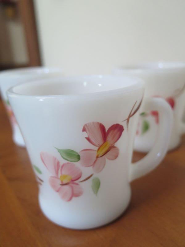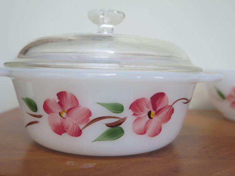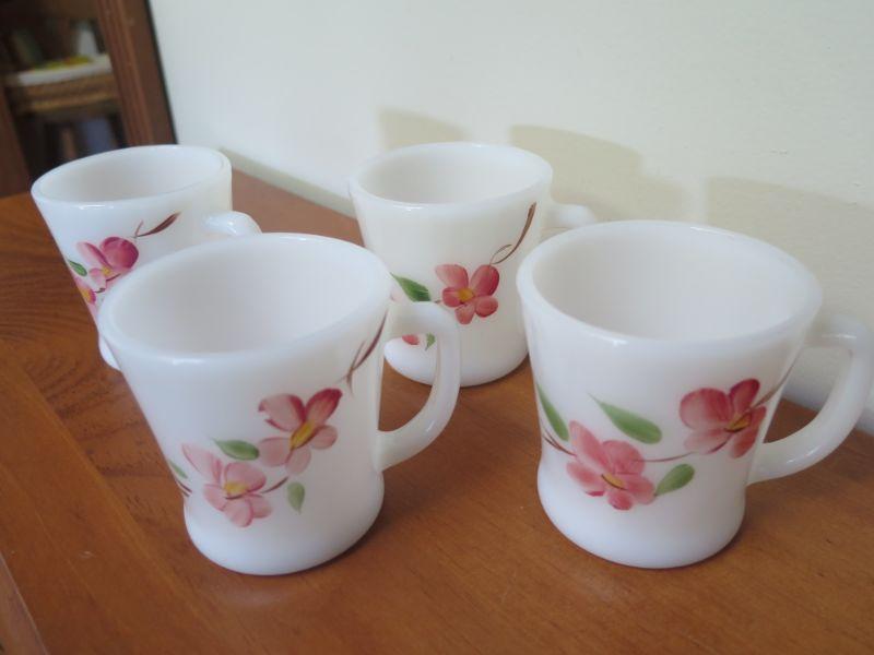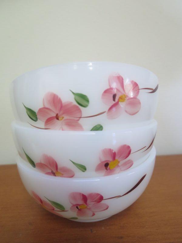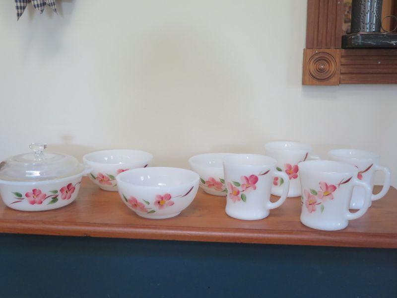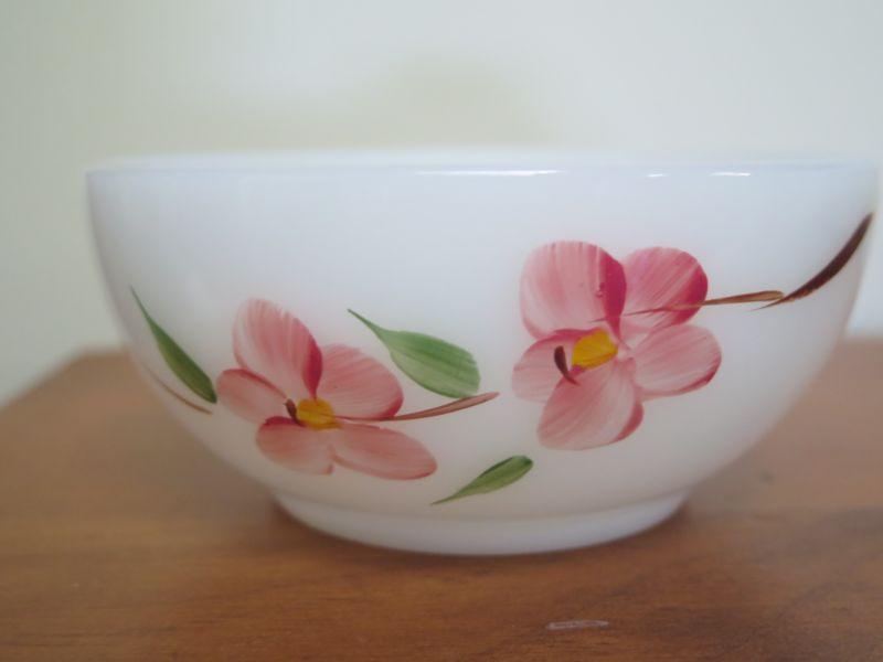 Vintage Anchor Hocking Fire King- Milk Glass and Pink Dogwood Flowers