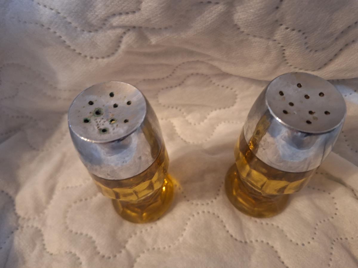 vintage Anchor Hocking Georgian amber glass salt and pepper shakers.