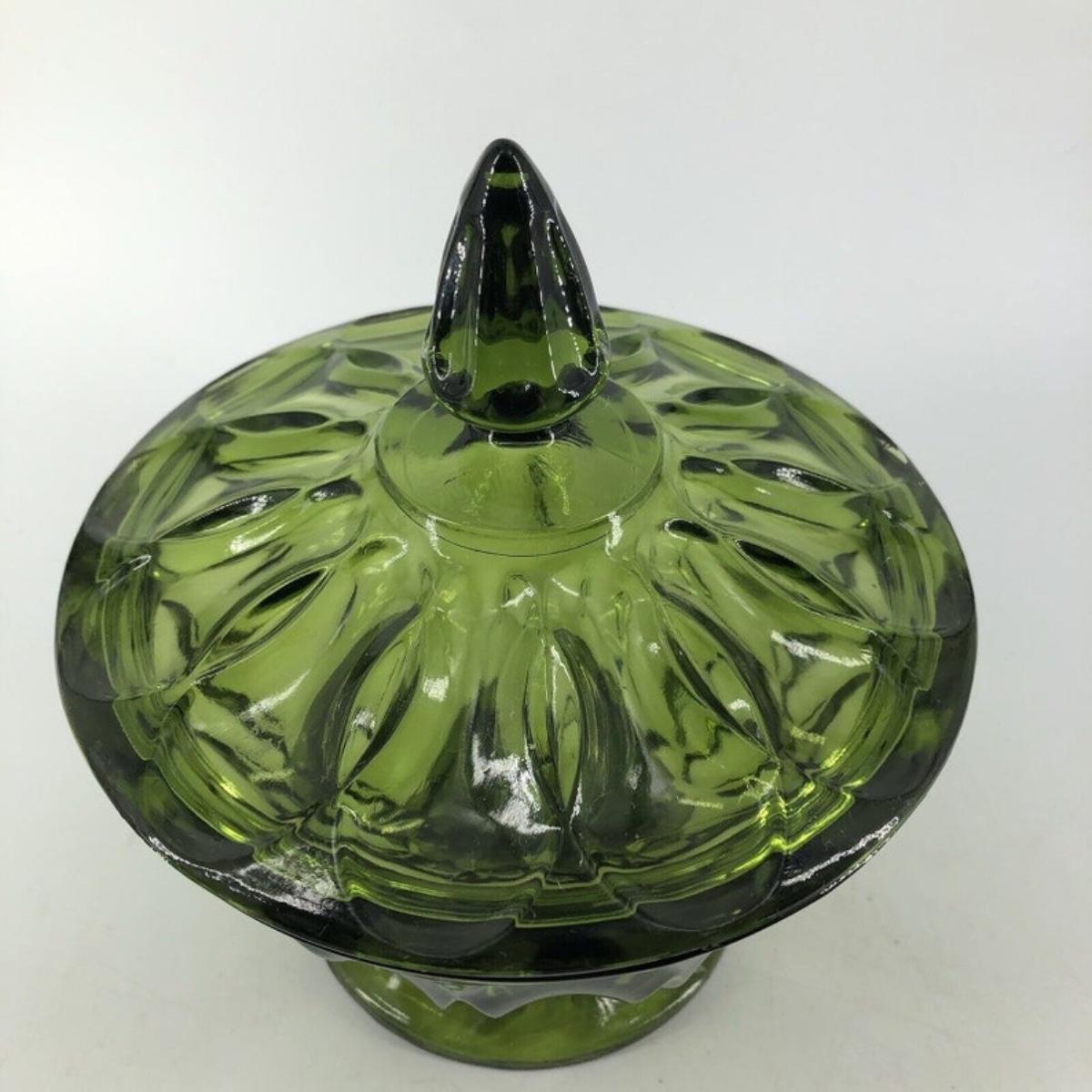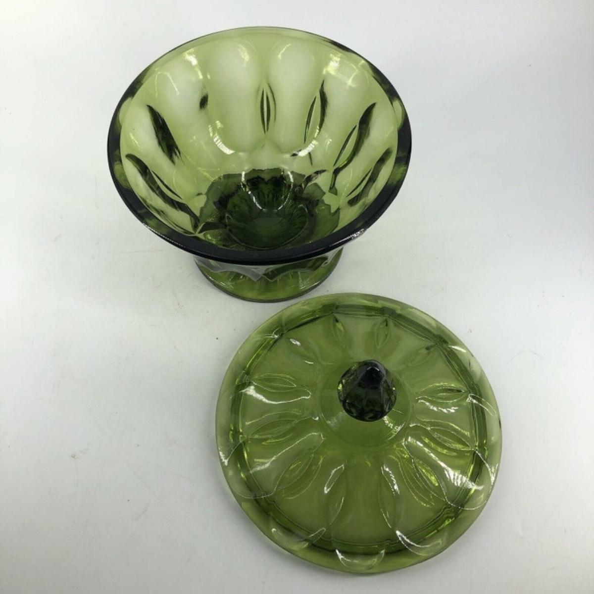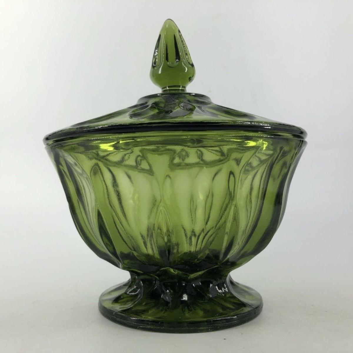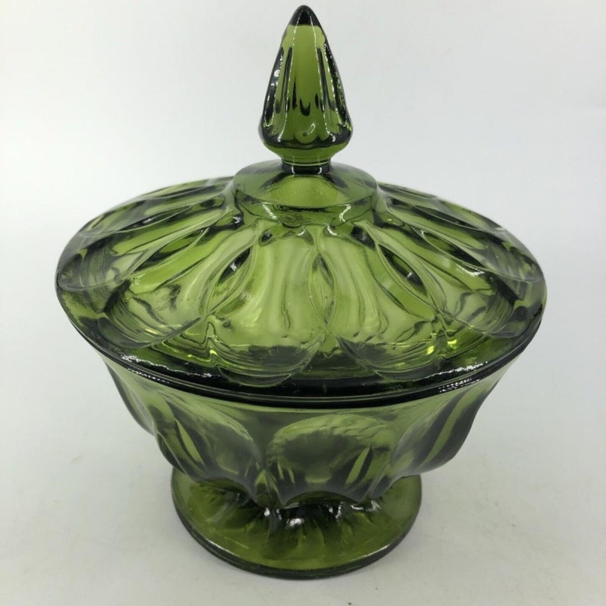 Vintage anchor hocking glass candy dish with lid. Avocado green 6.5 inches tall very very beautiful.