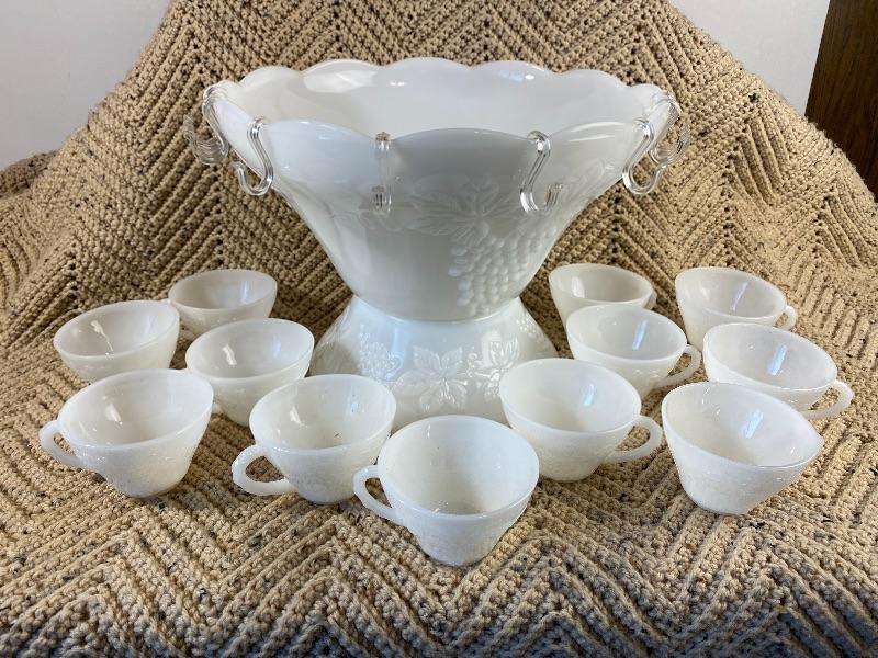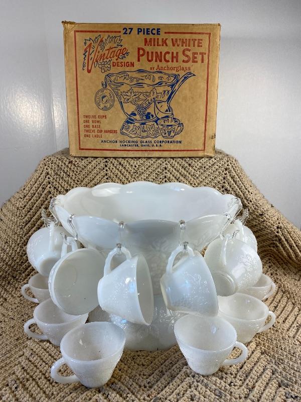 Vintage Anchor Hocking Milk Glass Punch Bowl & Cups