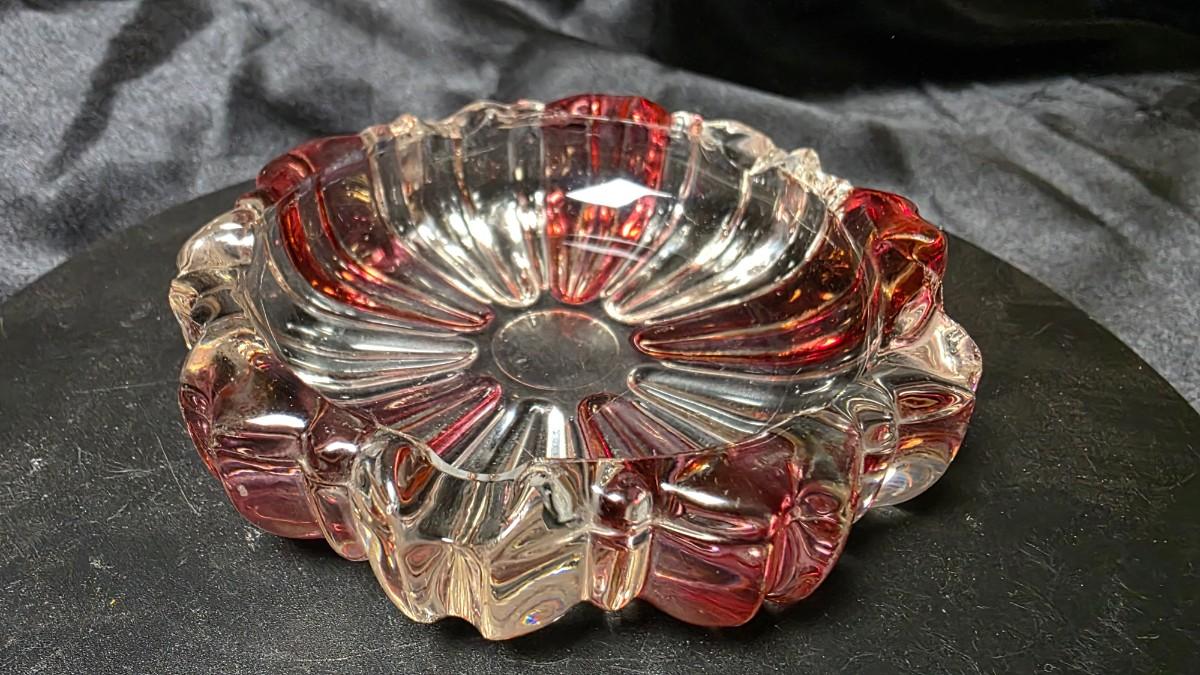 Vintage Anchor Hocking “Old Cafe” Cranberry & Clear Striped Glass Ashtray | Mid-Century Modern