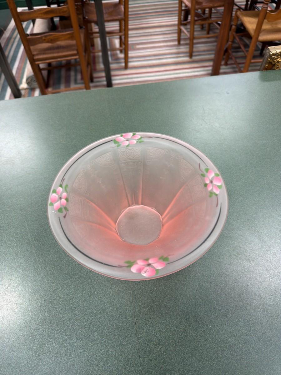 Vintage Anchor Hocking Princess Pattern Pink Satin Depression Glass Hat Bowl. Reverse Painted Pink Flowers on the Rim. Approximately 9.5" Wide