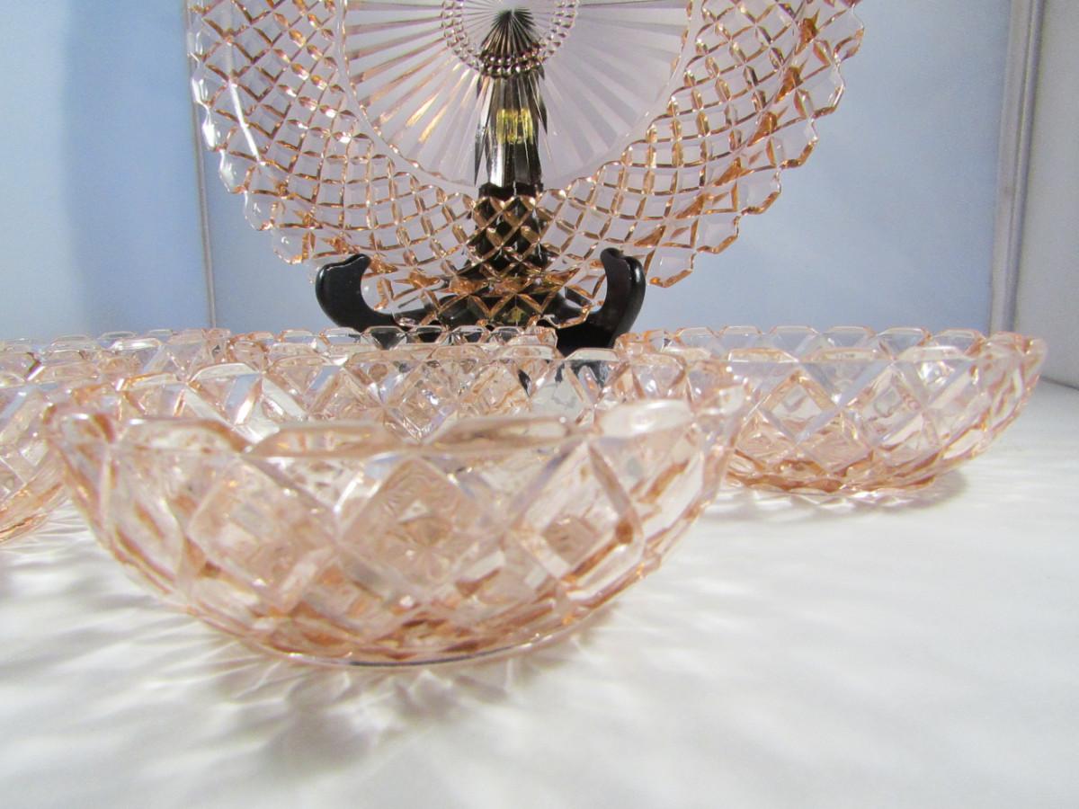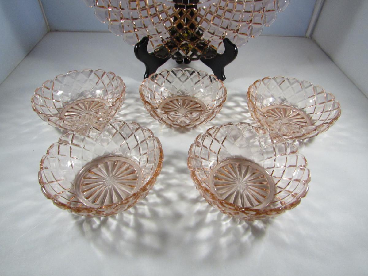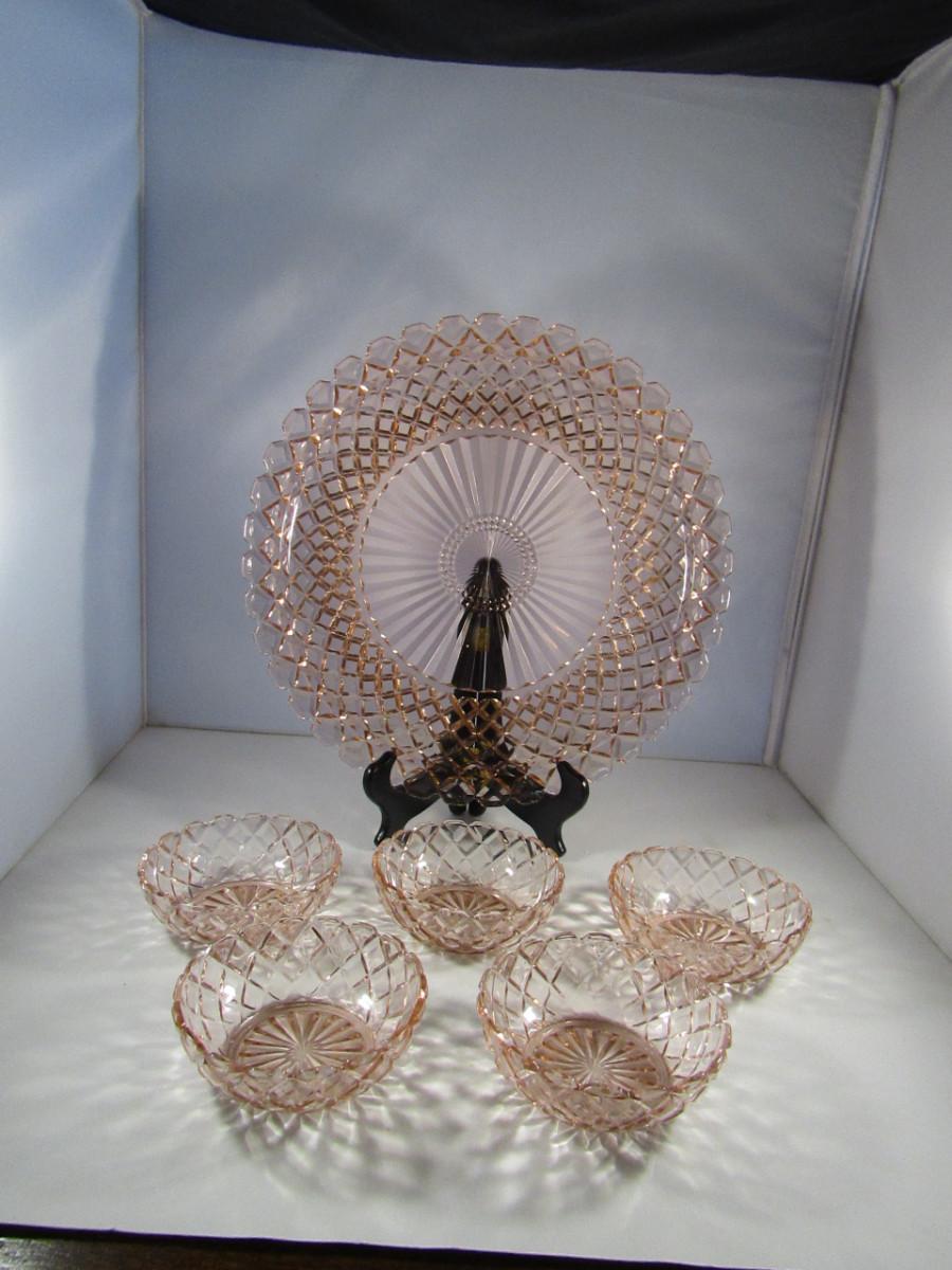 Vintage Anchor Hocking Waterford Waffle Pattern Pink Depression Glass Platter and Five Bowls