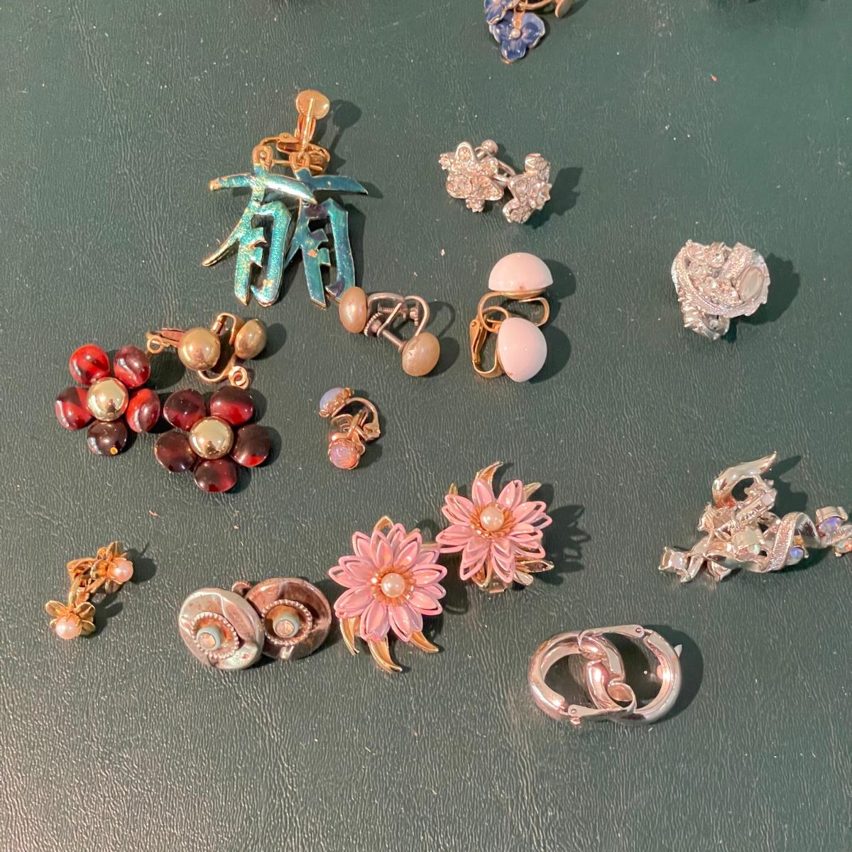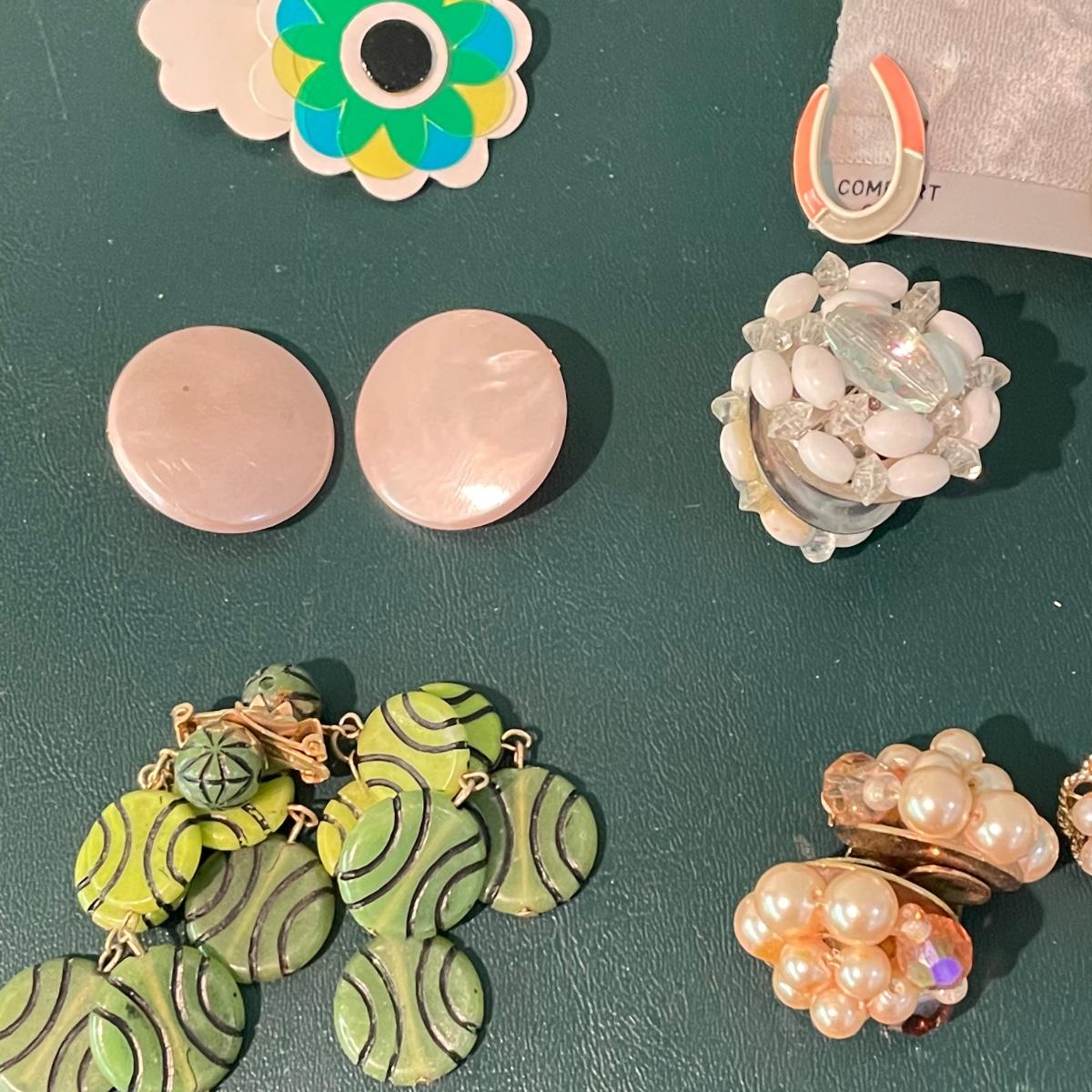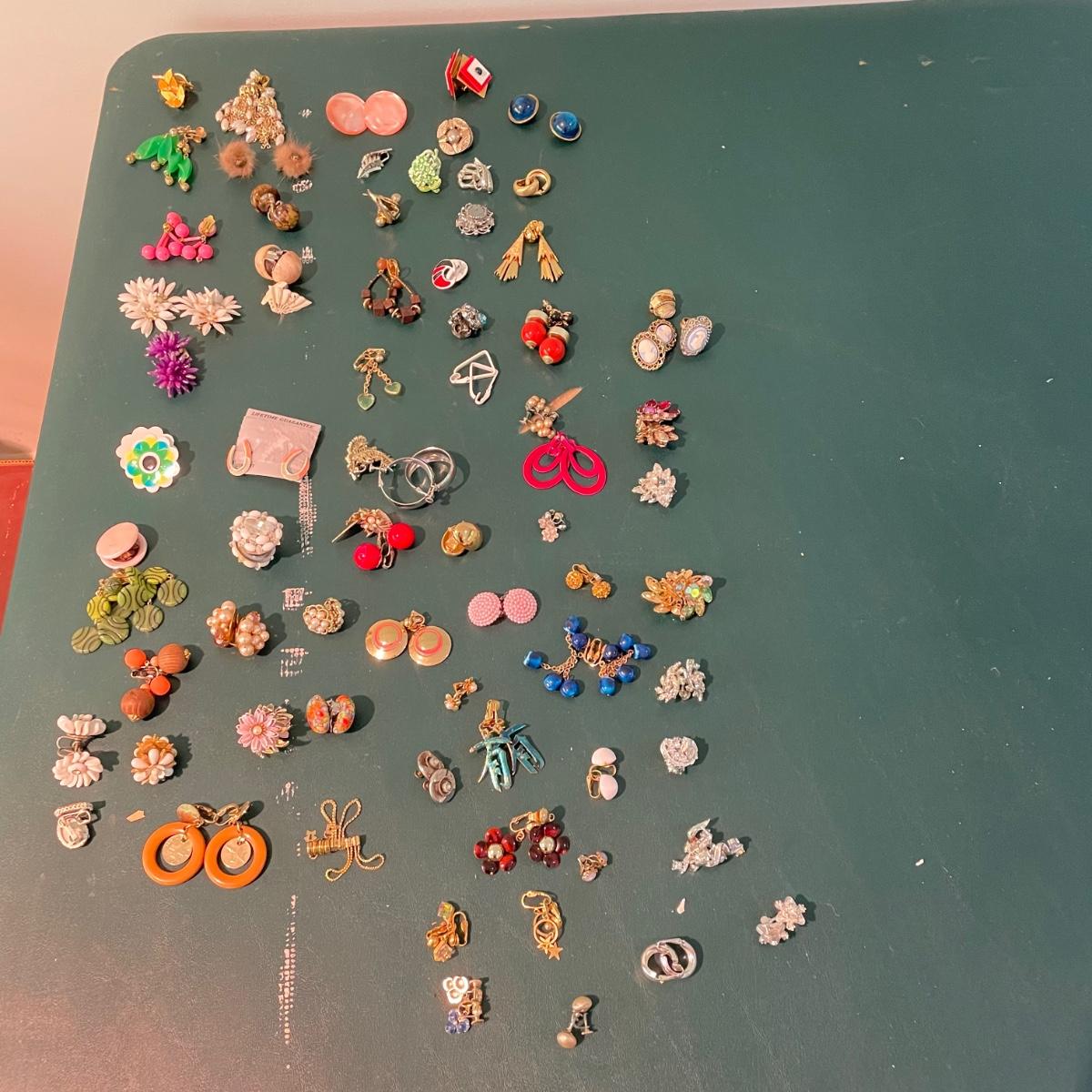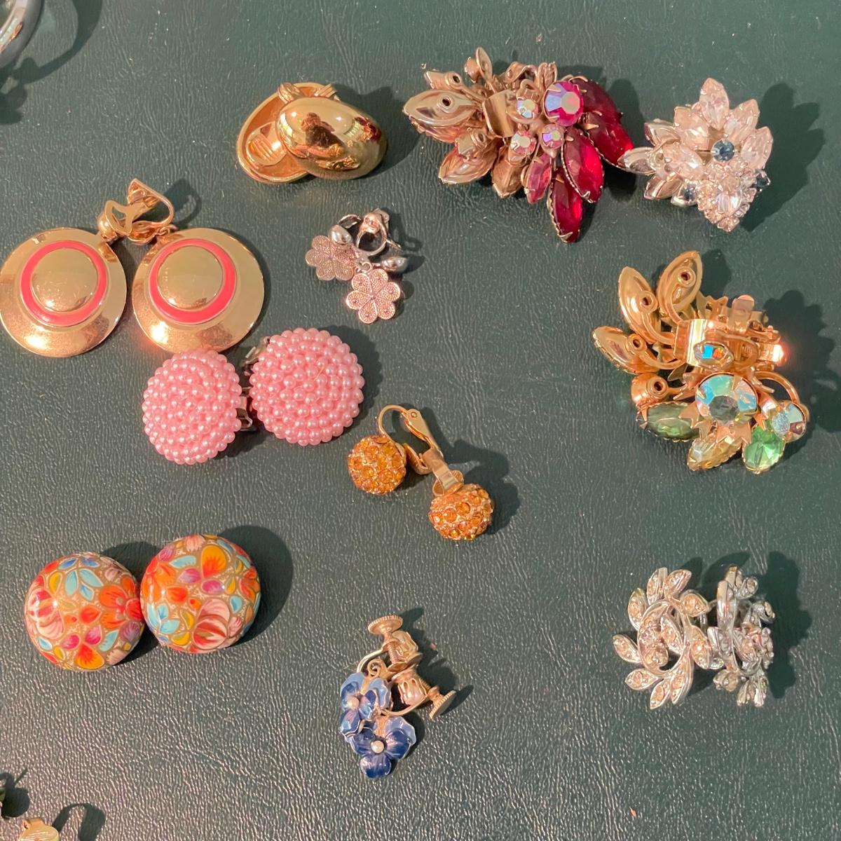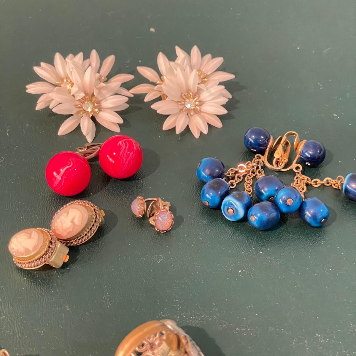Over fifty pairs of vintage and newer clip earrings. Many are traditional costume jewelry, but others are smaller and more modern. Lot includes two sets of cameos and one adjustable ring, plus a pink pair of clip earrings that is very iridescent like an opal. Lot includes three pairs of gold colored magnetic dangle earrings. See images. Shipping available.