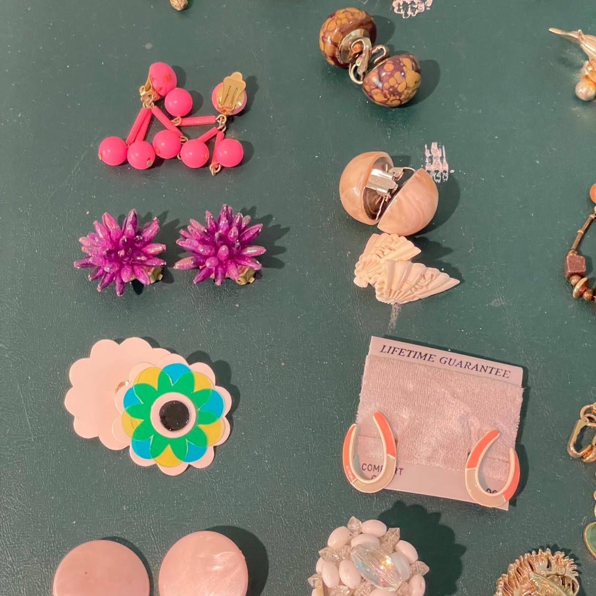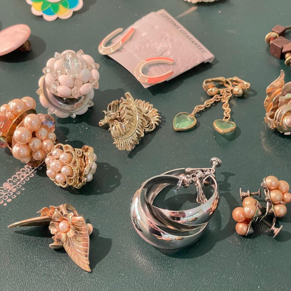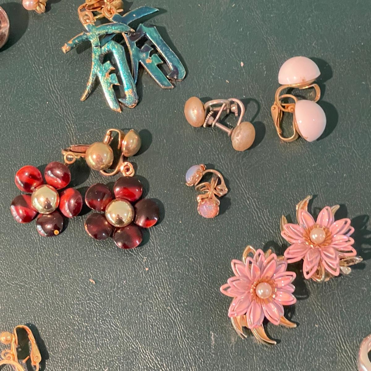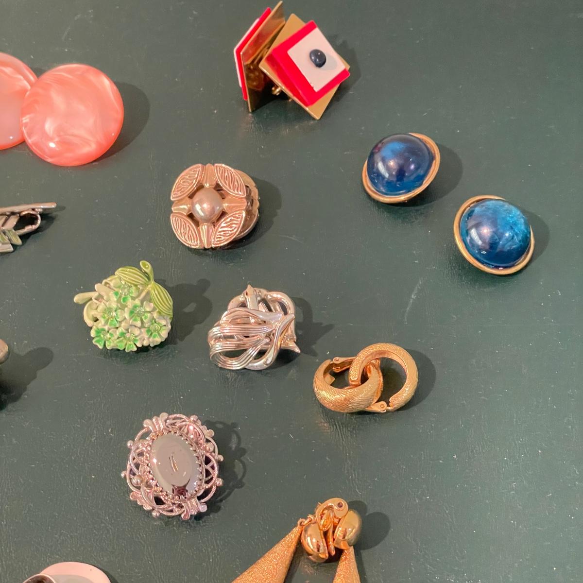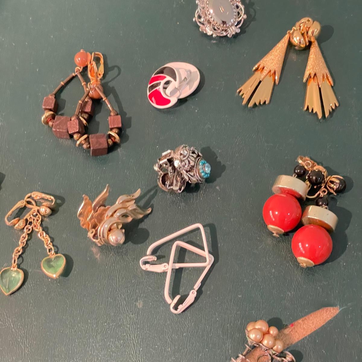 Over fifty pairs of vintage and newer clip earrings. Many are traditional costume jewelry, but others are smaller and more modern. Lot includes two sets of cameos and one adjustable ring, plus a pink pair of clip earrings that is very iridescent like an opal. Lot includes three pairs of gold colored magnetic dangle earrings. See images. Shipping available.