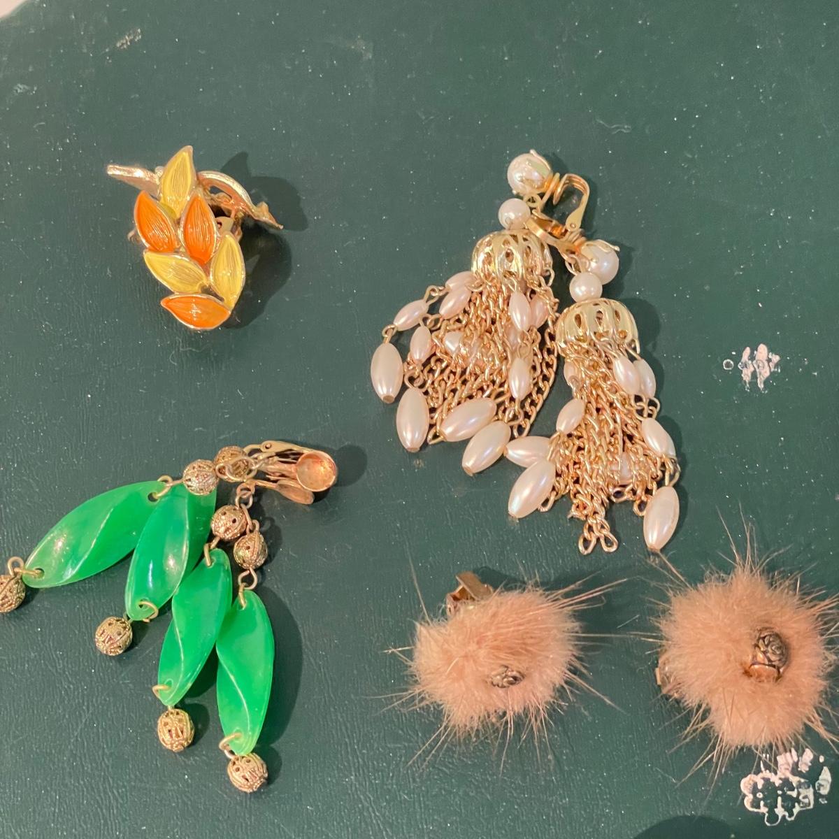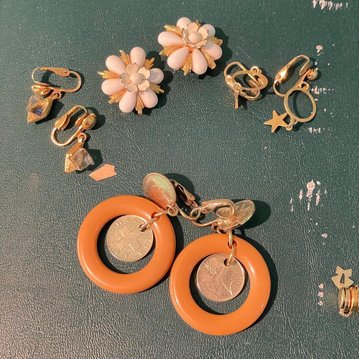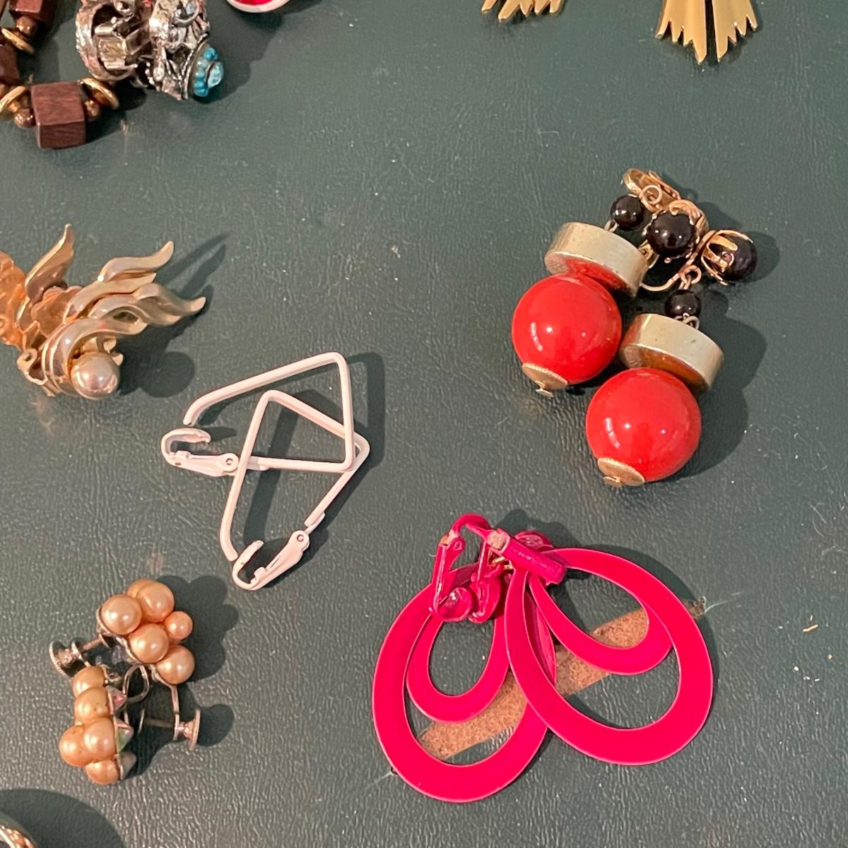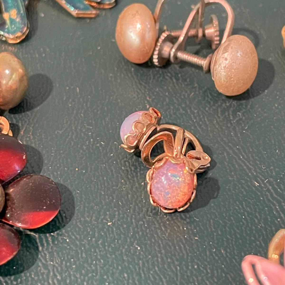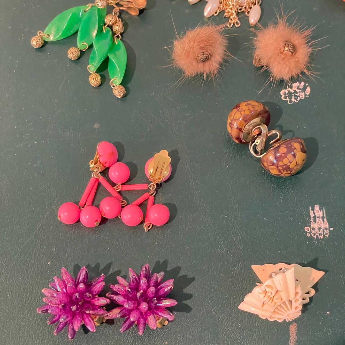 Over fifty pairs of vintage and newer clip earrings. Many are traditional costume jewelry, but others are smaller and more modern. Lot includes two sets of cameos and one adjustable ring, plus a pink pair of clip earrings that is very iridescent like an opal. Lot includes three pairs of gold colored magnetic dangle earrings. See images. Shipping available.