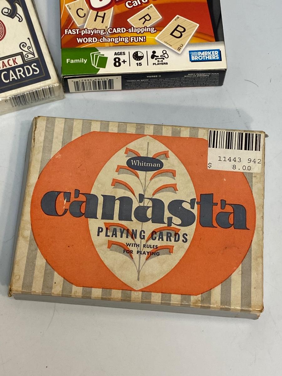 Vintage and Retro Card Games. Go Fish, Pocket Trivia, Canasta, Scrabble Slam, and a regular deck.