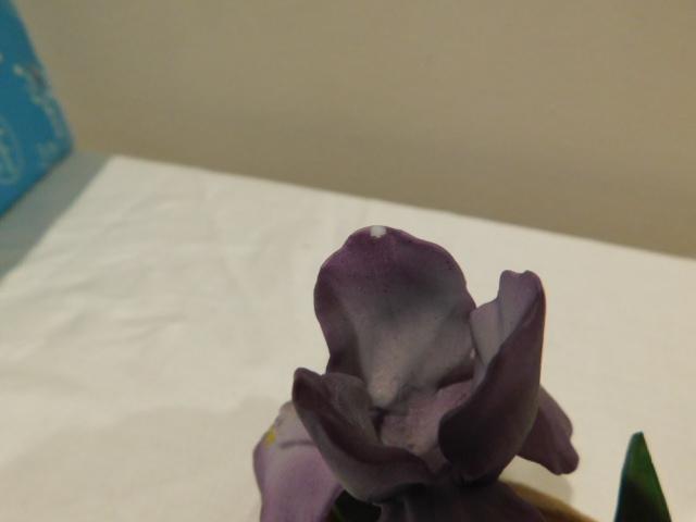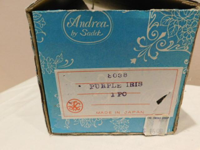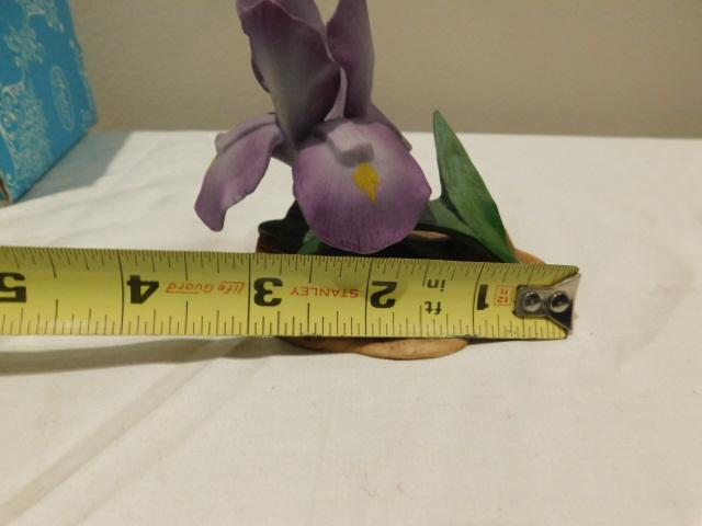 Vintage Andrea by Sadek Purple Iris Porcelain Flower with Box one leaf has factory spot best we can see as shown