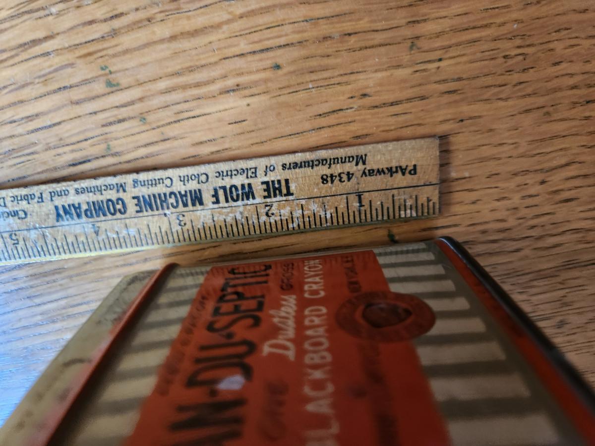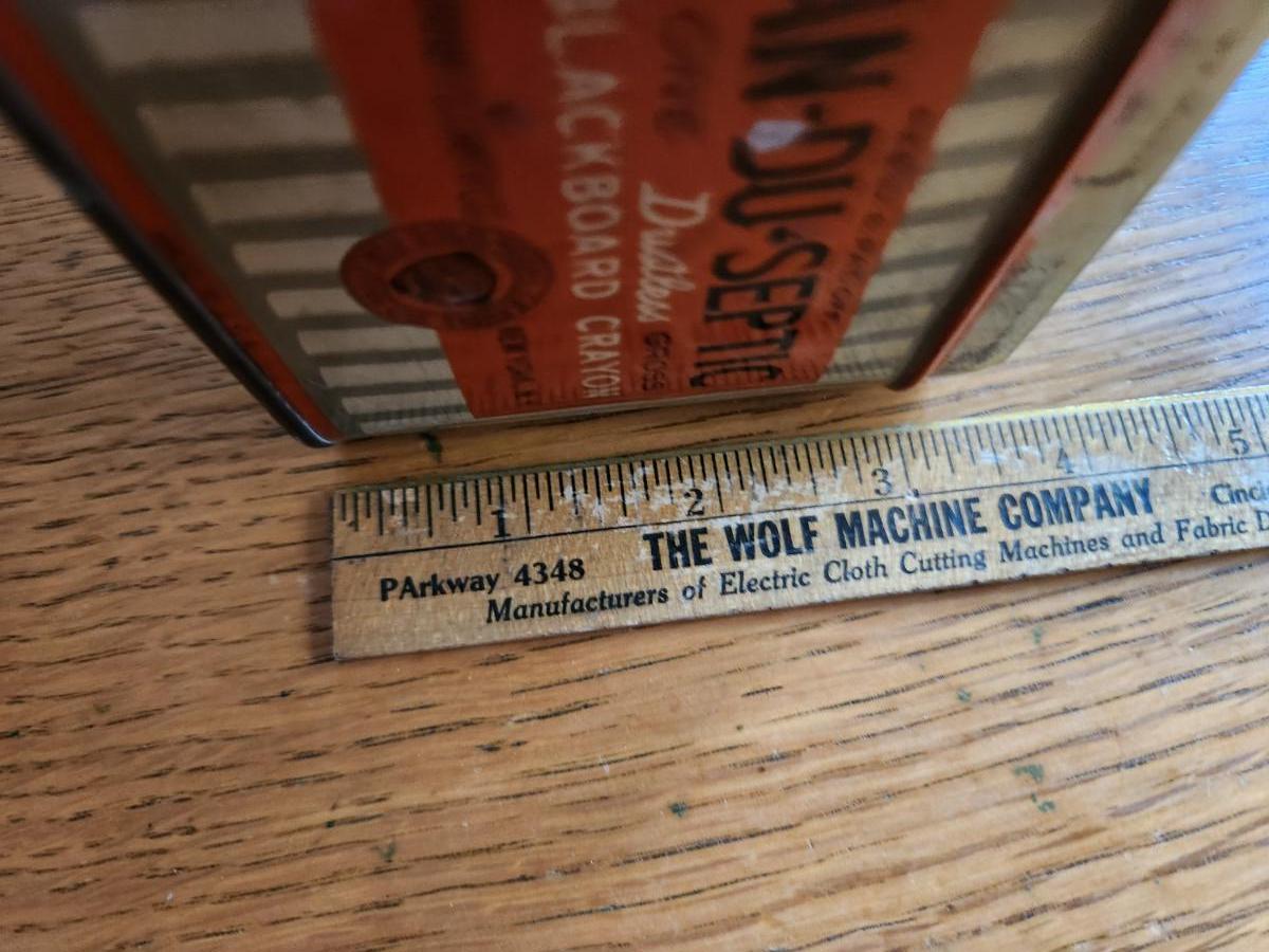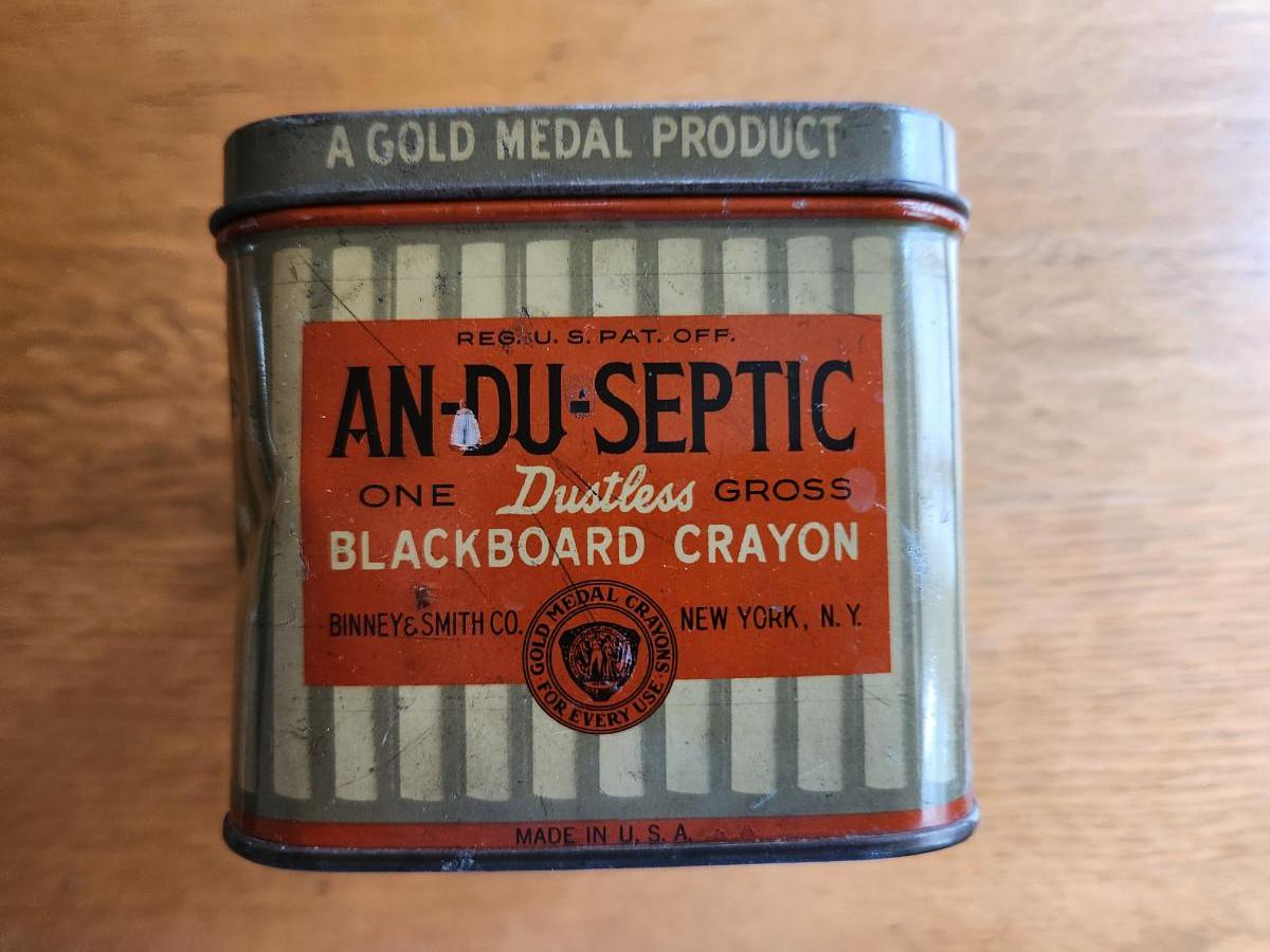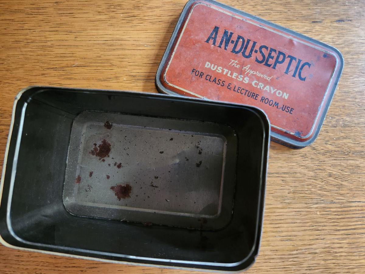 This auction lot is for a Vintage An-du-septic Chaulk Tin. This old tin originally held teacher's chalk - the dustless variety. When your Auctioneer was a mere lad the punishment for bad behavior in class was to stay after school and take the erasers outside and bang them against each other to remove all that dust - hated that task! Great tin for display or use - it has been banged, but that is what makes it an authentic item. See photos for sizing.