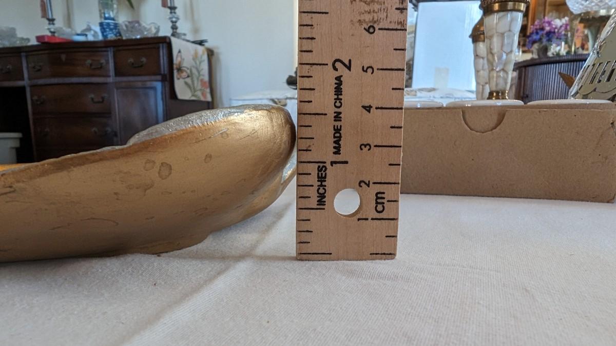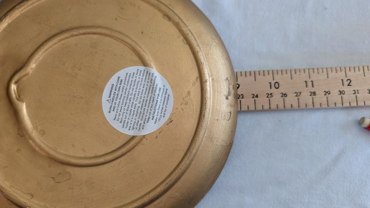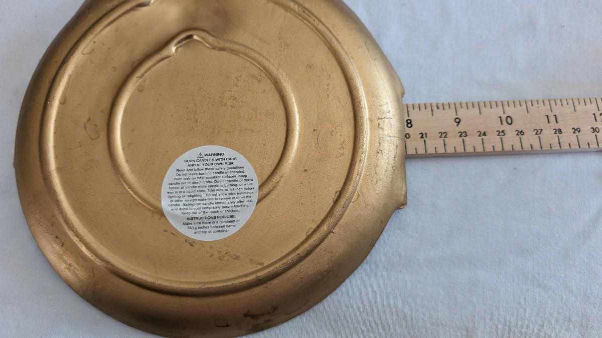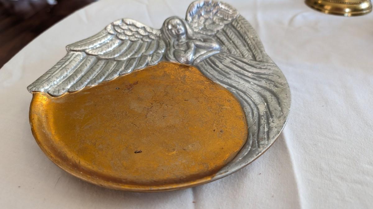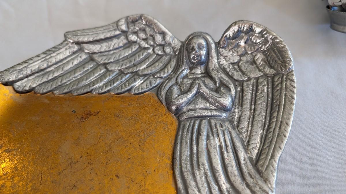 This is a vintage candle display plate painted gold with a decorative angel painted silver. Some discoloration on plate surface.